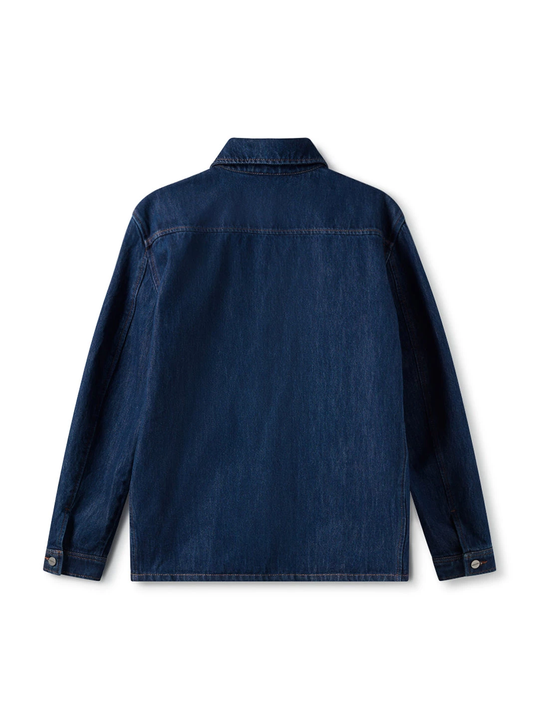 The Alboran, a modern navy blue denim jacket. The rather lightweight fabric is fashioned with matt silver buttons. It falls below the waist with a regular fit and collar. Also features a pocket on the chest and two bigger ones on each bottom side.