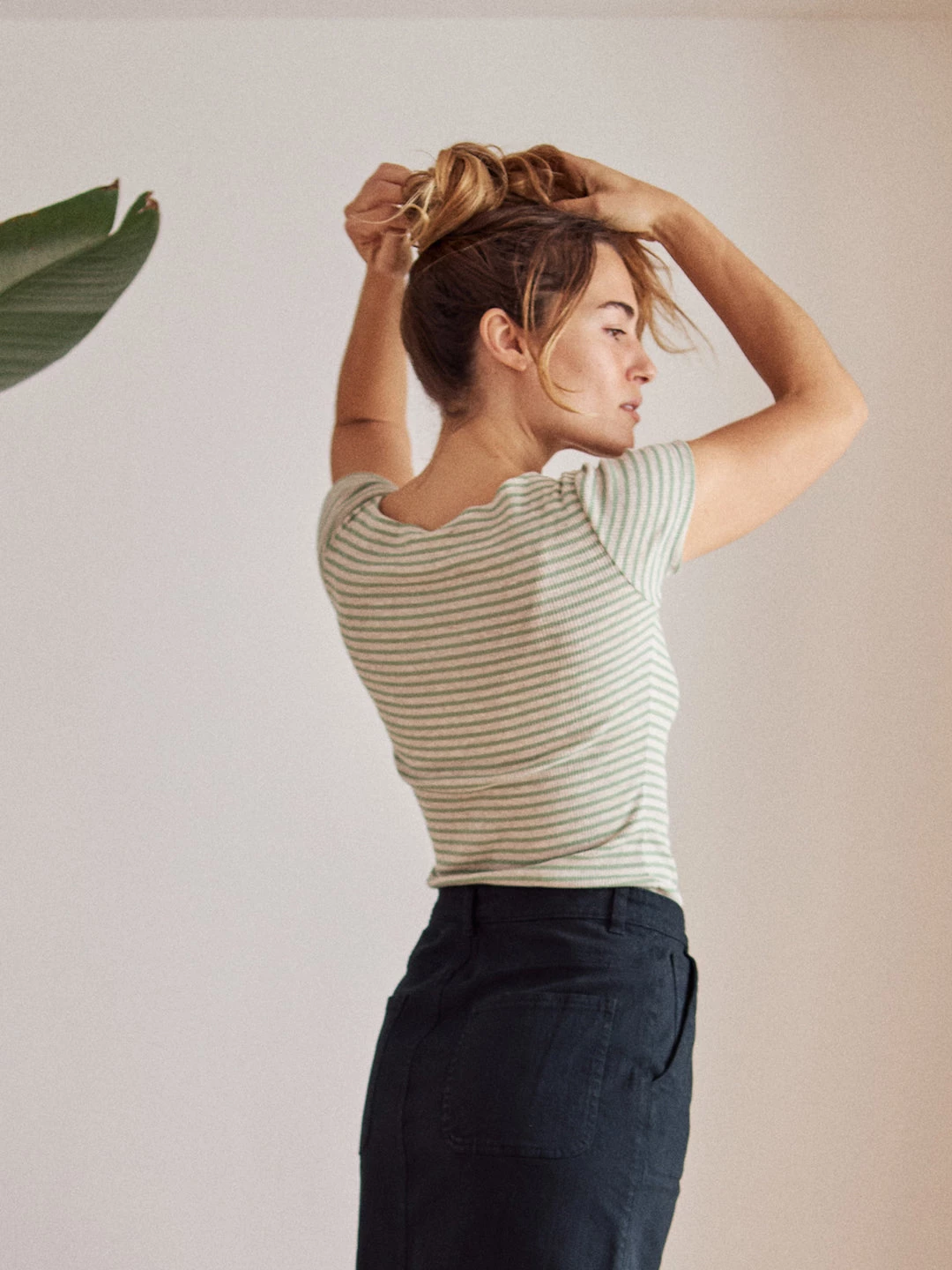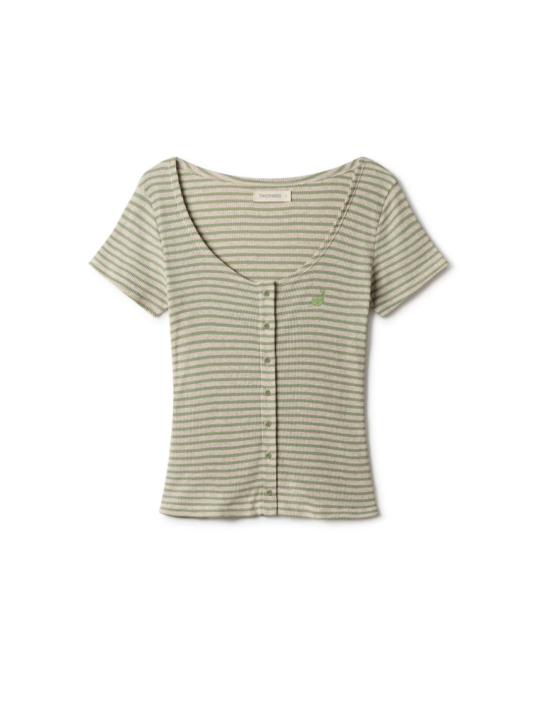 Sustainable fashion at its finest! Made in a completely recycled fabric with naturally sourced corozo buttons. Designed with a rounded open neckline and whale embroidery.Â