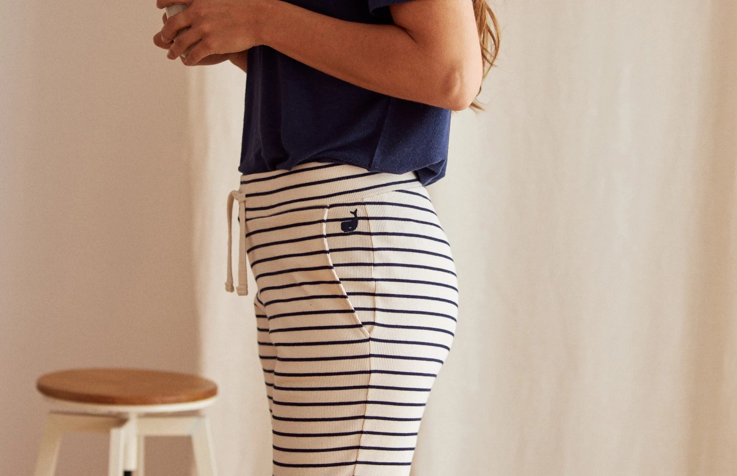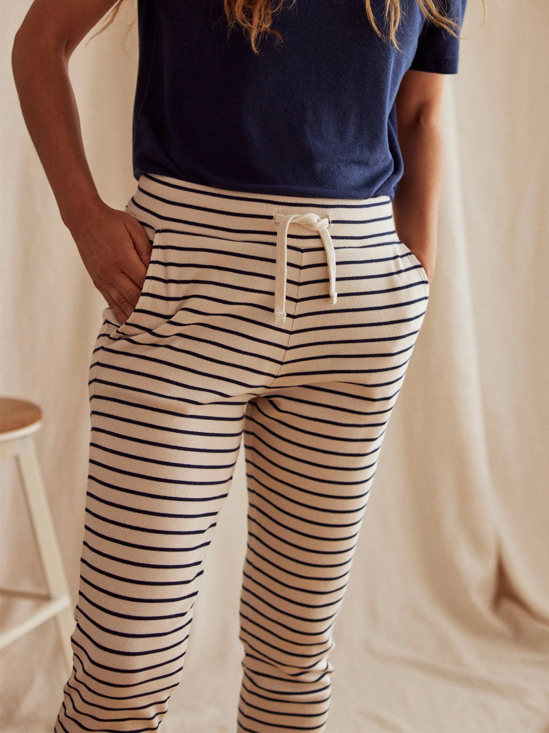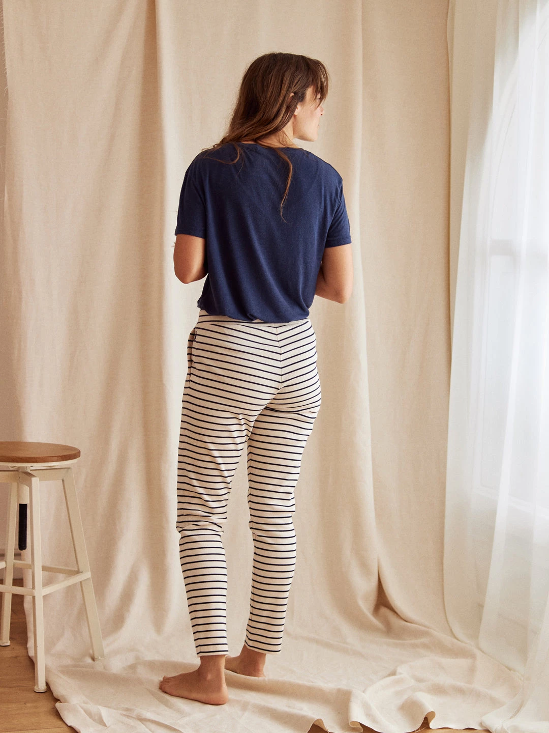 Put a comfy outfit together with a smooth sweatshirt or an oversized tee and the Atash pants. We like pairing it with rather plain tops to blend nicely with the stripes of the garment – In or out, get sustainably comfortable.