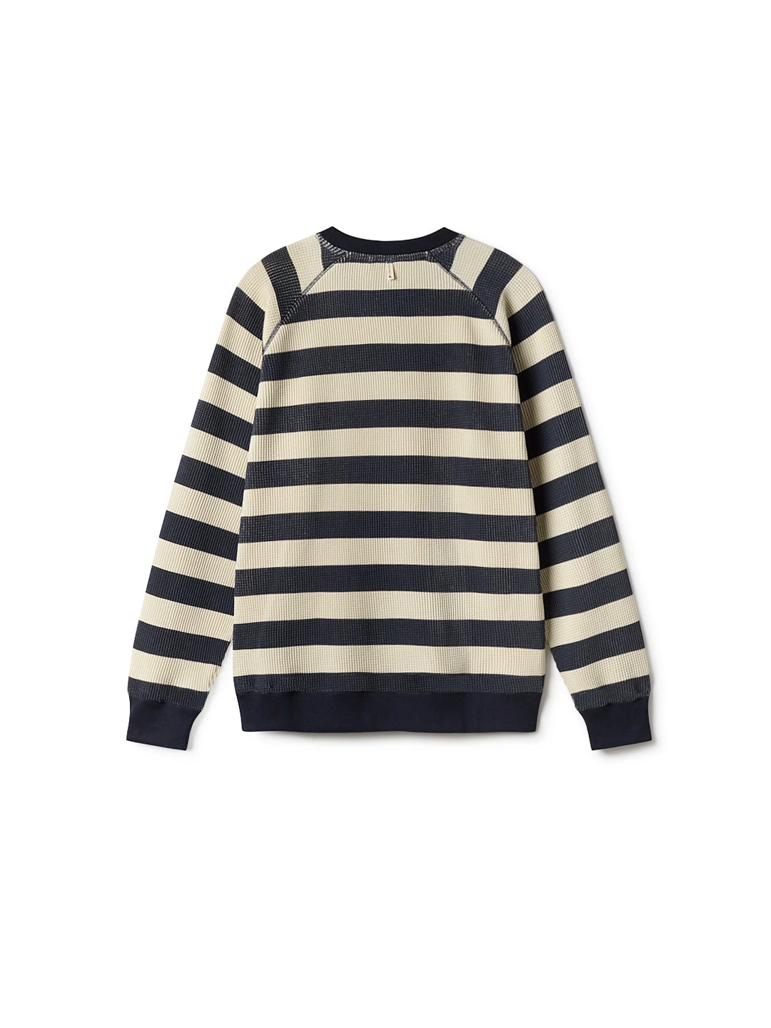 A versatile maritime jumper, the Bawal features printed stripes on a cosy waffle fabric. Made with a ribbed crew neck, plus a comfy ribbed base and cuffs. It comes in a regular fit and cut.