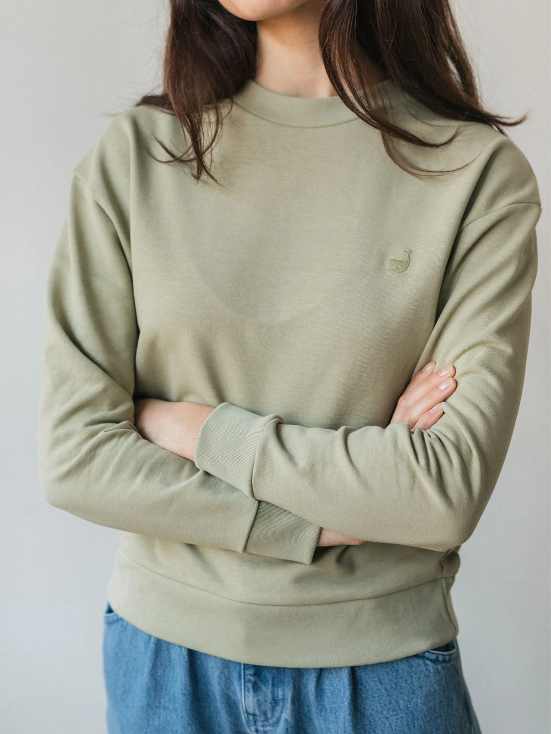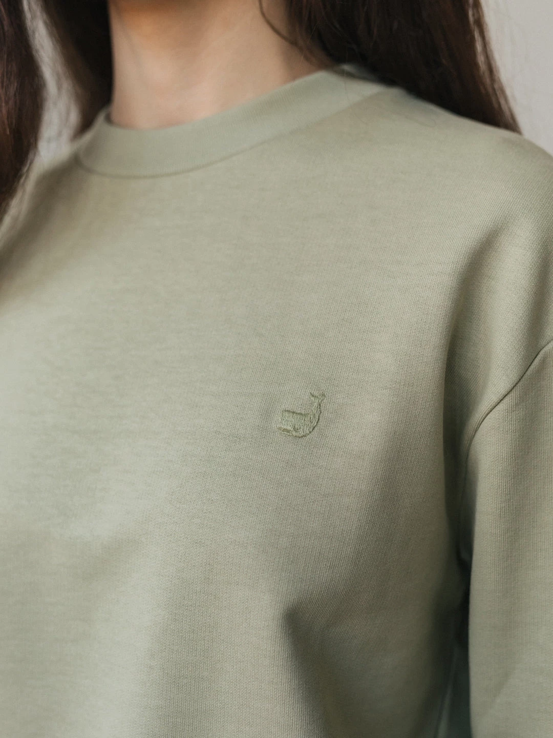 A comfy sweatshirt for your sustainable wardrobe, the Calf. Soft and gentle to the skin, made from an organic and recycled fabric. It comes in a relaxed fit, with dropped shoulders and ribbed edges – featuring whale embroidery on the chest.