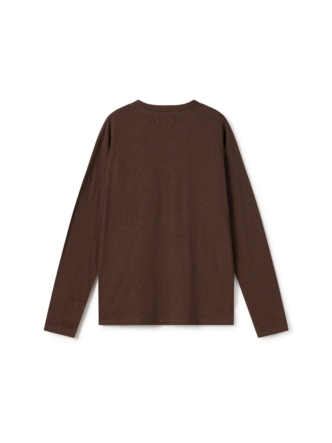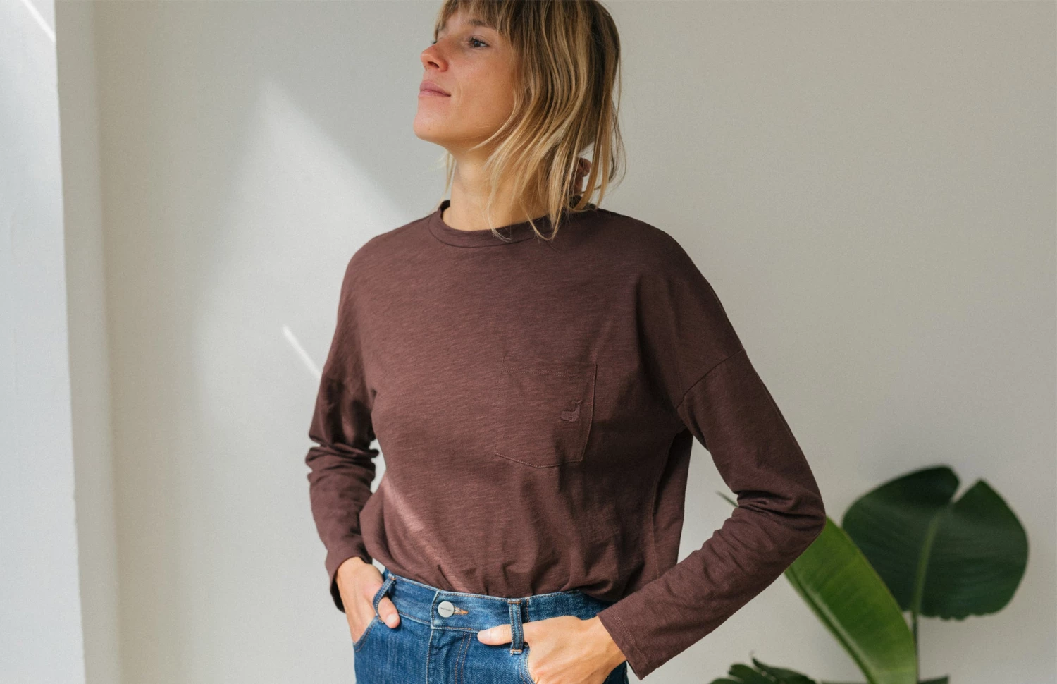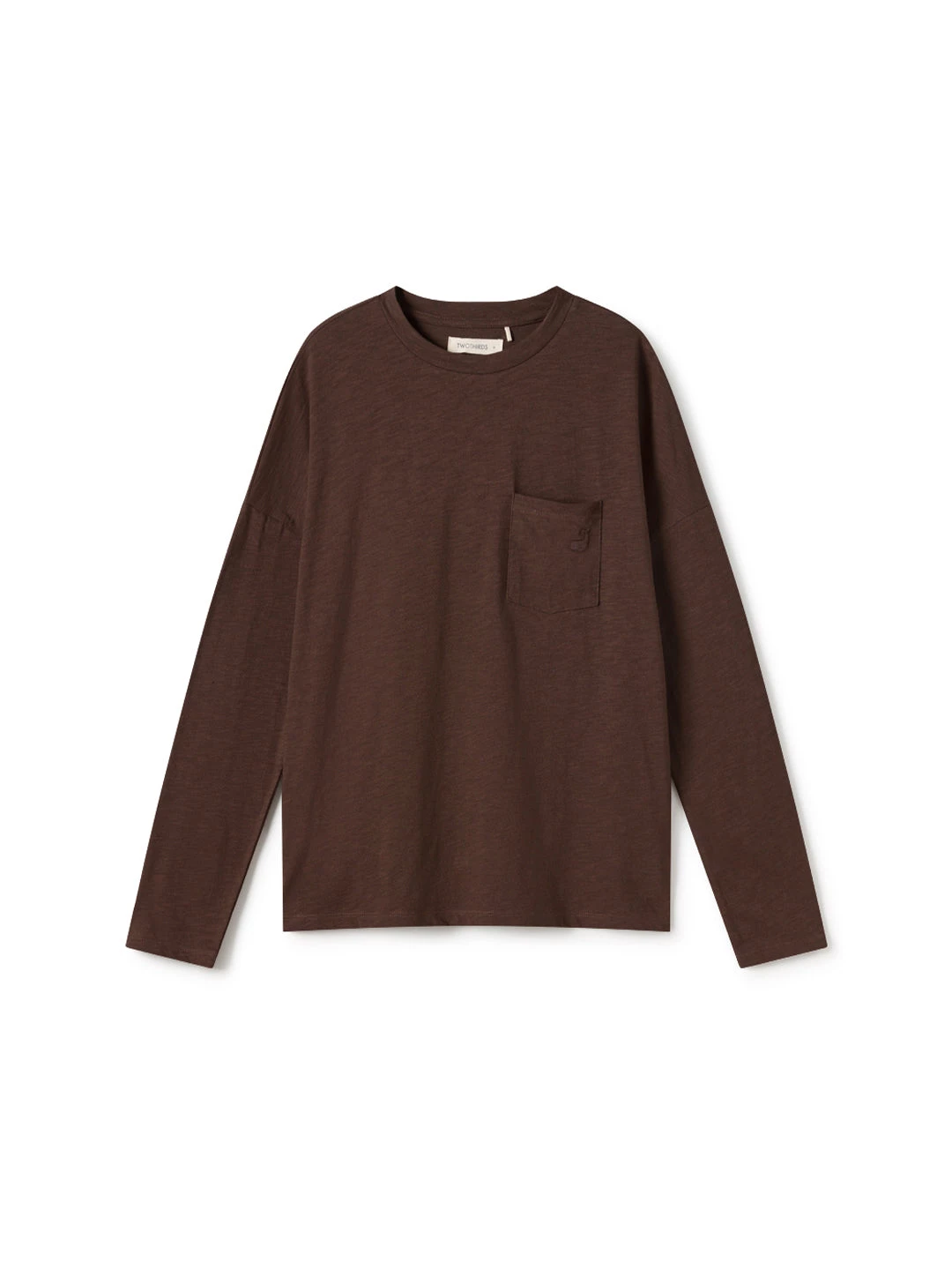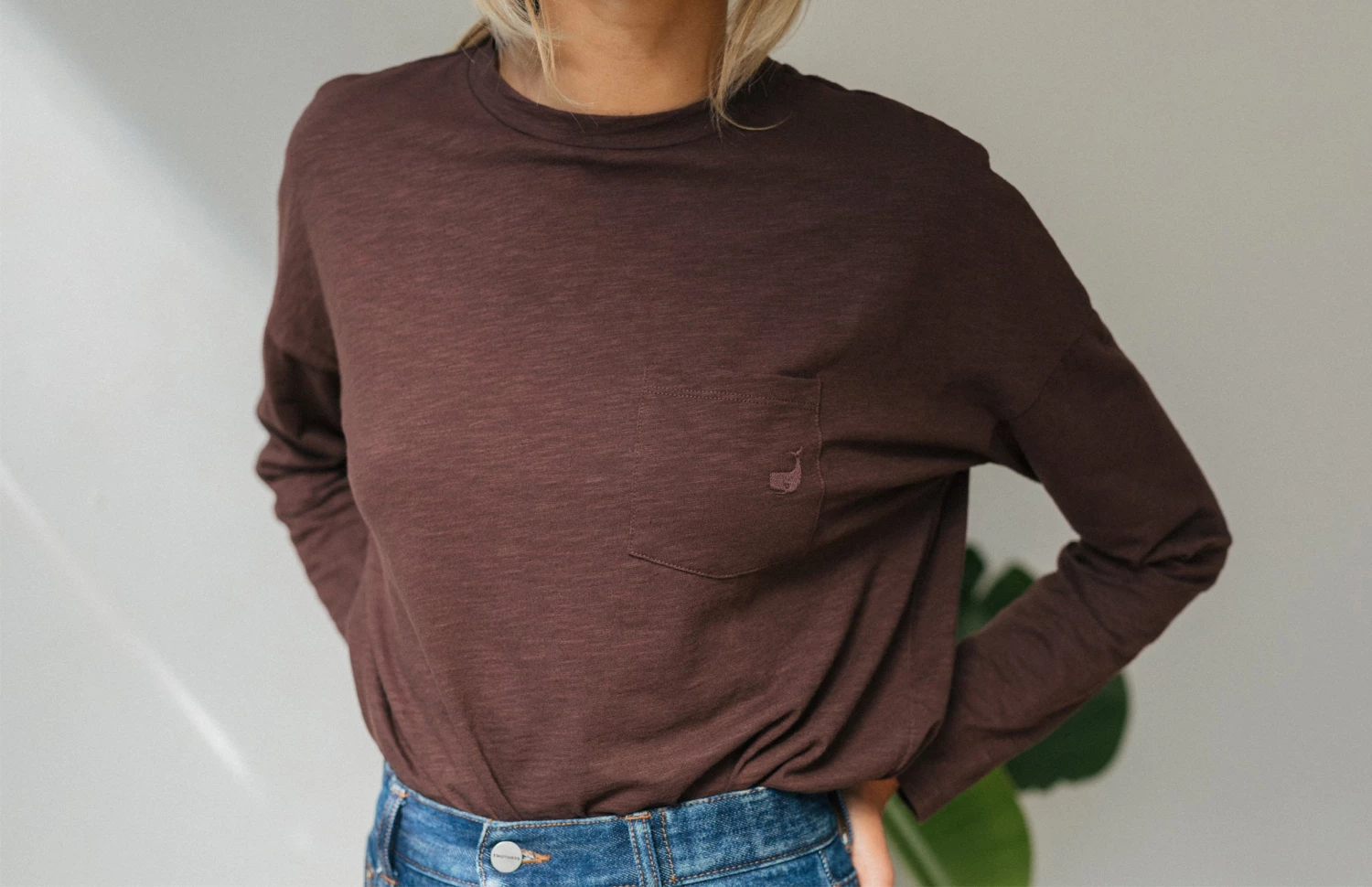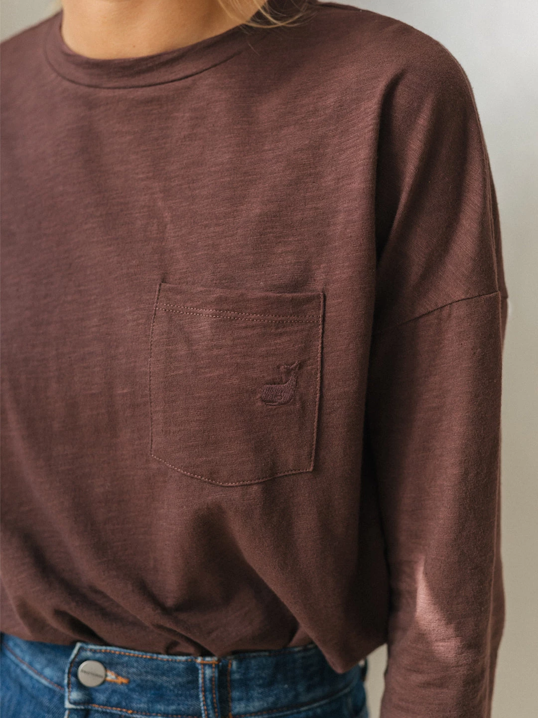 A soft, slub fabric sets the Clarión tee apart, adding variation to its colour to create a beautiful effect. Designed with long sleeves and a pocket on the chest which features whale embroidery. The top has raw edges, a boxy fit and hip-length cut.