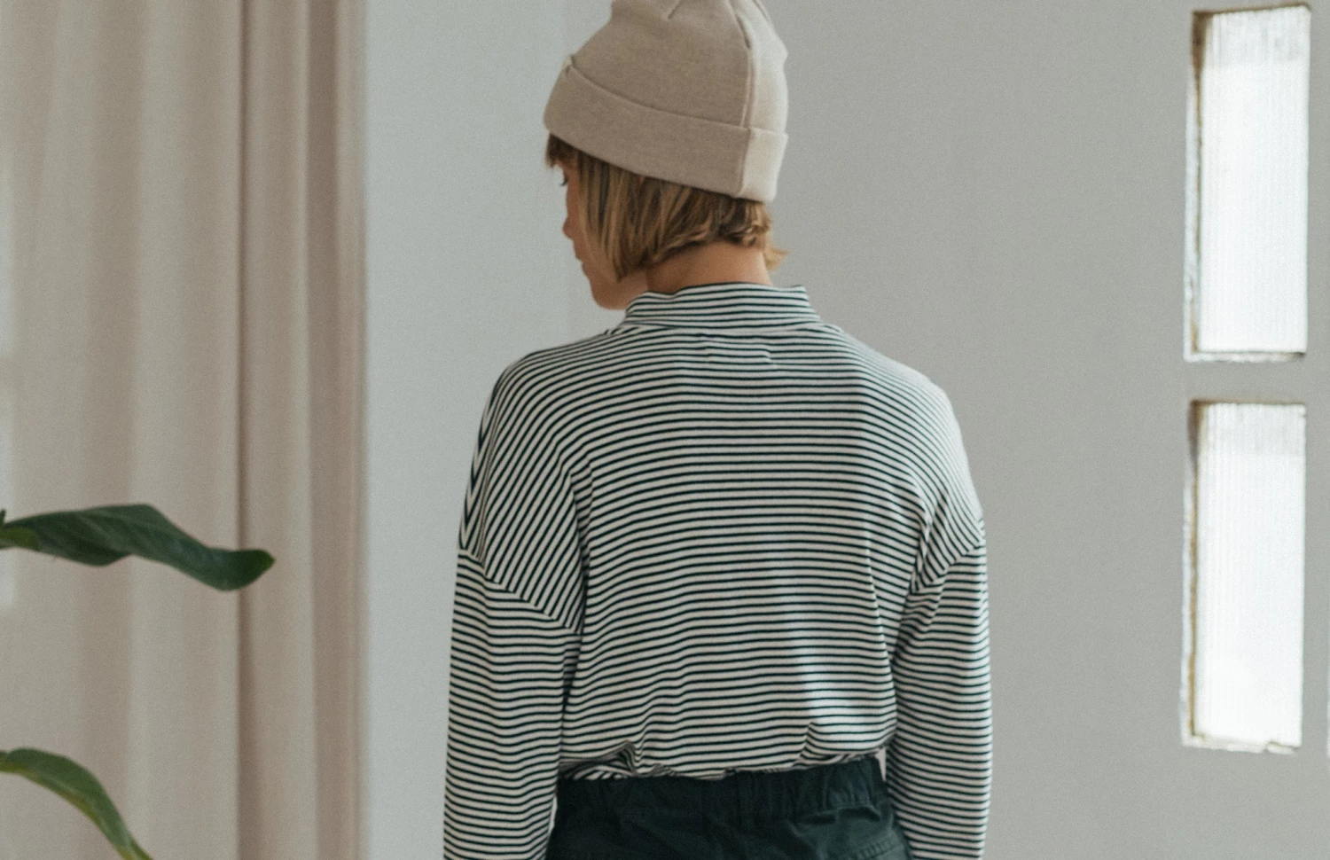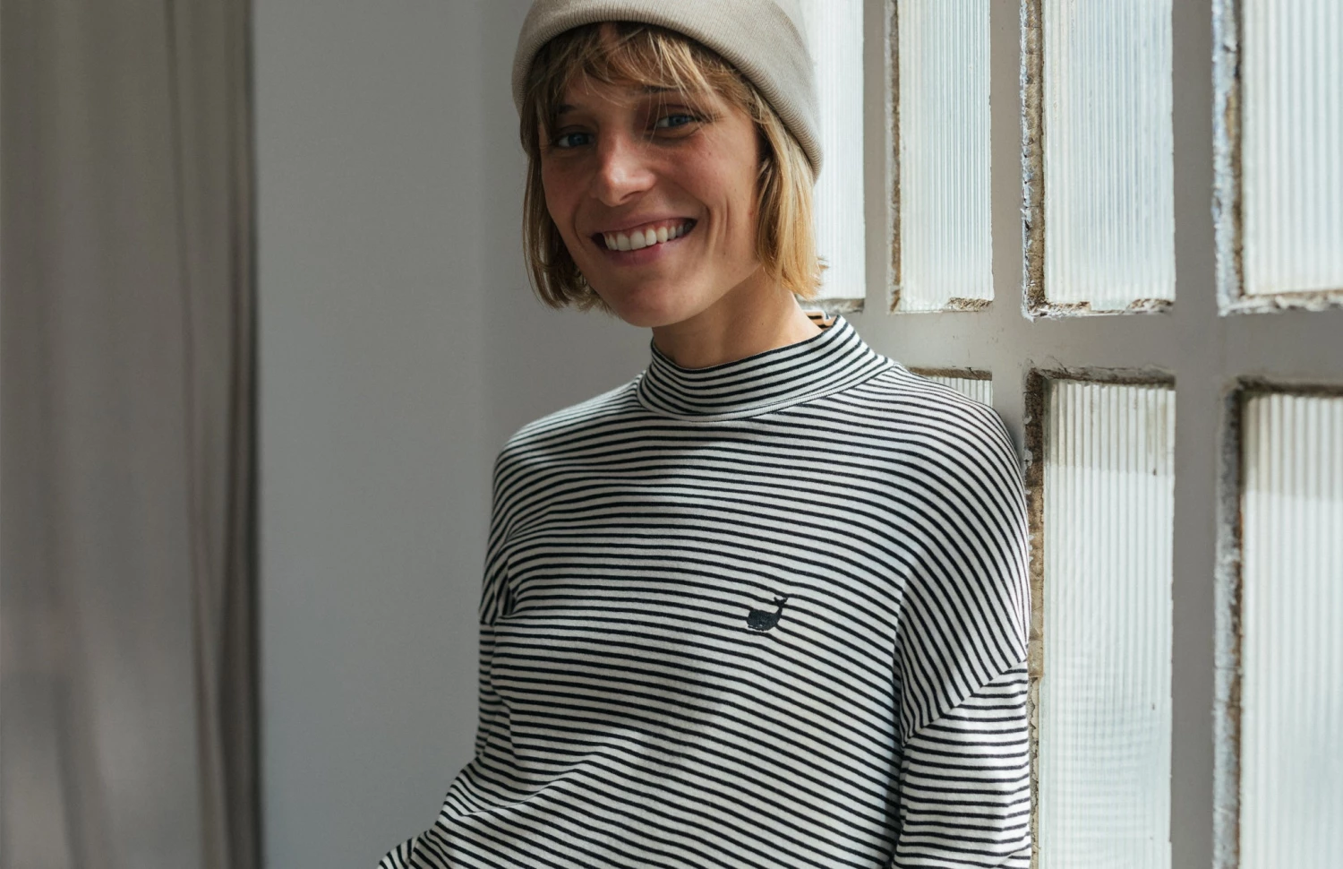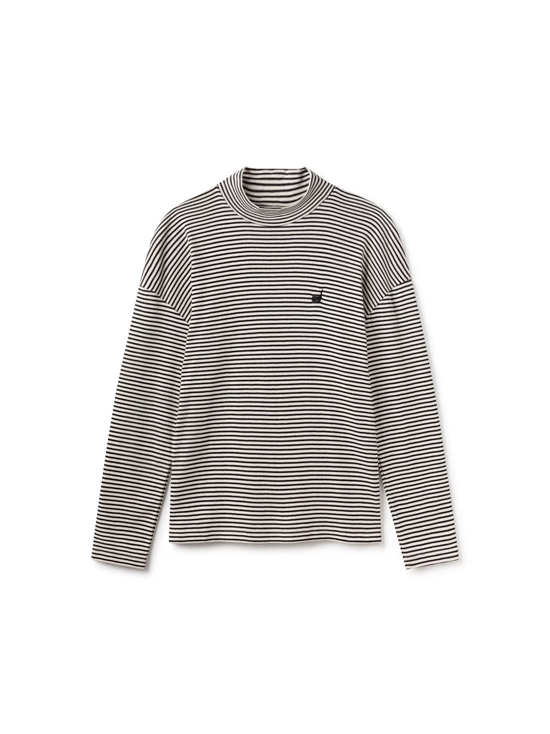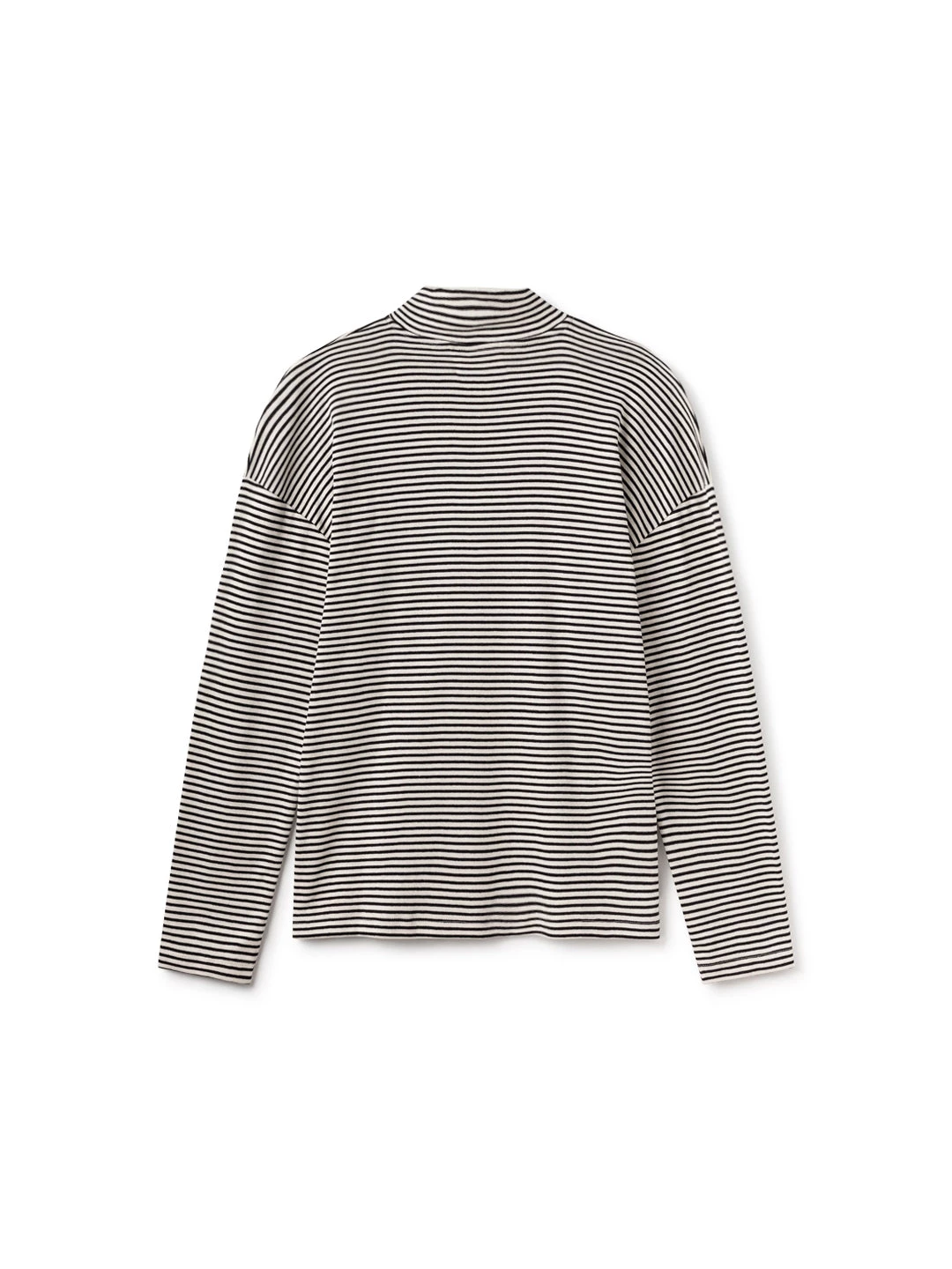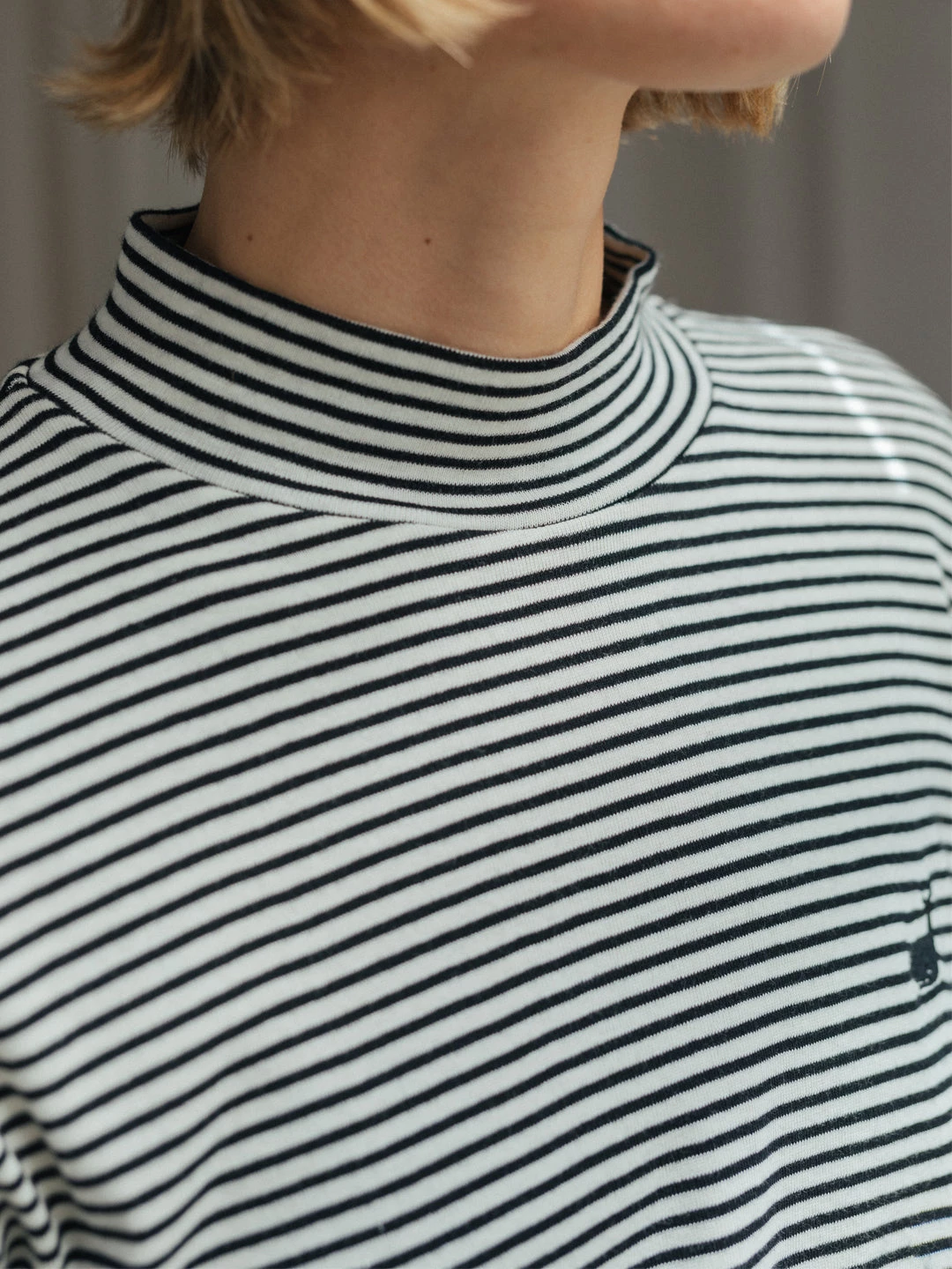 Thin black and white stripes give the Corcovado top a timeless feel. An understated yet soft and sustainable staple. Designed in a fairly oversized fit, dropped sleeves and high neck for a touch of sophistication.Â