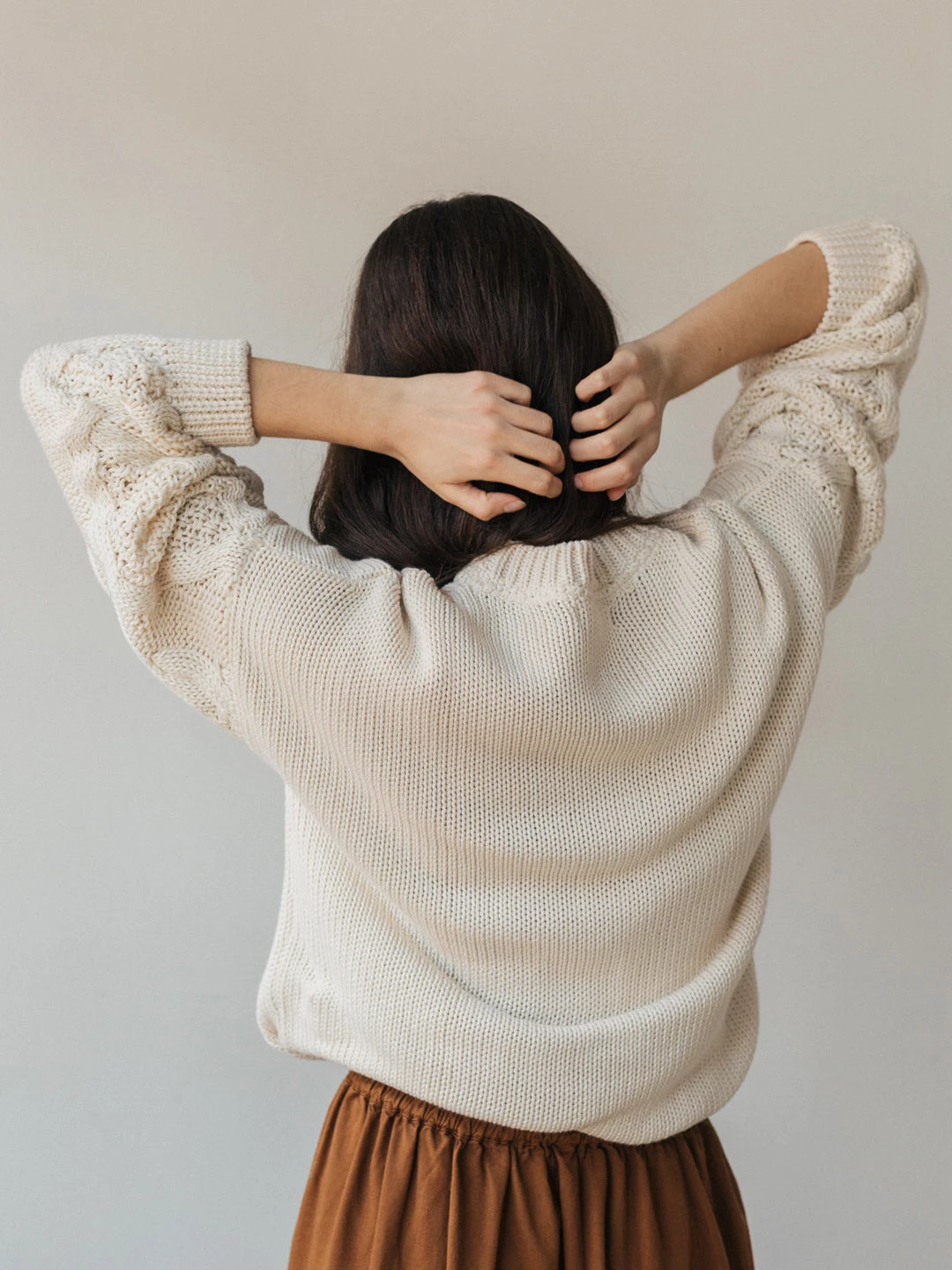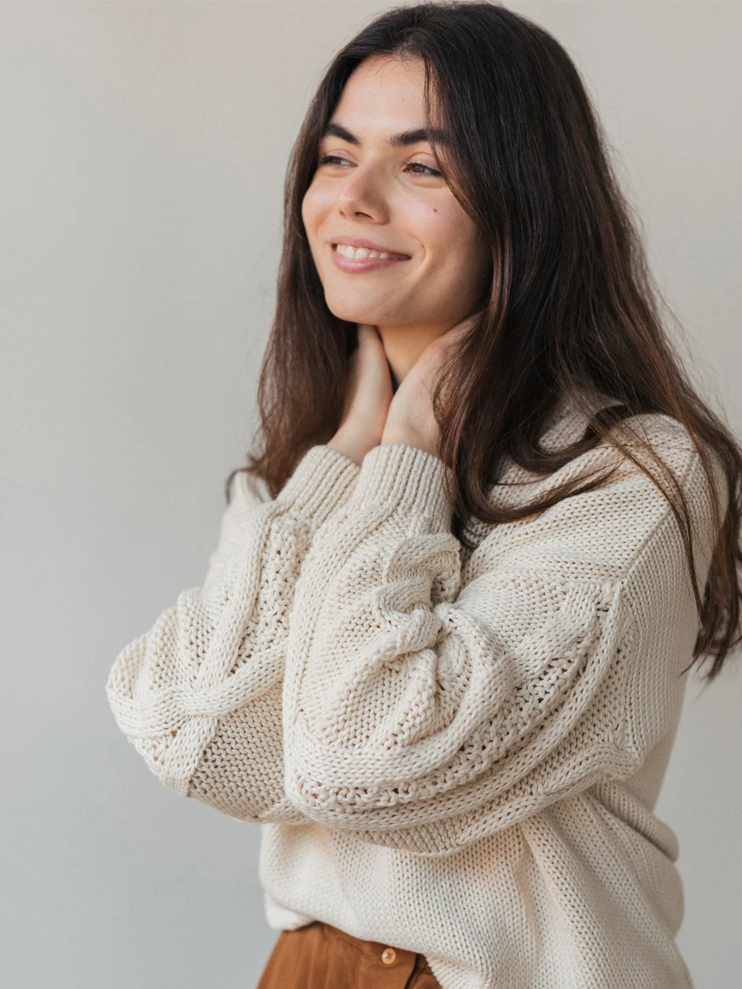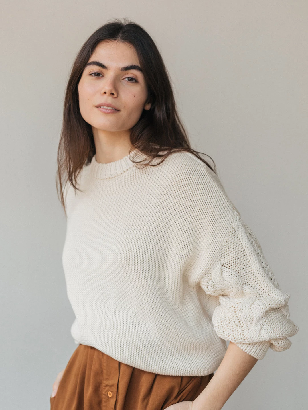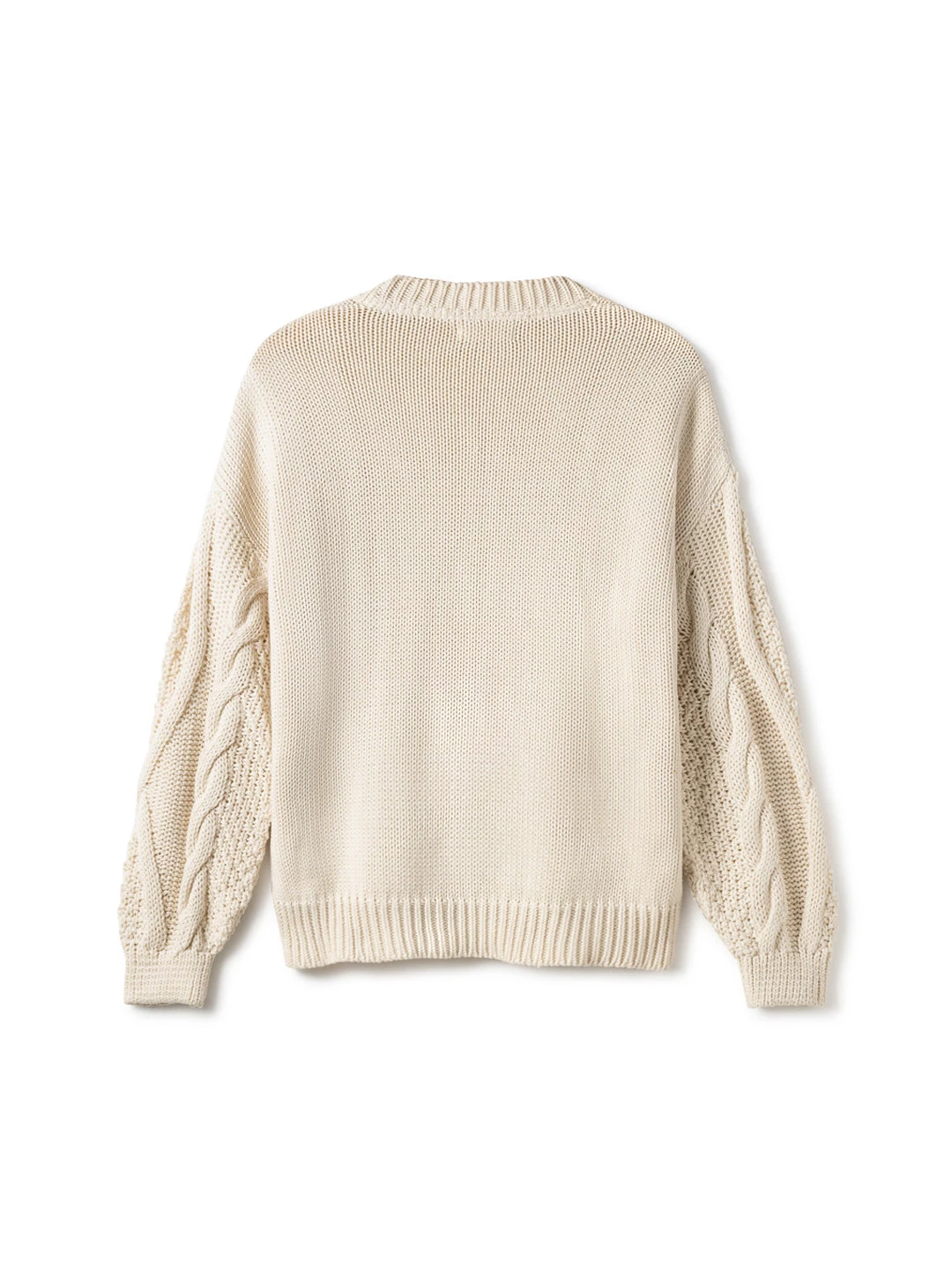 A cosy and organic knit: the Curtis. Made with a beautiful cable knit design at the sleeve and nude ecru colour. The jumper comes with dropped shoulders, ribbed edges, a round neckline and a fairly oversized fit.