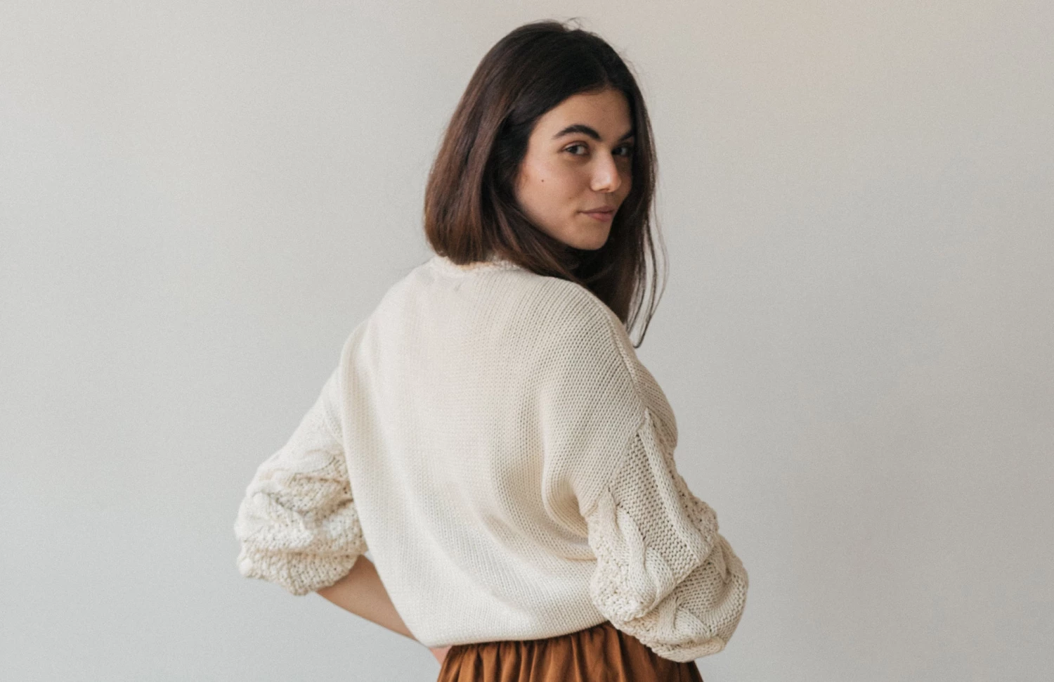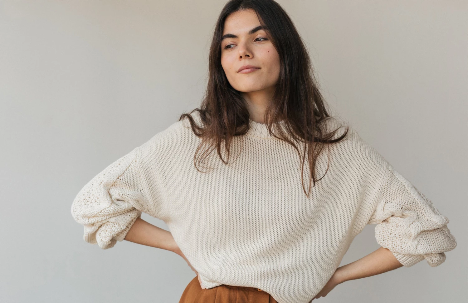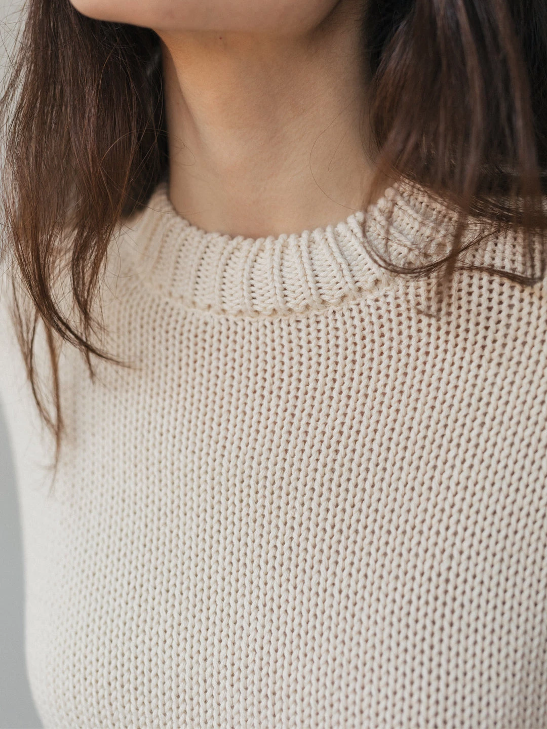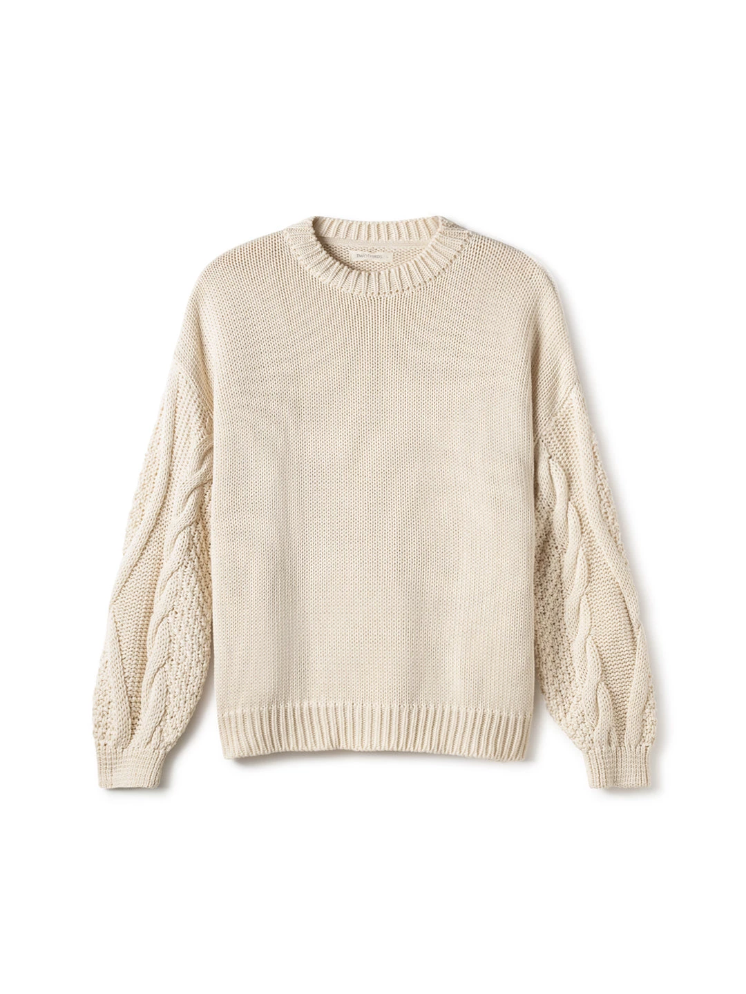 A cosy and organic knit: the Curtis. Made with a beautiful cable knit design at the sleeve and nude ecru colour. The jumper comes with dropped shoulders, ribbed edges, a round neckline and a fairly oversized fit.