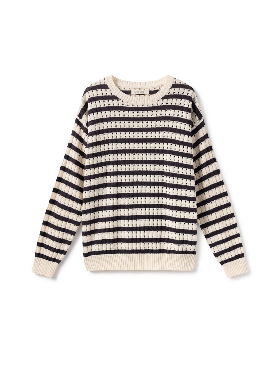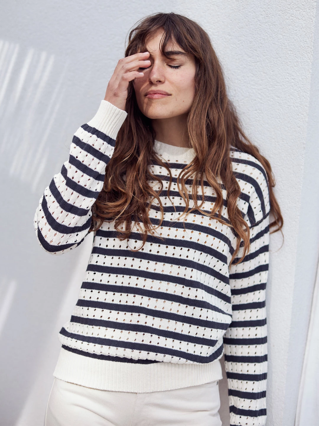 The Curuá features a beautiful open-work knitted fabric that is soft to the touch. Designed with navy stripes all over the knit, low armholes and ribbed edges for a cosier feeling. This knit sits around the waist with a regular fit.