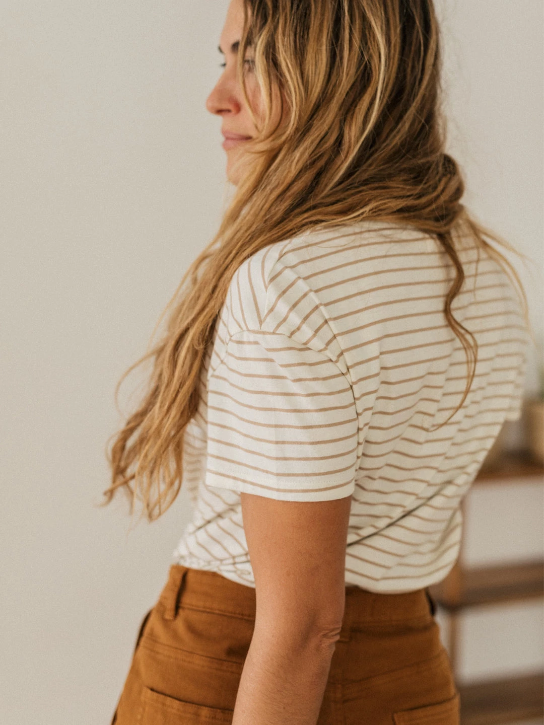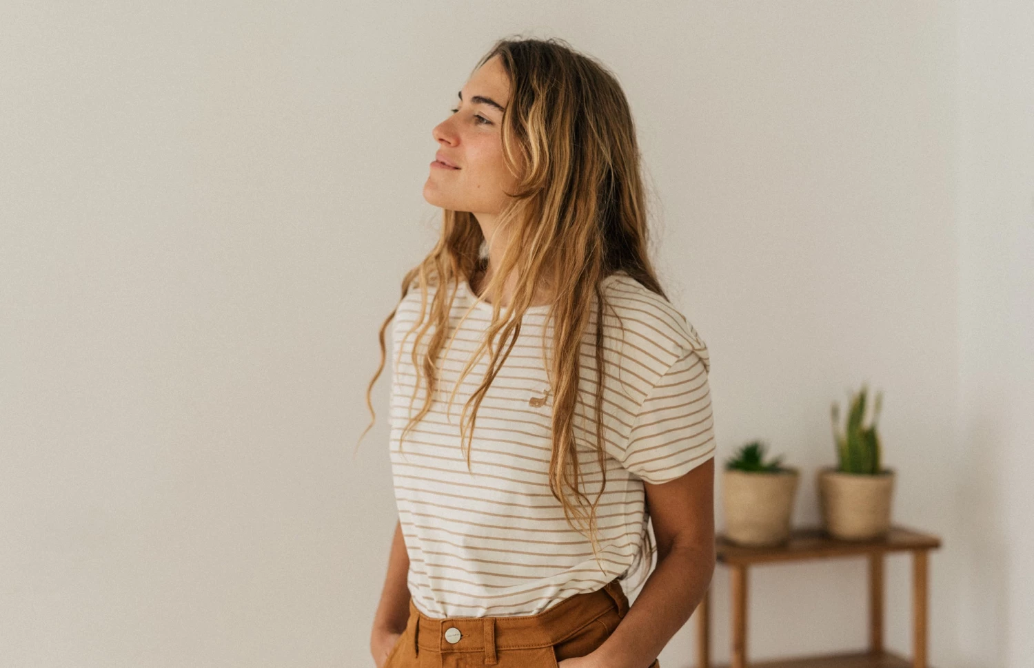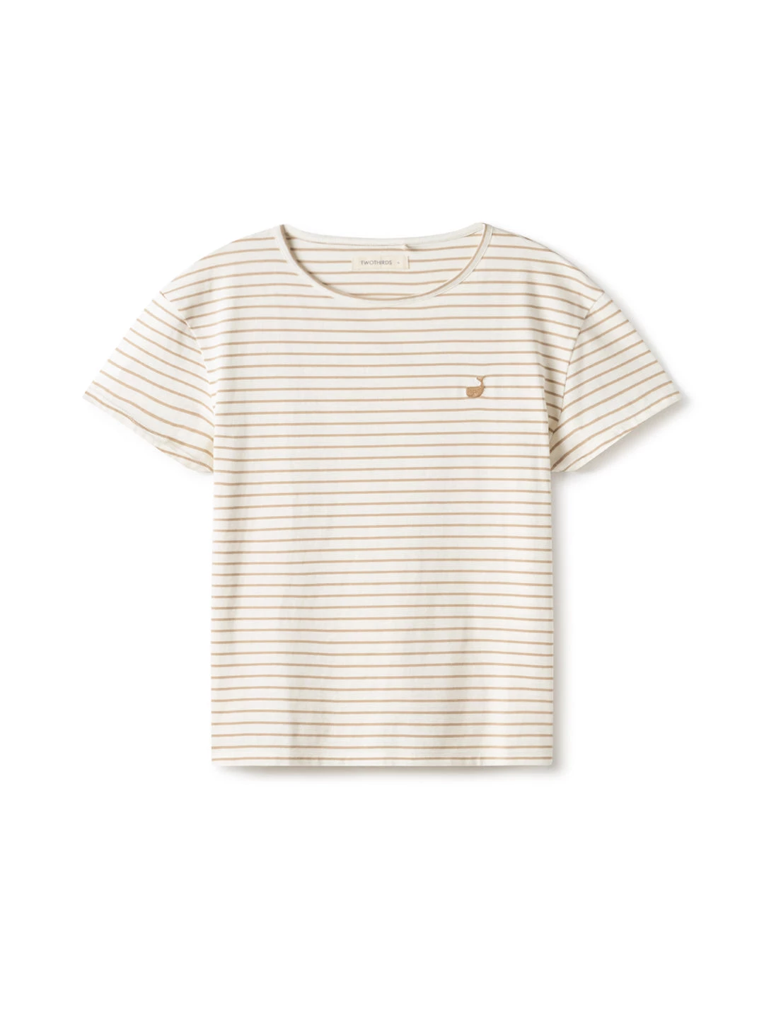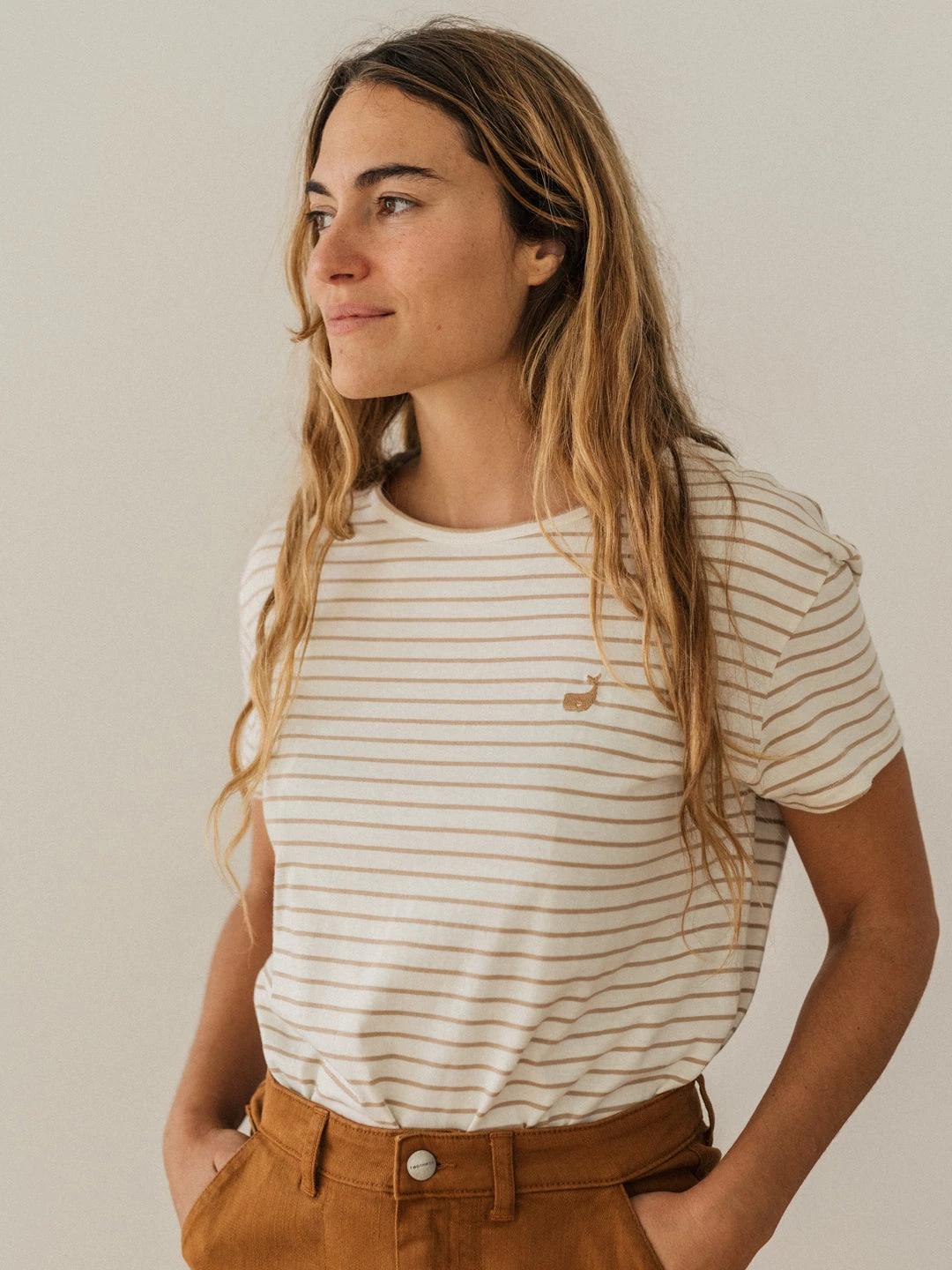 Here’s the Davura, a comfy top that yields extra softness. Produced with an organic fabric and designed with a striped style and bottom side openings – featuring a matching whale embroidery on the chest. The tee comes in a regular fit and hip-length cut.