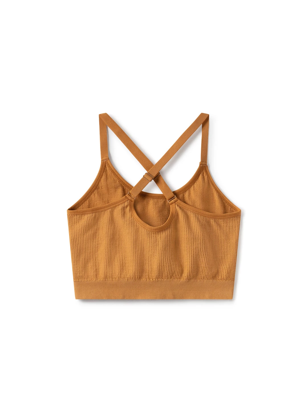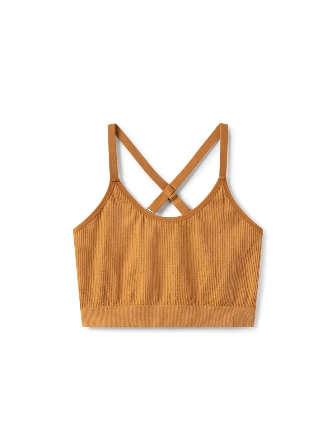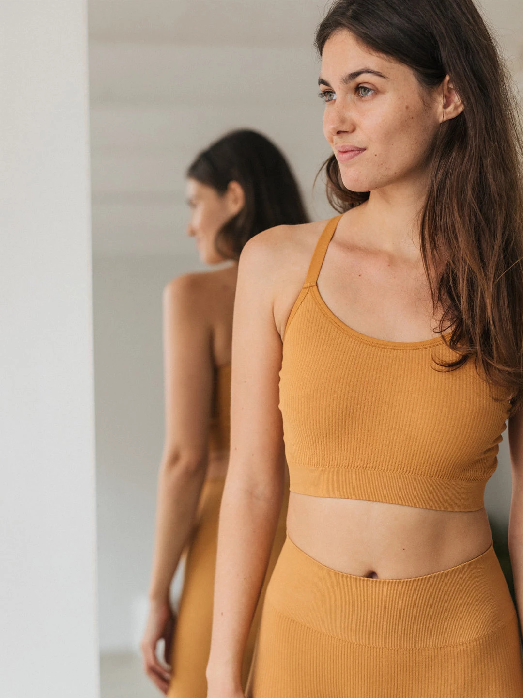 The Dungun top is part of our Activewear Collection. A seamless sports bra with thin shoulder straps in an elegant cross over-design to prevent slipping, paired with a round neckline. Organic cotton makes it super soft, while a touch of recycled polyamide allows for perspiration and adds resistance – a wonderful and stretchy fabric.Â