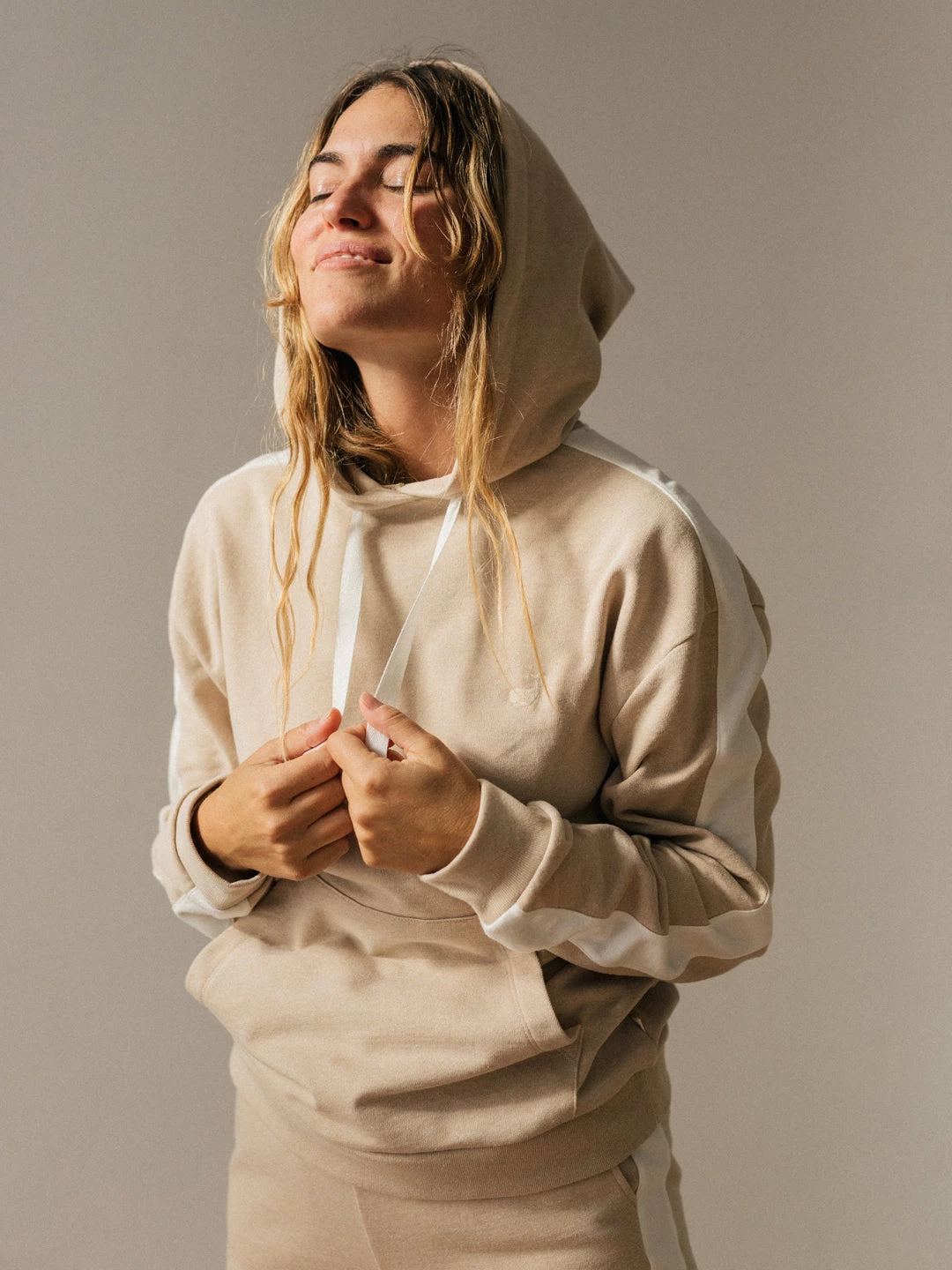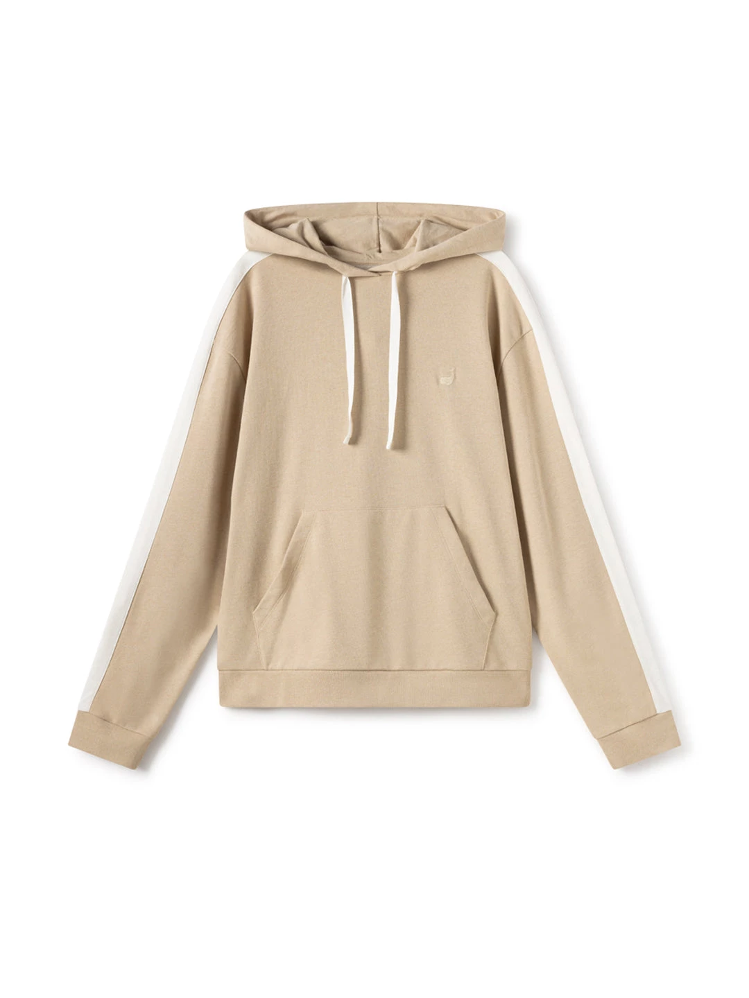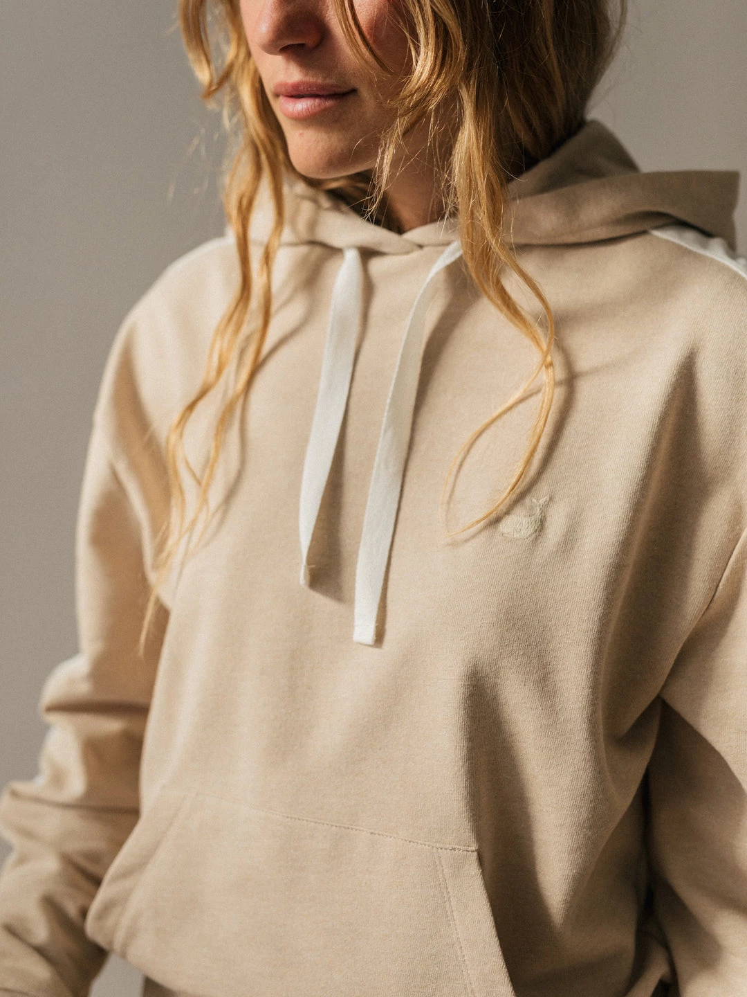 The Fanduca sweatshirt is as comfortable as it is sustainable. Designed in a soft recycled fabric and natural colour, featuring a white stripe on the sleeves, a kangaroo pocket on the front and a drawstring adjustable hood. The sweat comes in a fairly loose fit and hip-length cut.