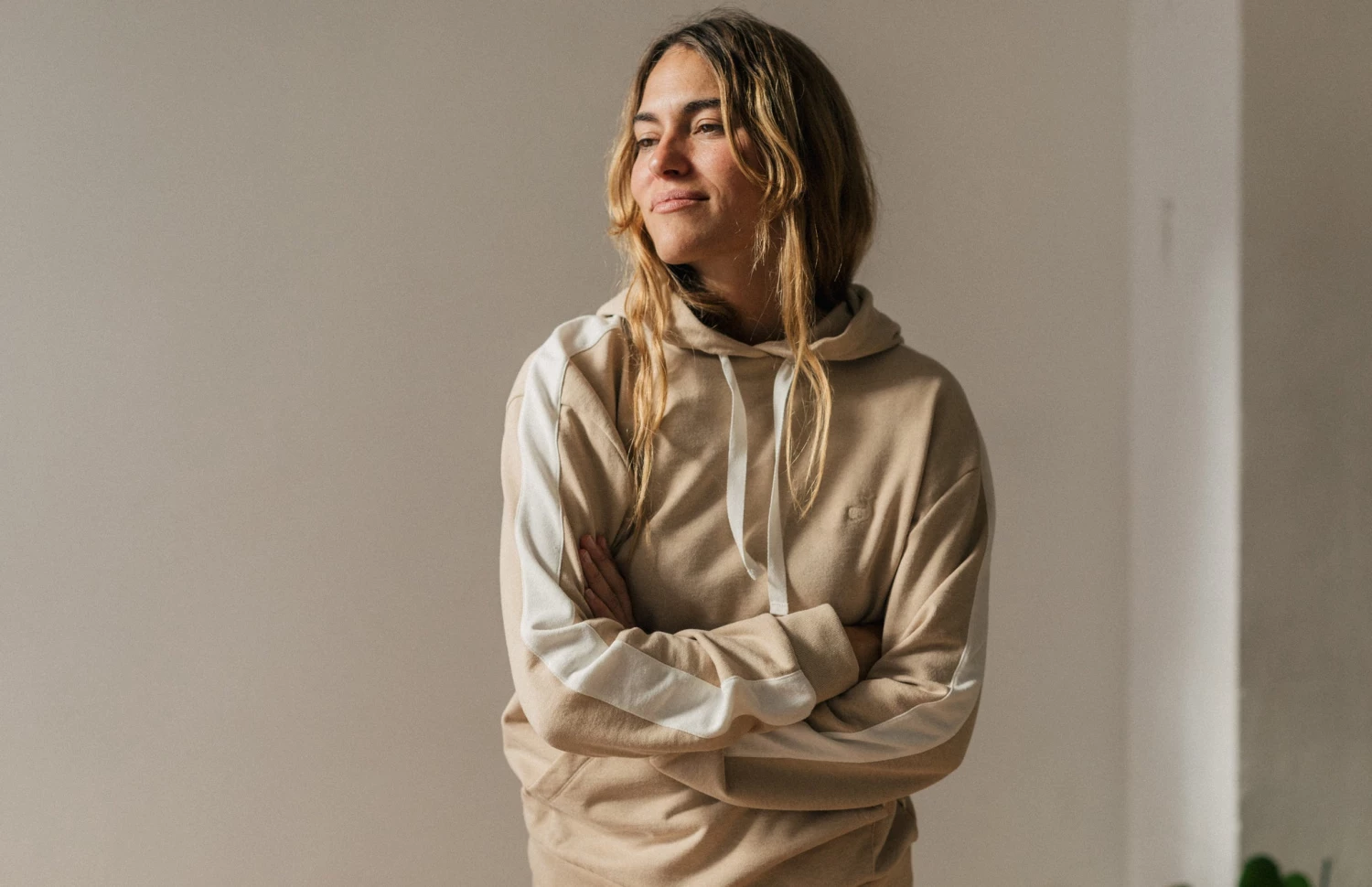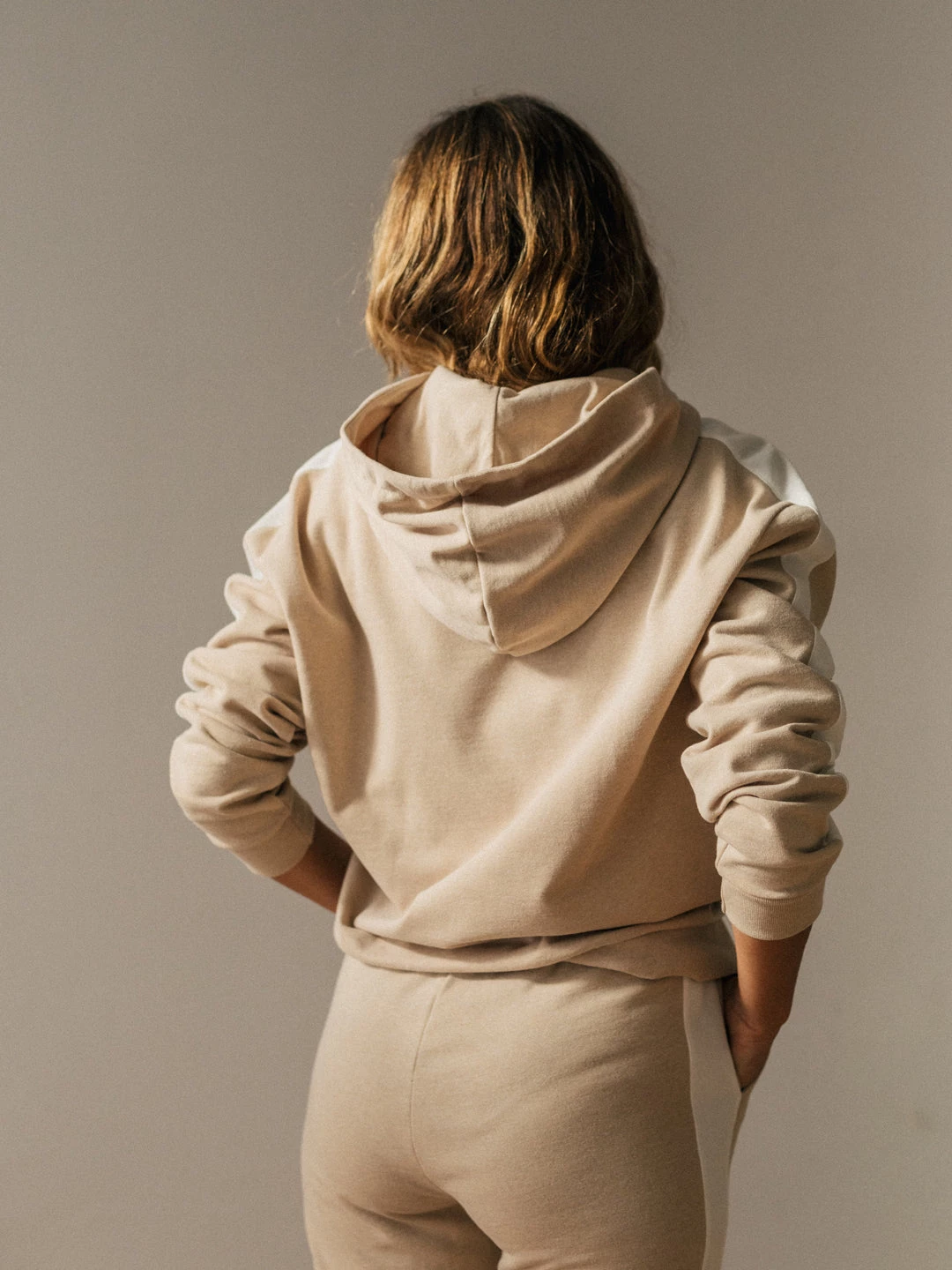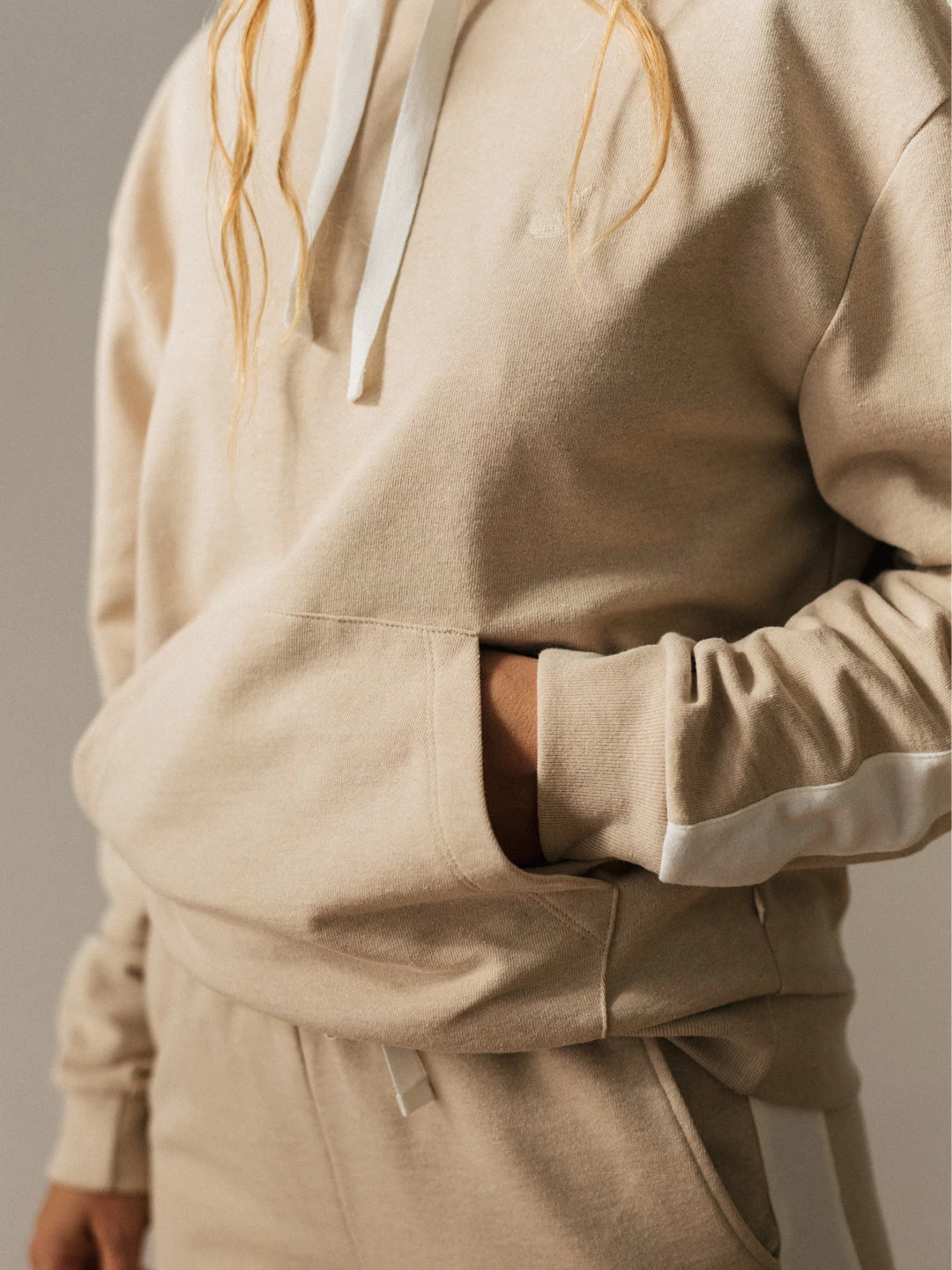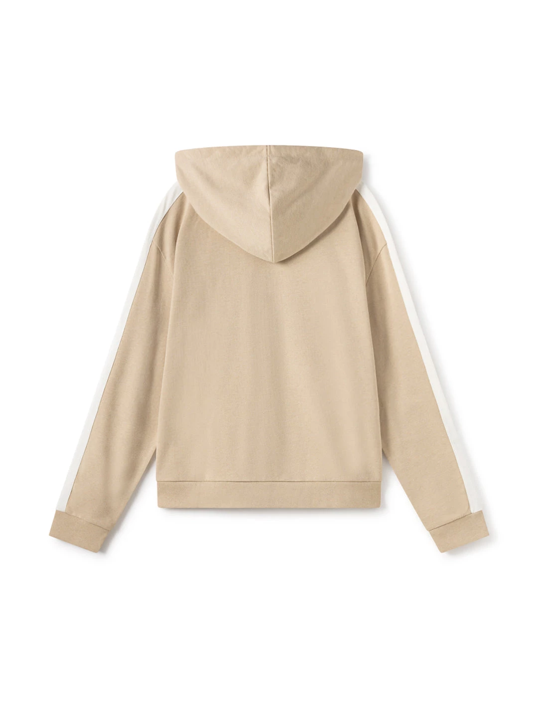 The Fanduca sweatshirt is as comfortable as it is sustainable. Designed in a soft recycled fabric and natural colour, featuring a white stripe on the sleeves, a kangaroo pocket on the front and a drawstring adjustable hood. The sweat comes in a fairly loose fit and hip-length cut.