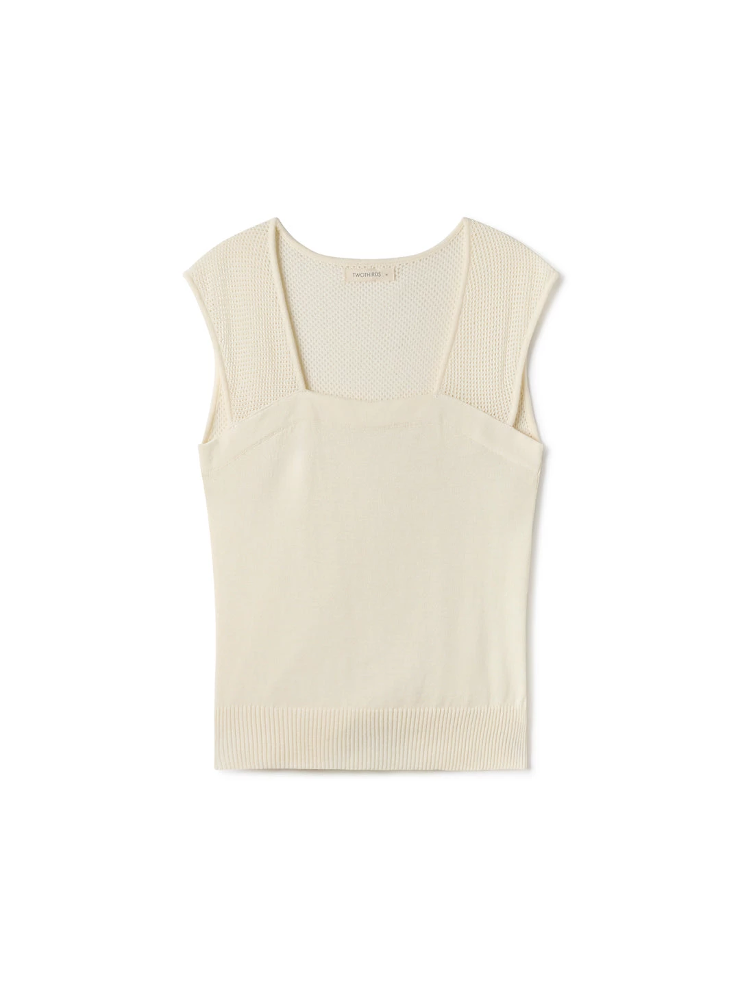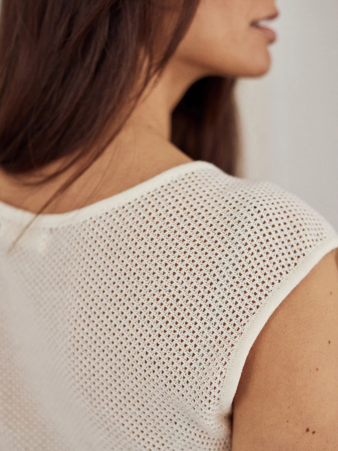 Here’s the charming Fogn knit, designed in a soft fabric and smooth ecru colour. The garment has a thicker knit structure on the front, thinner on the back and shoulders.Â