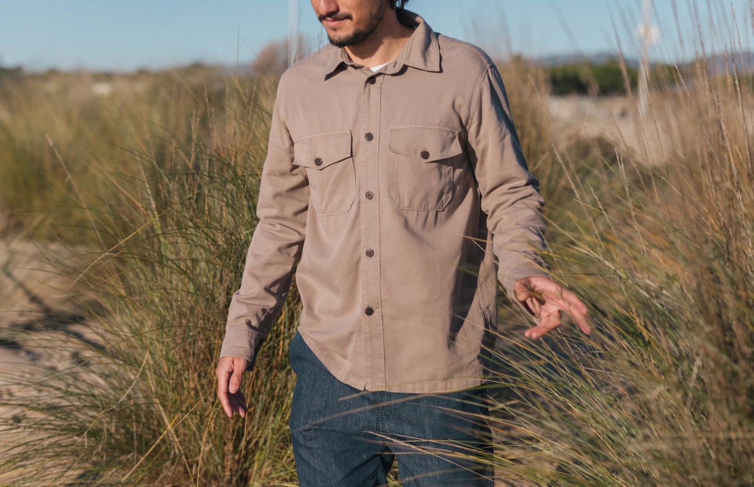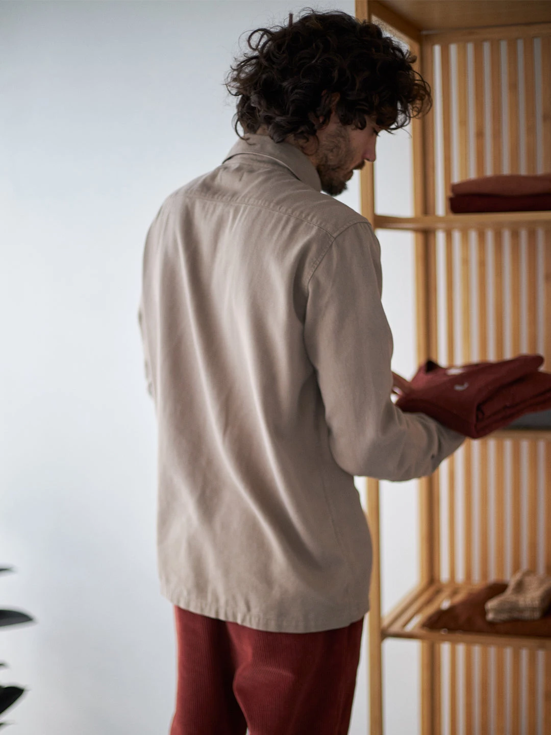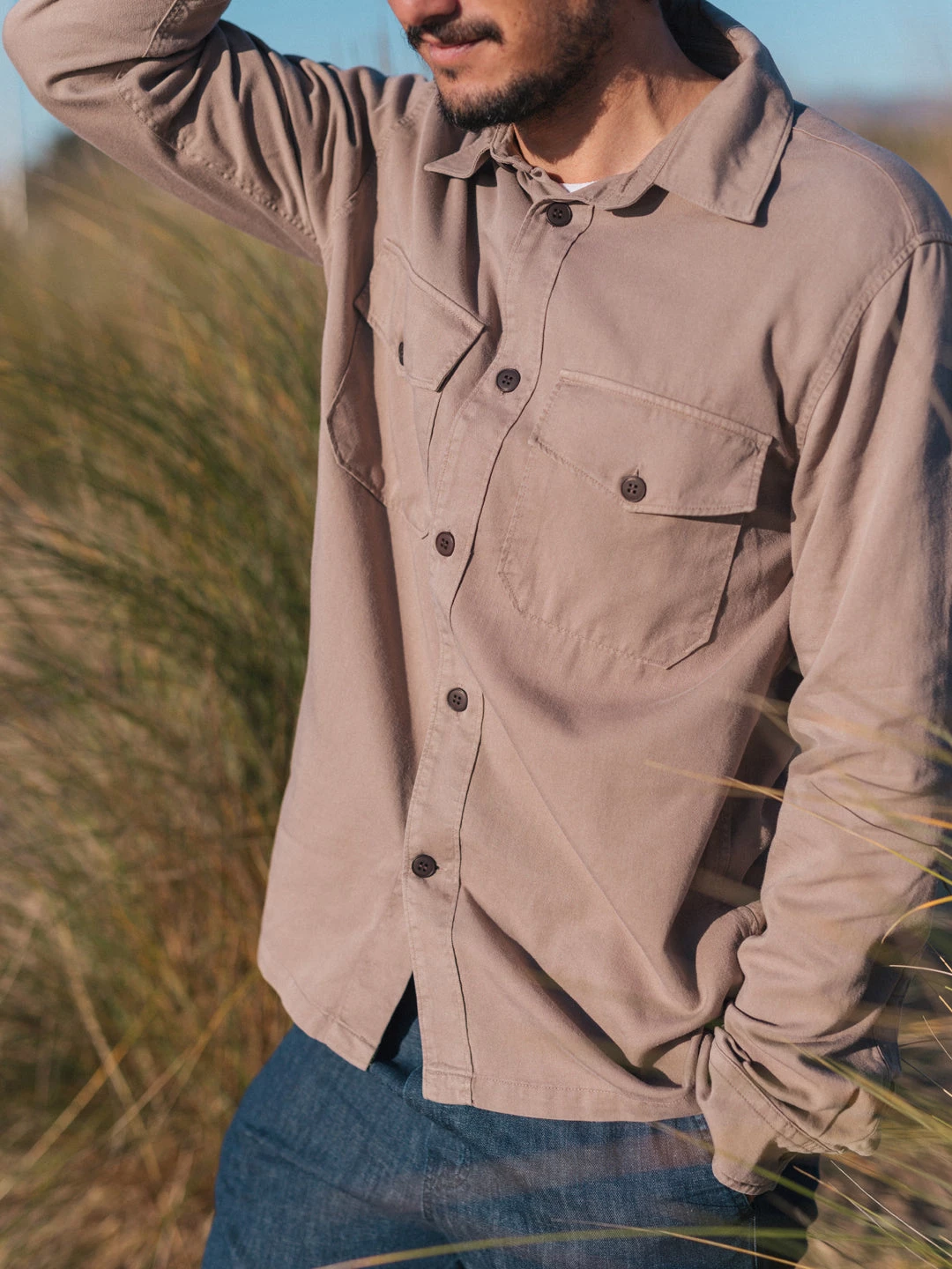 Cotton from post-and-pre-consumer sources and pulp from sustainably managed forests give life to our Funen shirt. With a regular fit and collar, naturally sourced corozo buttons, two pockets on the chest and cut edges on both sides making the back length a bit longer.