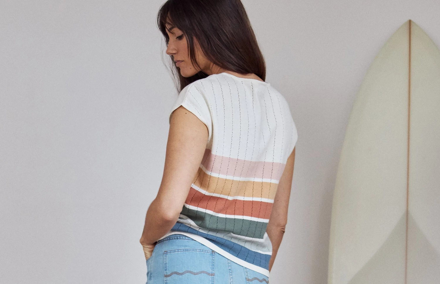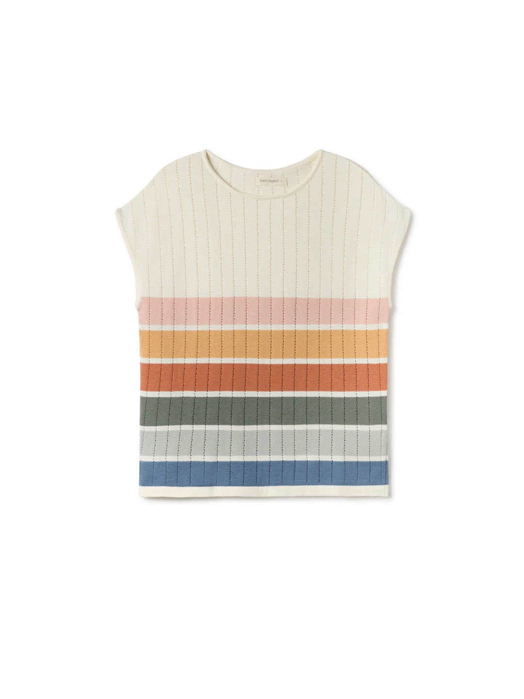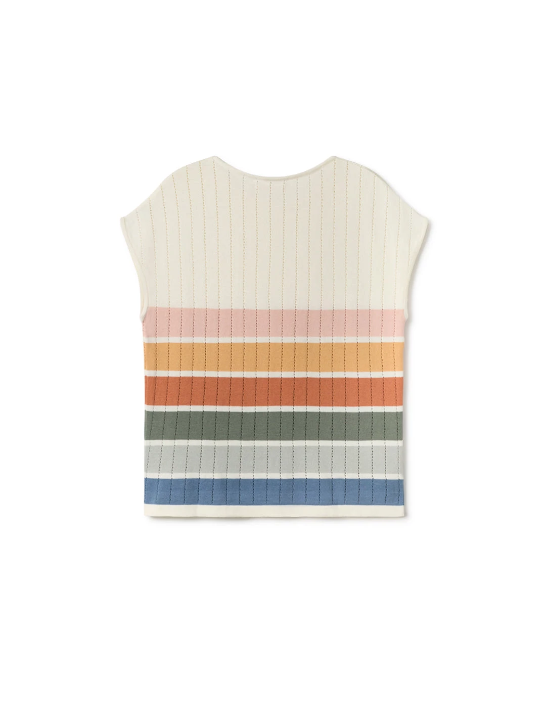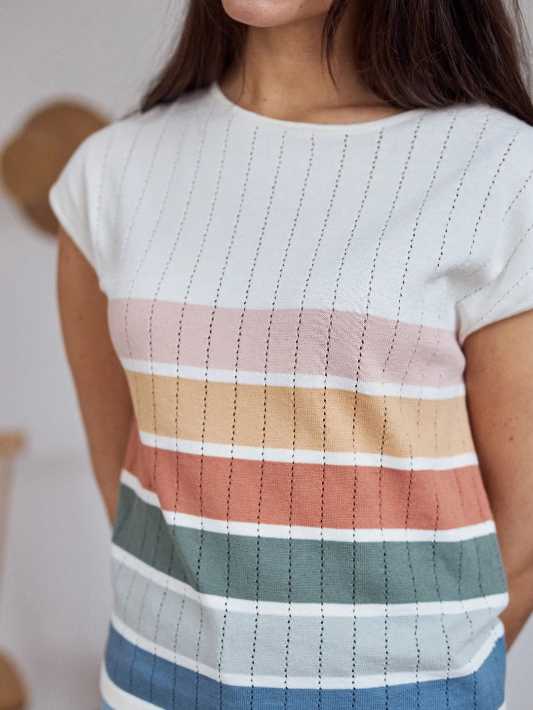 Rainbow stripes and a gentle fabric bring the Gossa together. Designed with short batwing sleeves, raw edges and a round neckline.