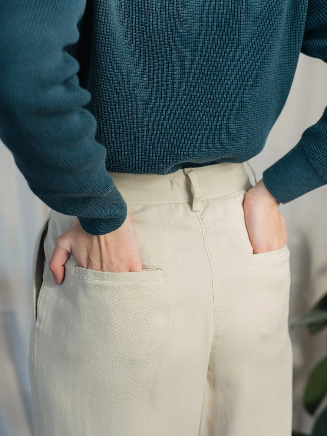 Holbox: taking style to a whole new level! They’re super comfy cuffed pants with gathered buttons, 4 pockets in total and a naturally sourced corozo button. This garment hangs around the waist, falls to calf length and is made from a beautifully silky sustainable fibre.Â