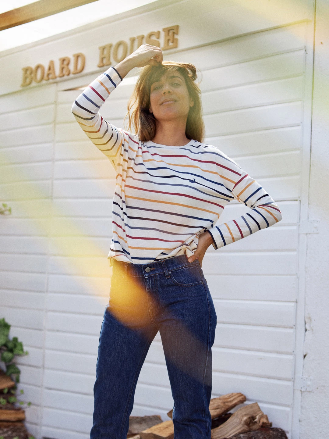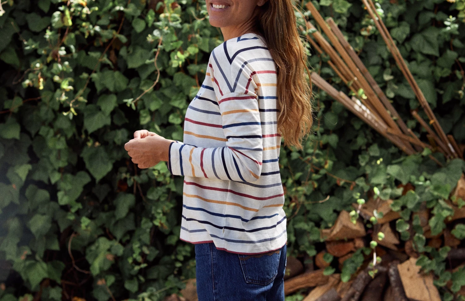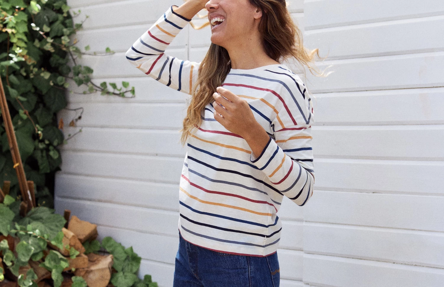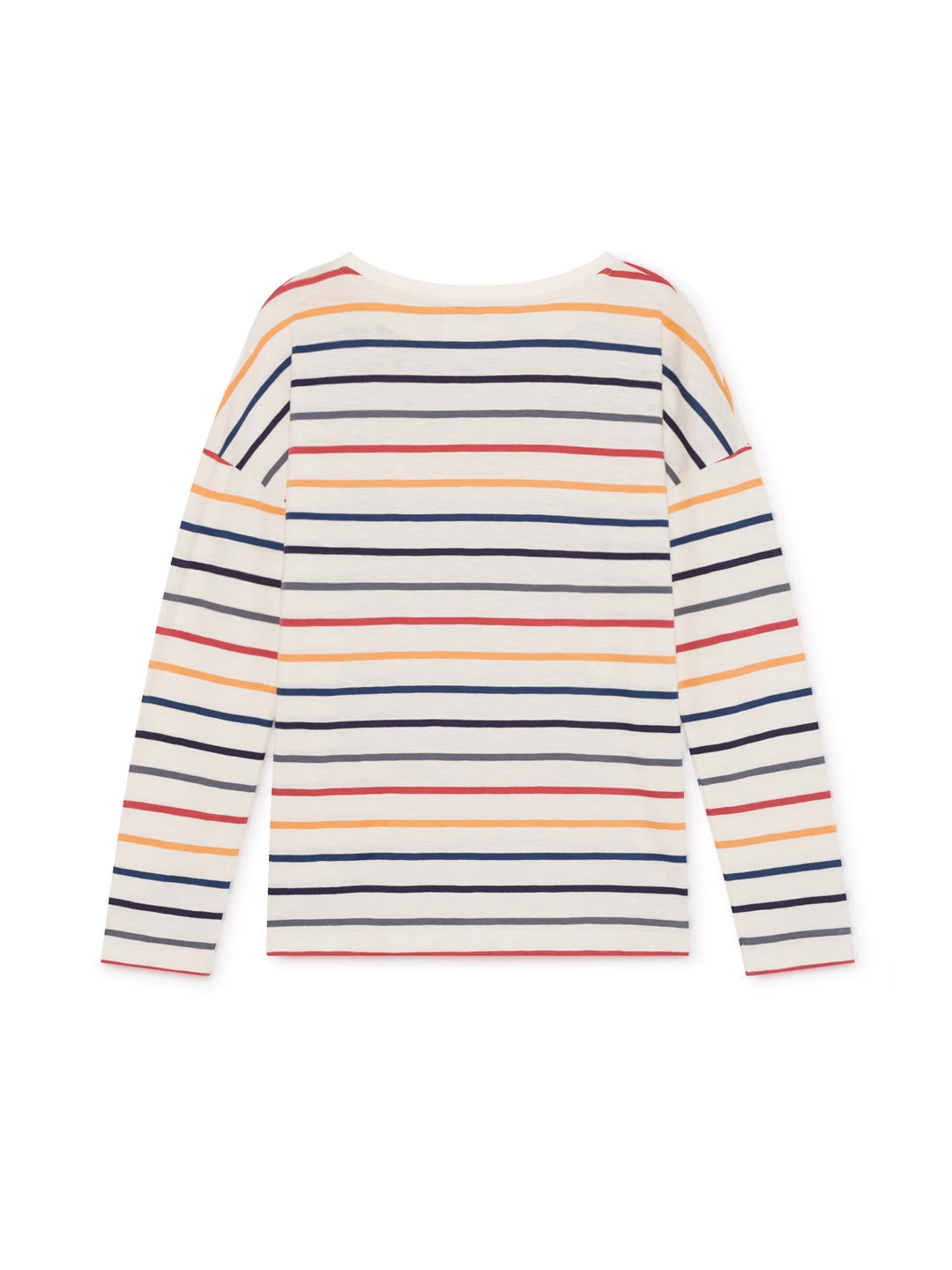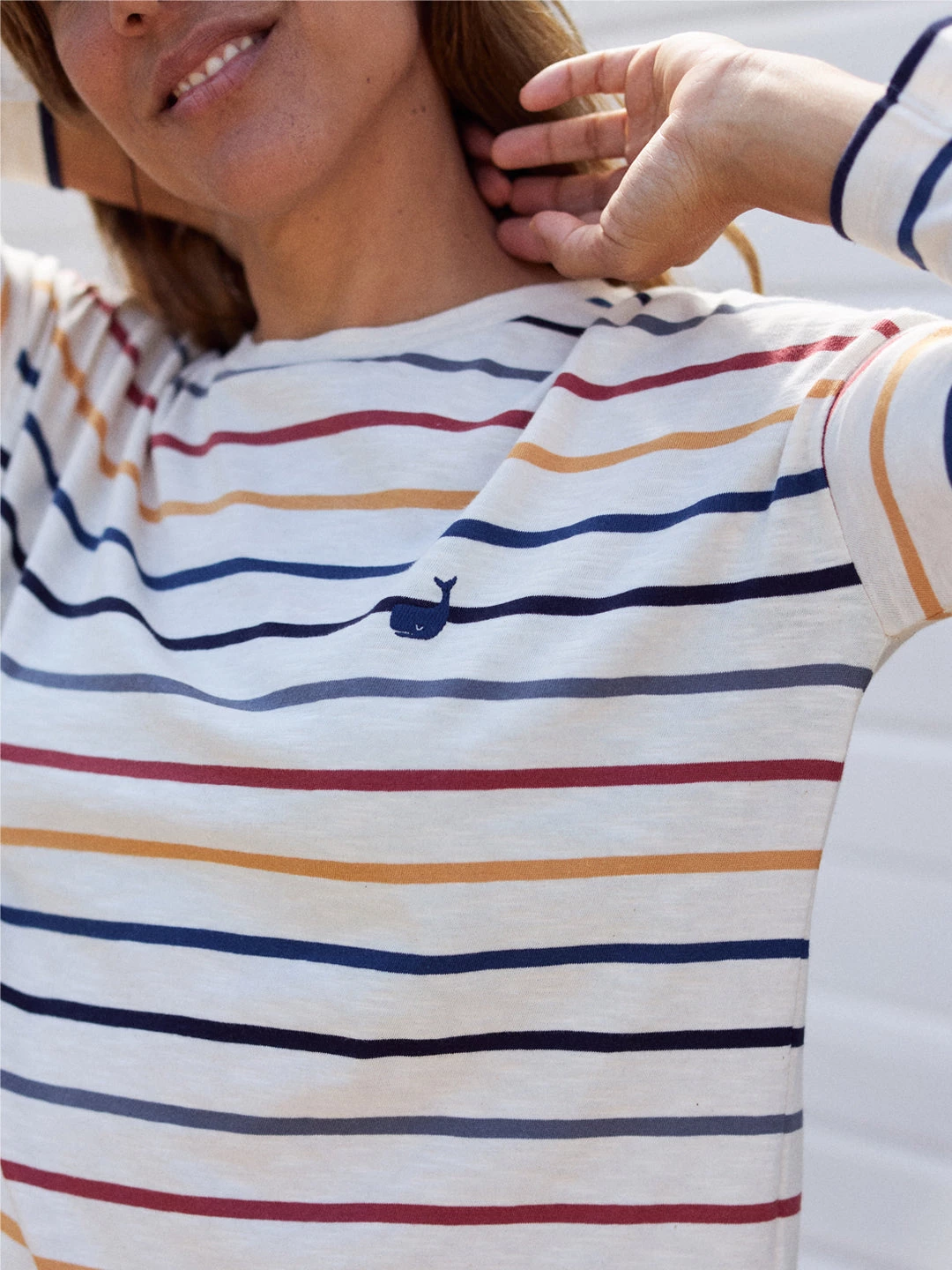 Colourful stripes to brighten up your outfit alongside a soft and natural fabric: the Huemul top. Designed with dropped shoulders, long sleeves and our iconic whale embroidery in a matching colour. The tee has a fairly loose fit and hip-length.