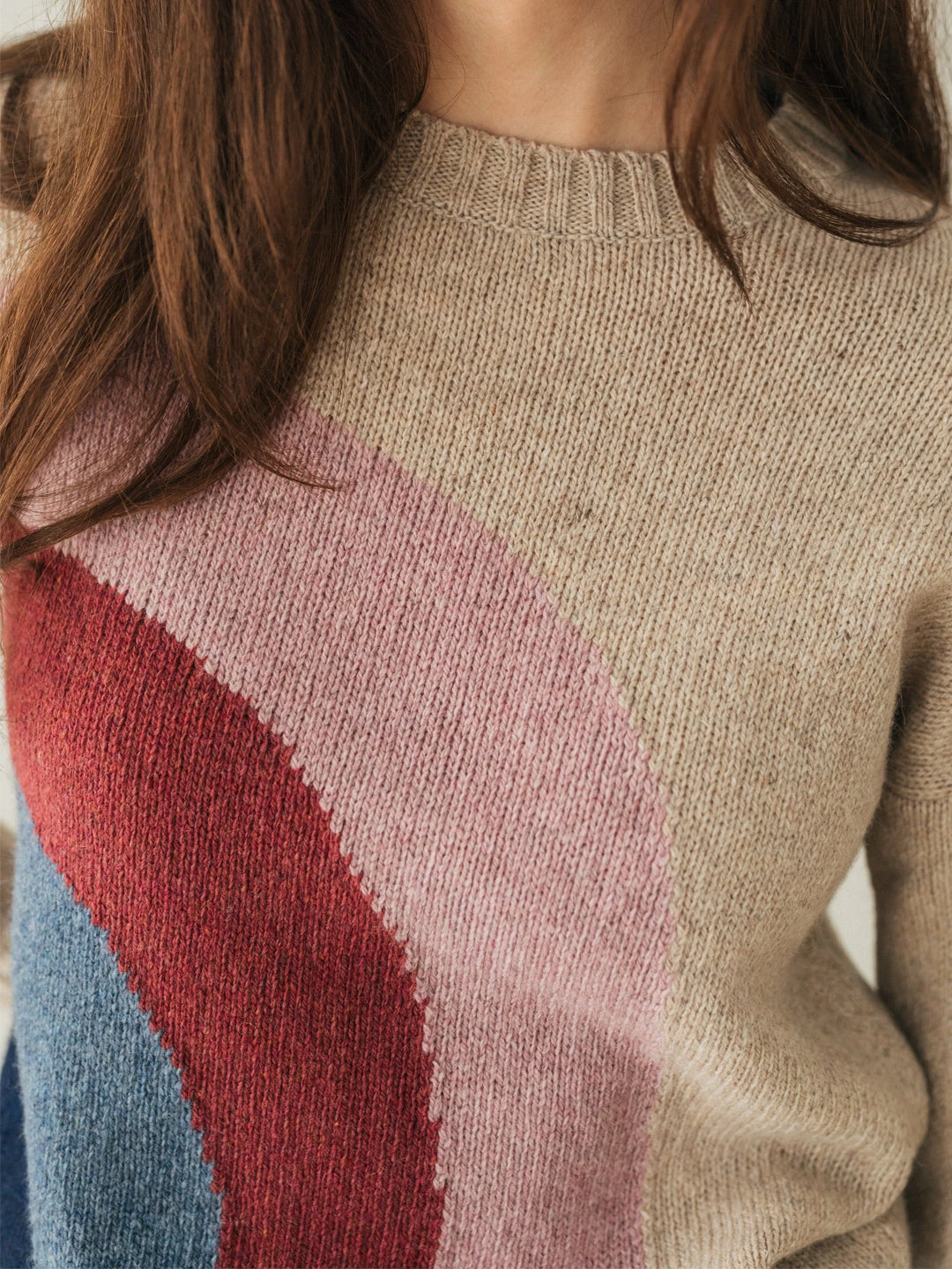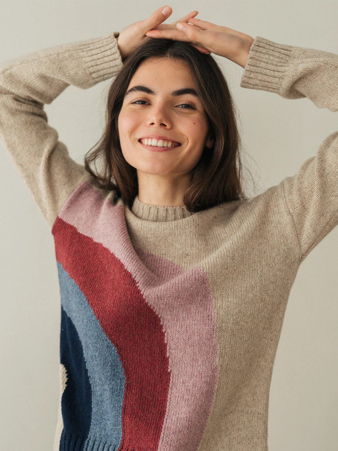 With a rainbow crossing from the side to the base of the garment: here’s the Iceland knit. Made entirely from a recycled wool blend, so that beauty can be combined with sustainability. Designed with ribbed edges and a regular fit.Â