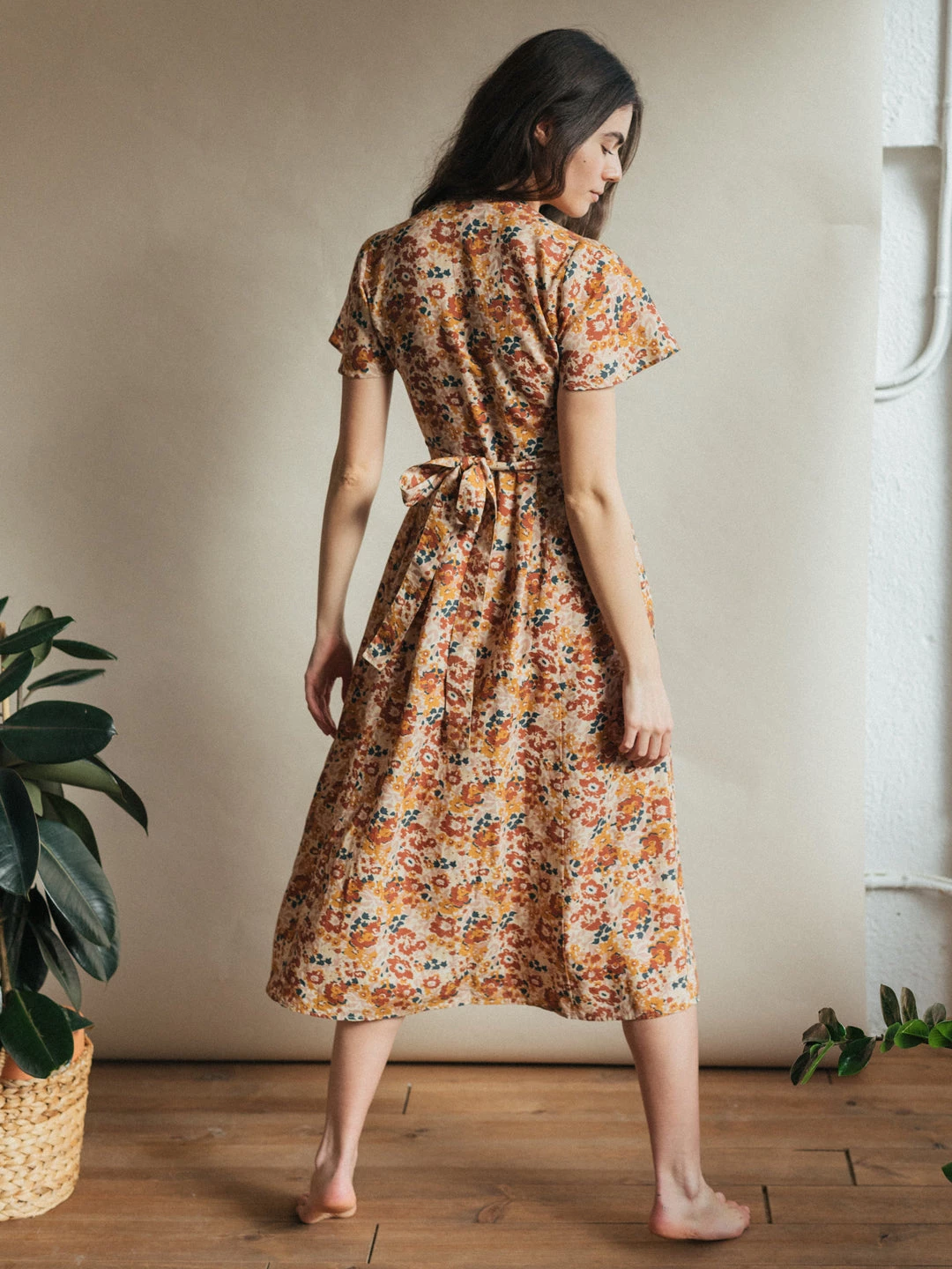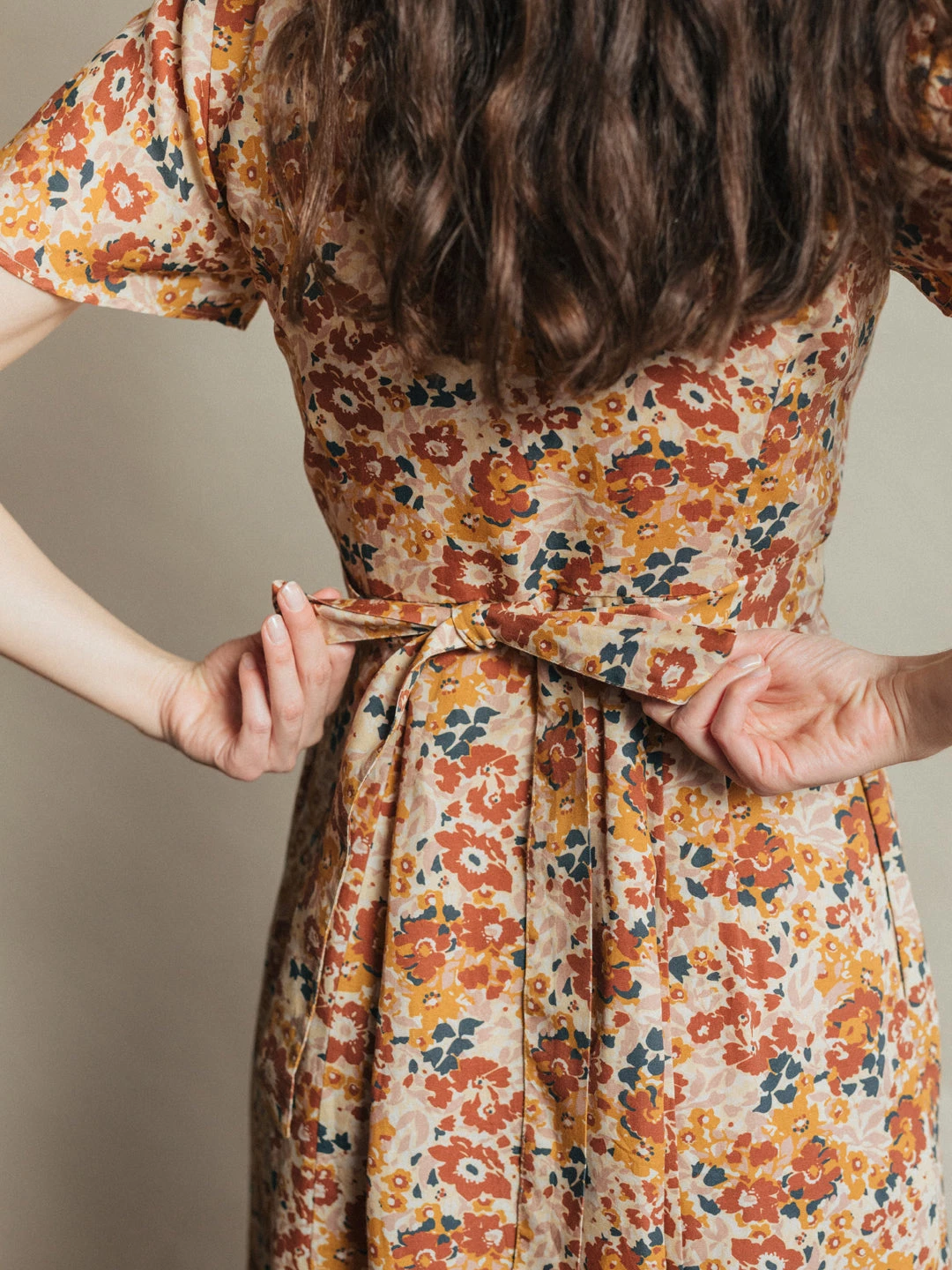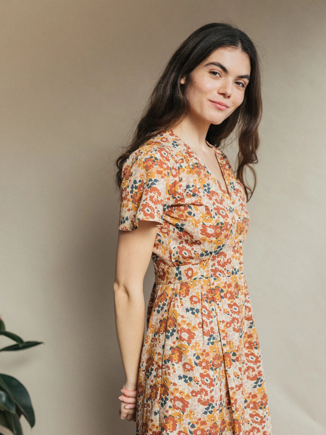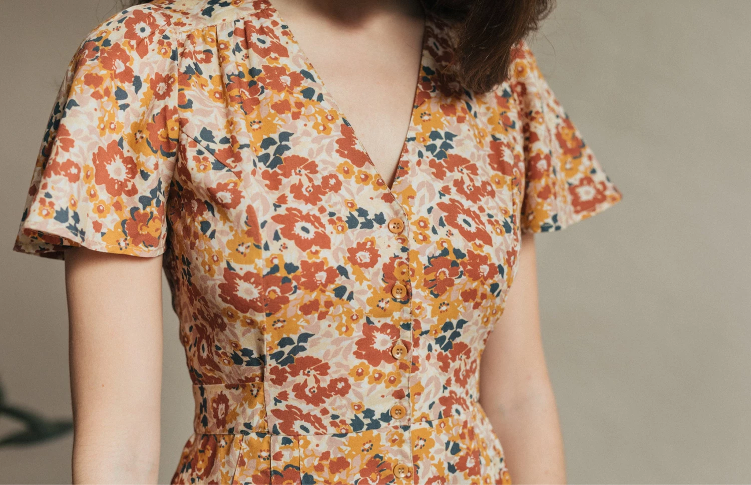 Beautiful roses cover our new dress, the Iona. Made in a sustainable and gentle fabric, featuring naturally sourced corozo buttons. The garment is designed with a lace around the waistband for better adjustment and V-neckline. It comes in a mid-calf length cut and regular fit.Â