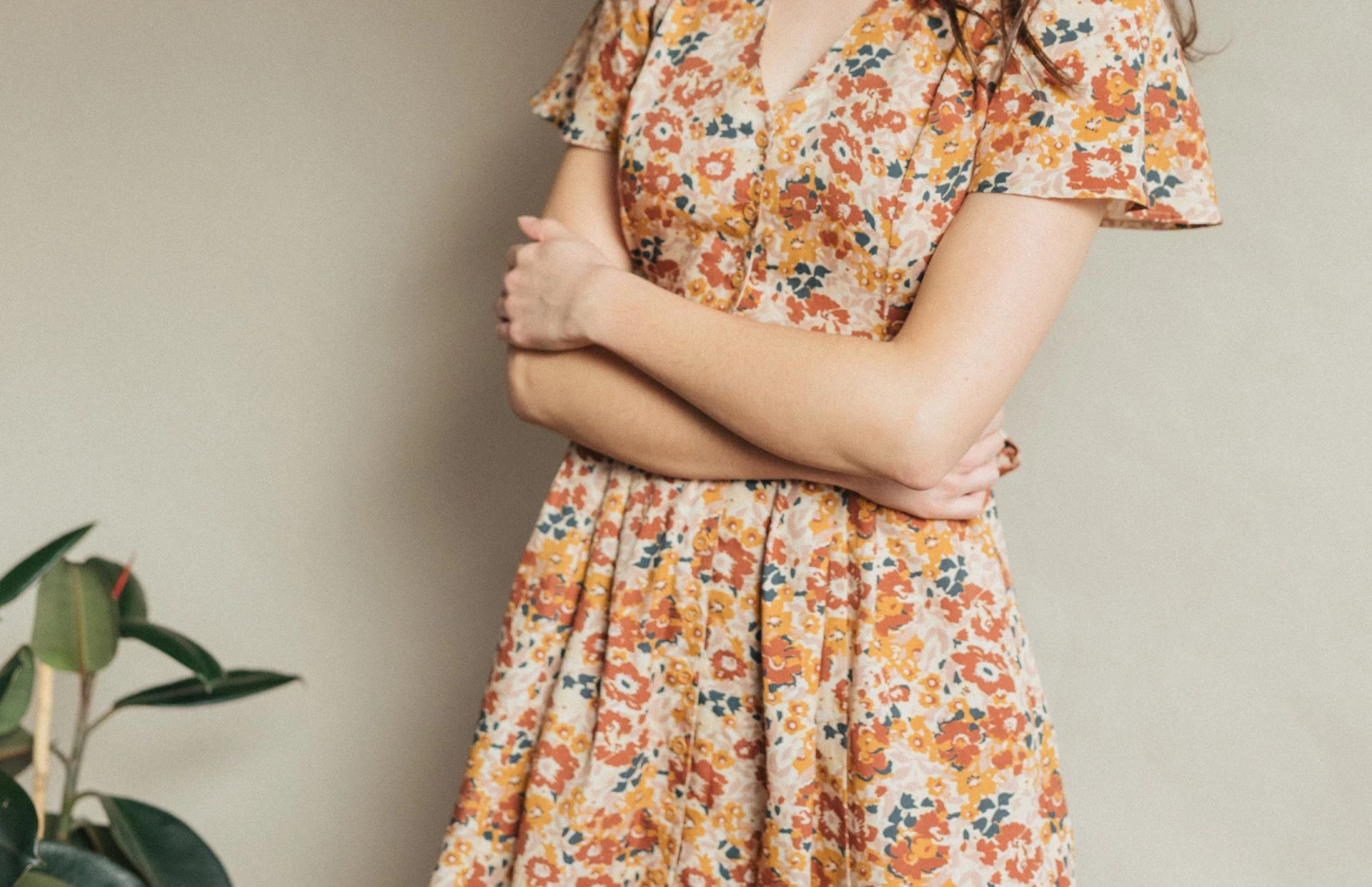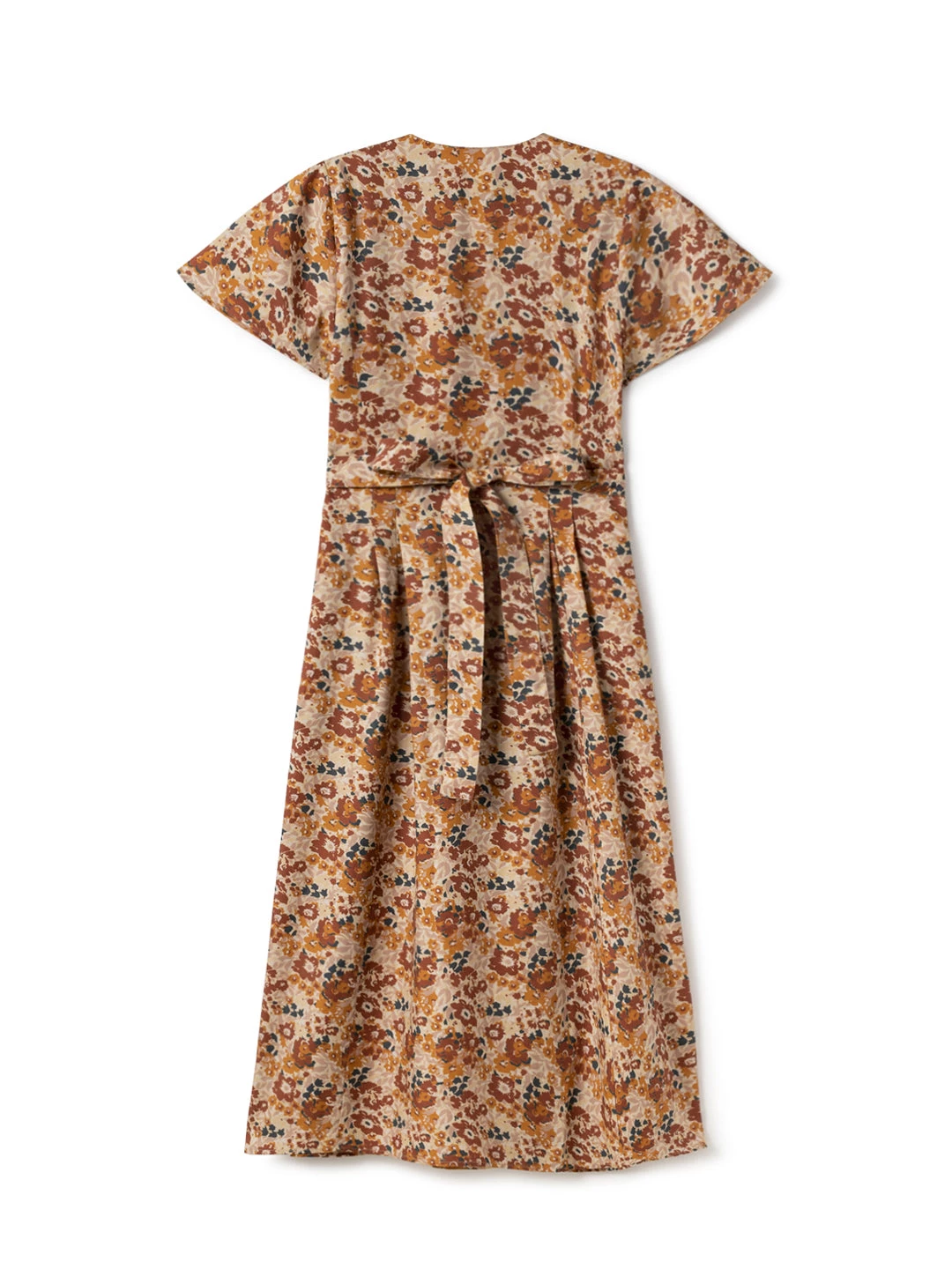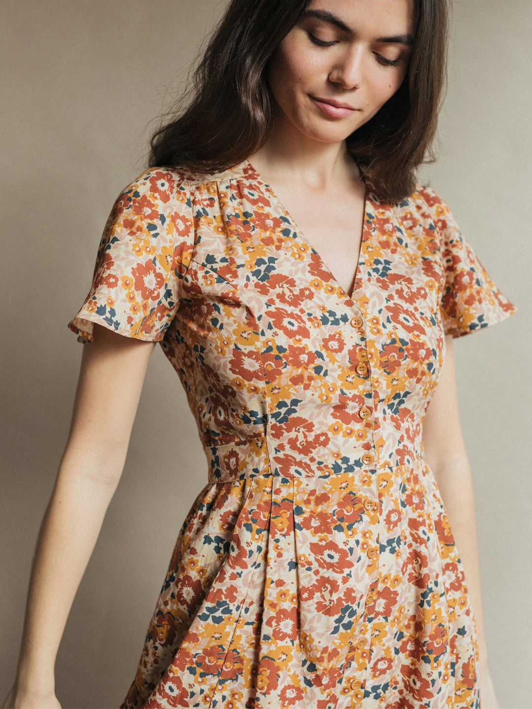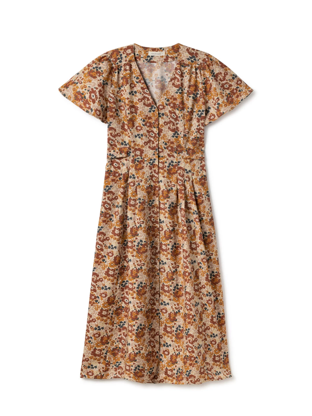 Beautiful roses cover our new dress, the Iona. Made in a sustainable and gentle fabric, featuring naturally sourced corozo buttons. The garment is designed with a lace around the waistband for better adjustment and V-neckline. It comes in a mid-calf length cut and regular fit.Â