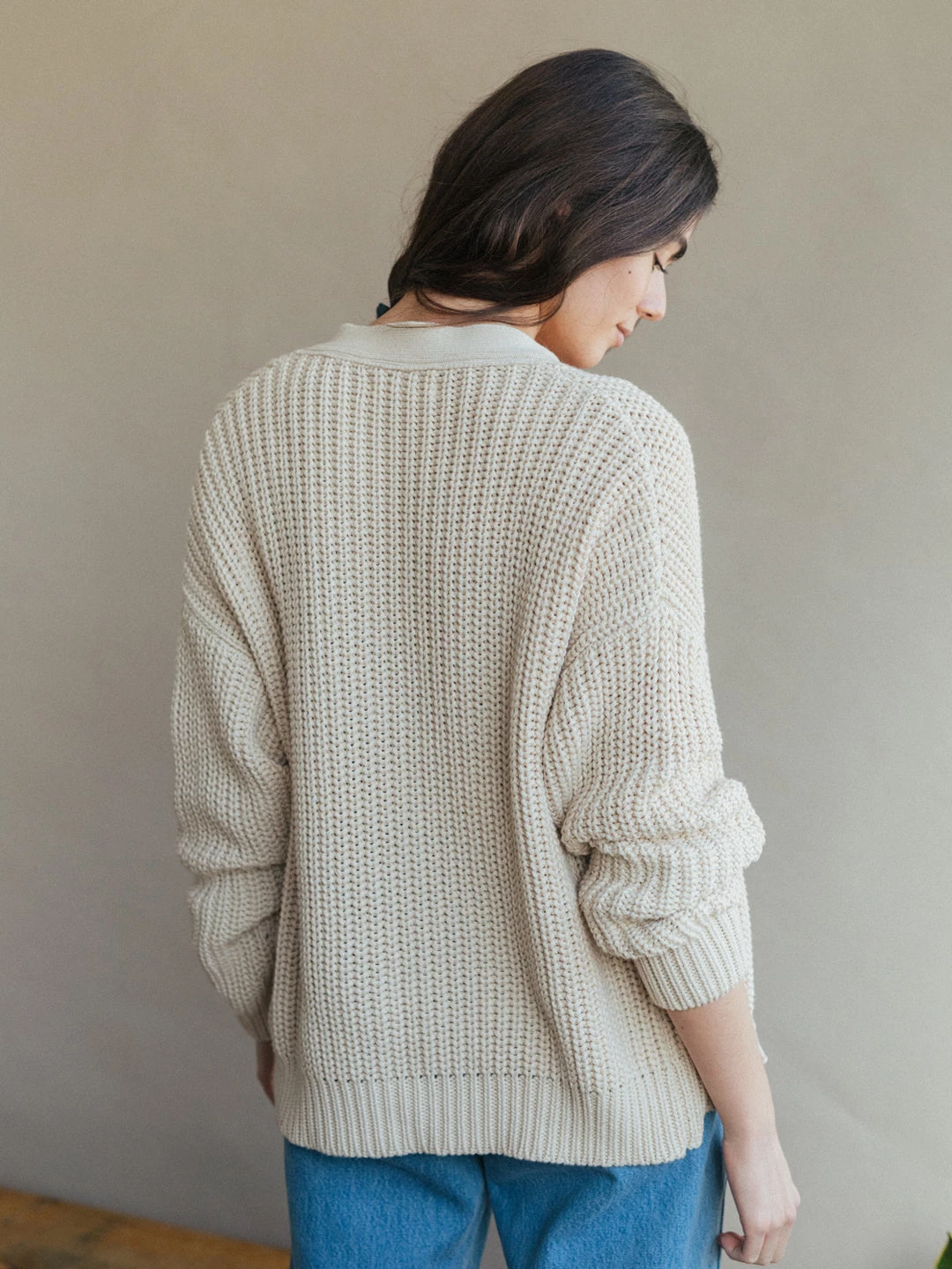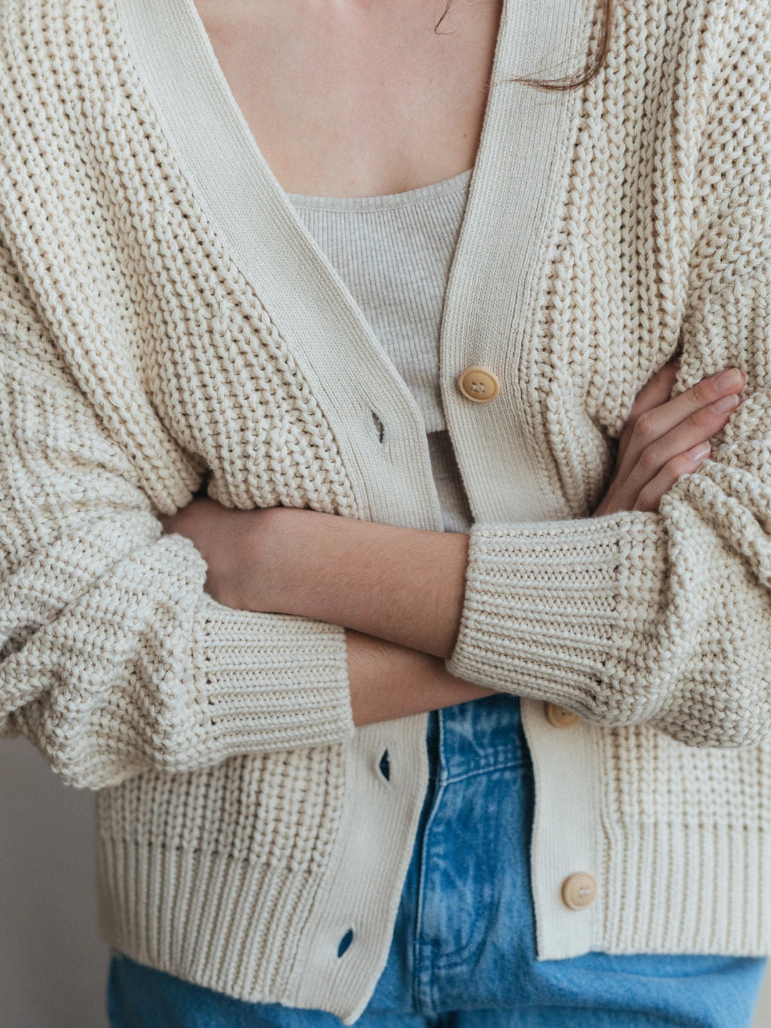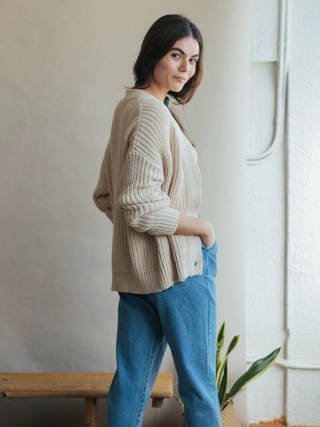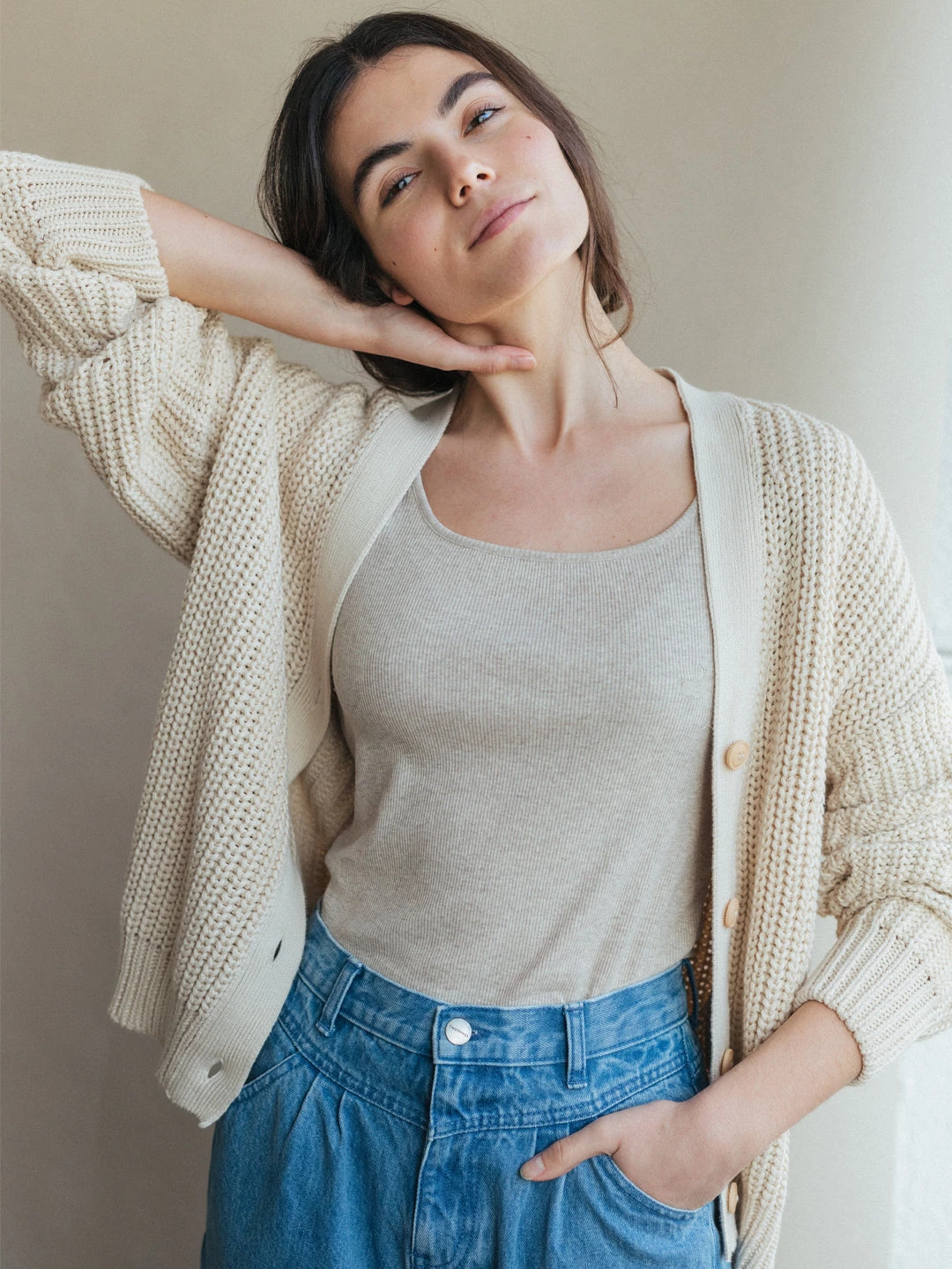 You can easily wear the Itaparica as an oversized cardigan, opened with a turtleneck tee underneath or buttoned up as a knit with a basic white tee.Â