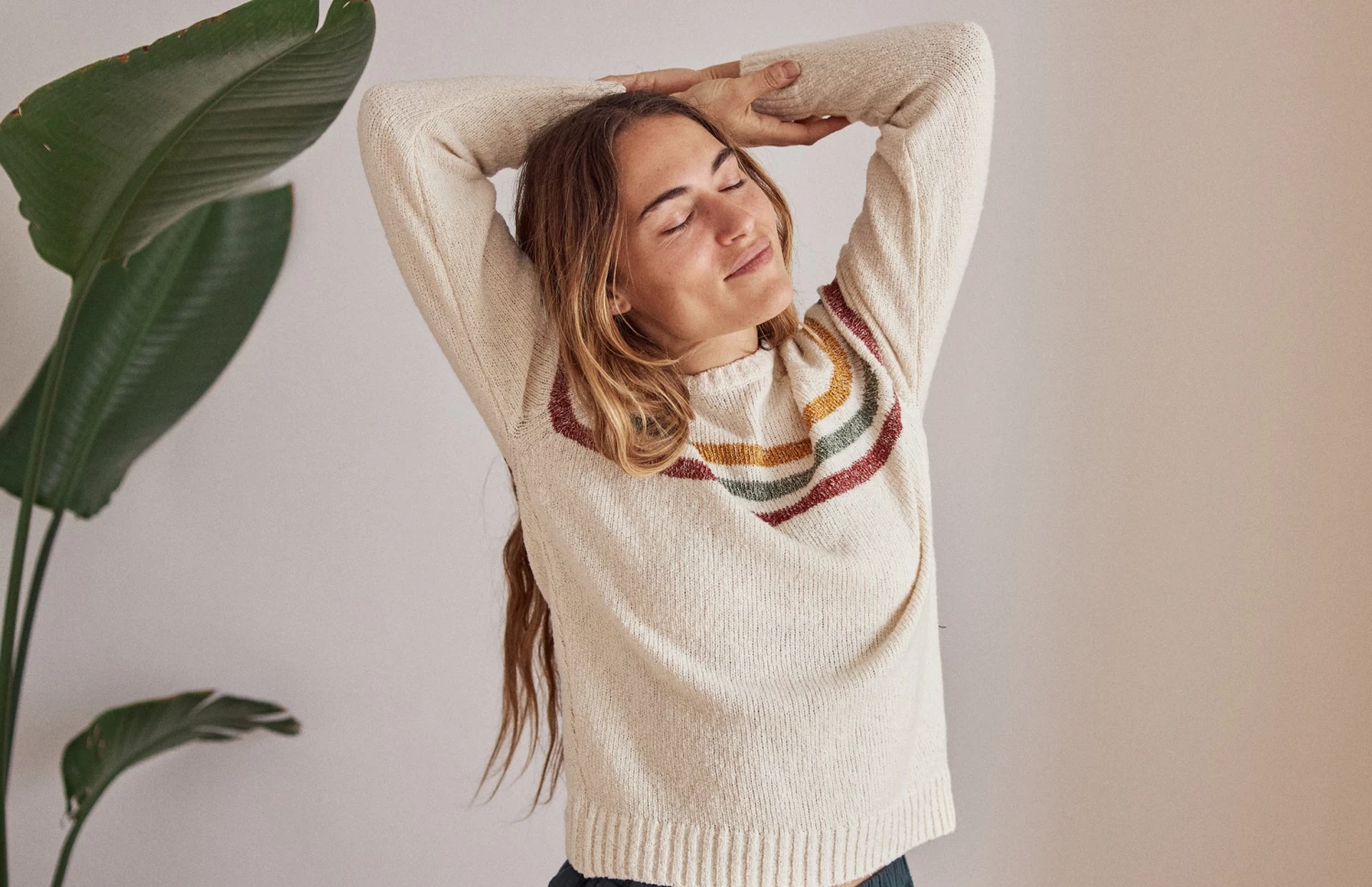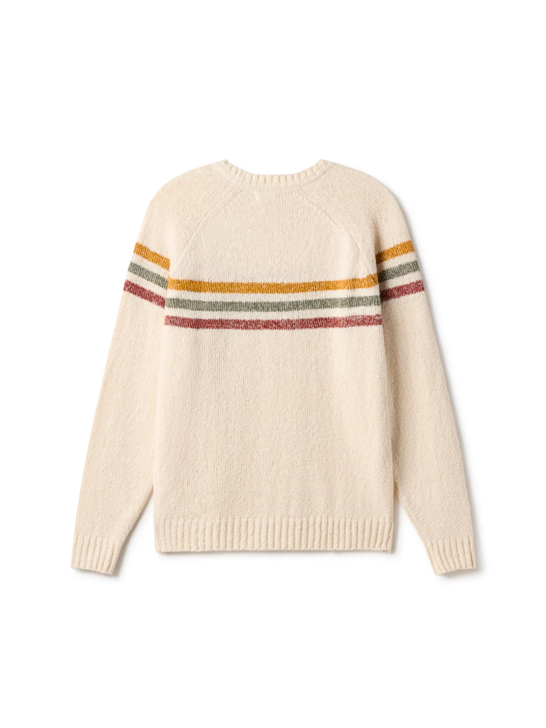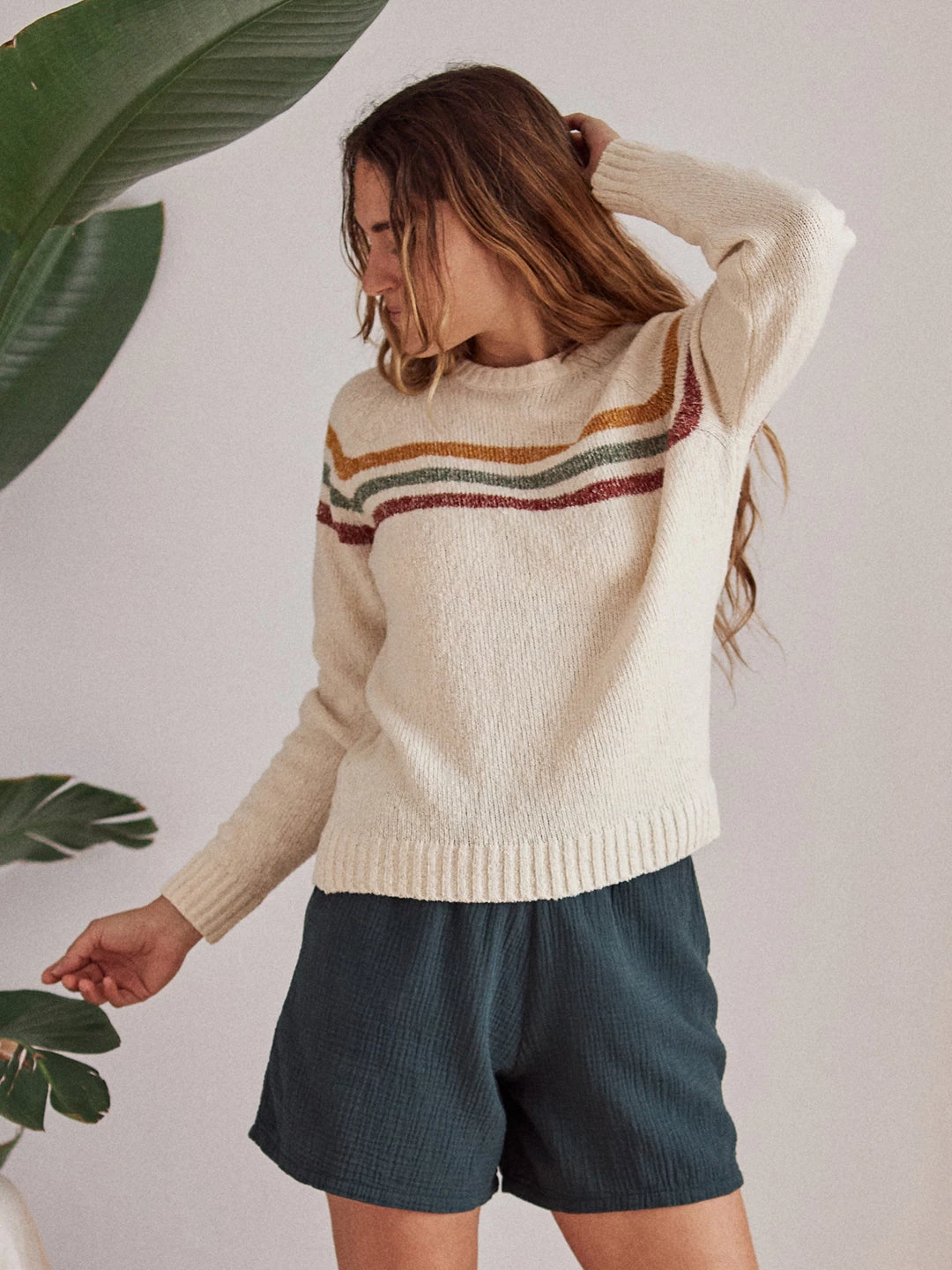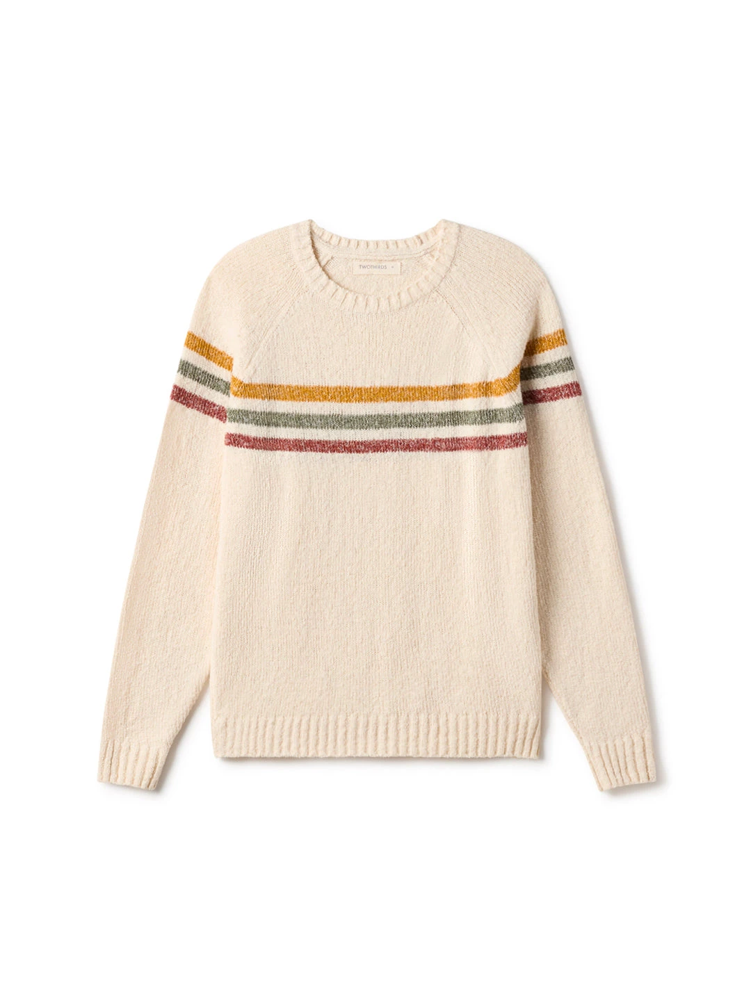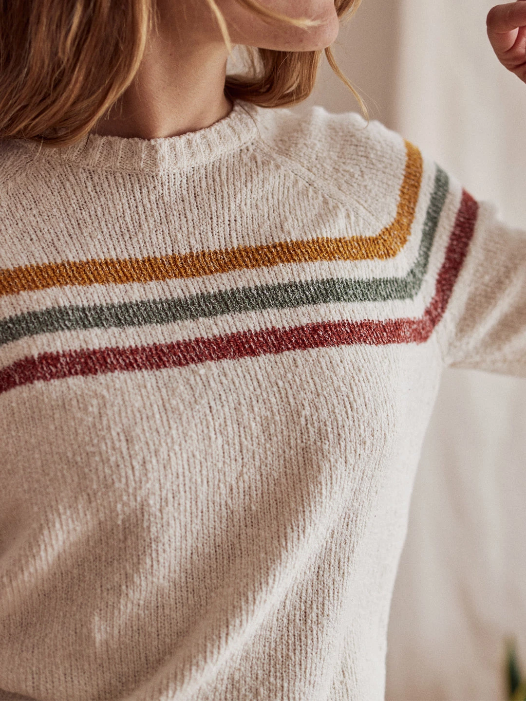 An eco-friendly knit formed of colourful stripes on a plain ecru base. A wonderful basic with a touch of colour: your go-to knit during the colder months or windy summer nights.Â