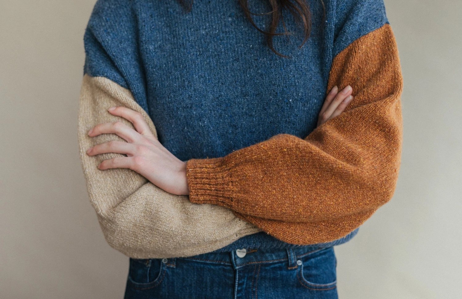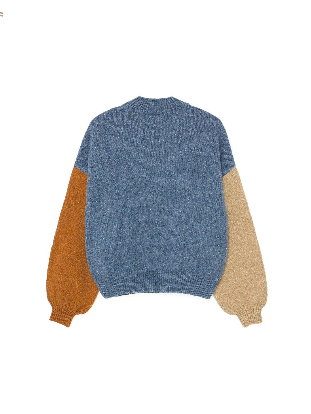 We are excited to present the Olib knit, with block colours on the sleeves bringing colour to an otherwise straightforward design. Crafted with ribbed edges, dropped shoulders and bolano sleeves. The garment is woven entirely from recycled materials, has a fairly oversized fit and hip-length cut.Â