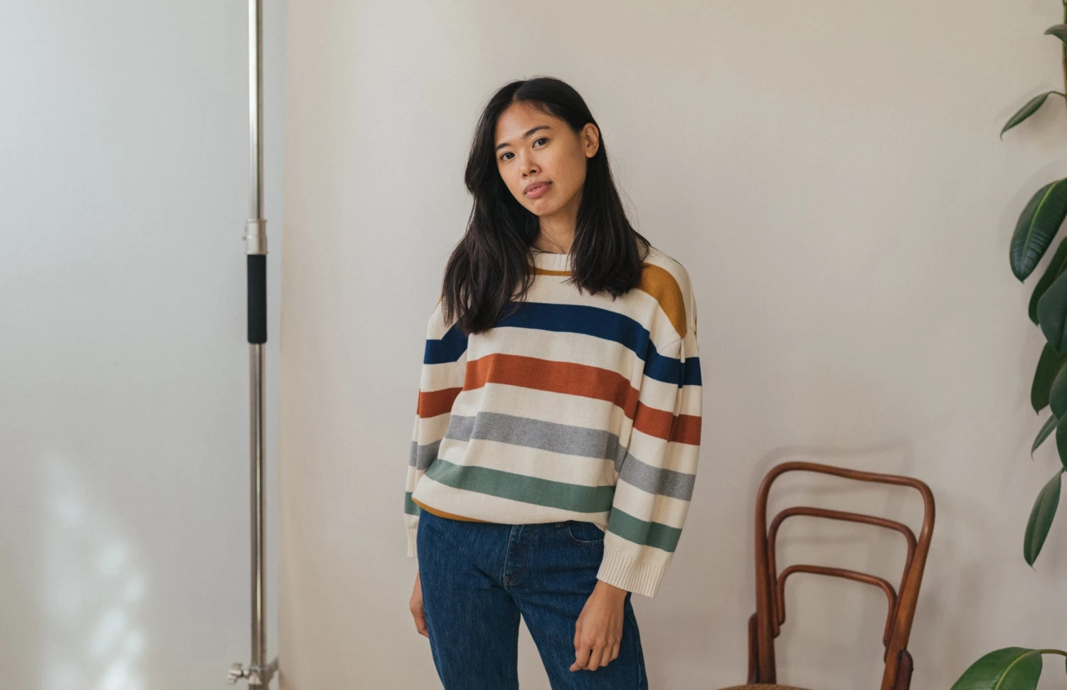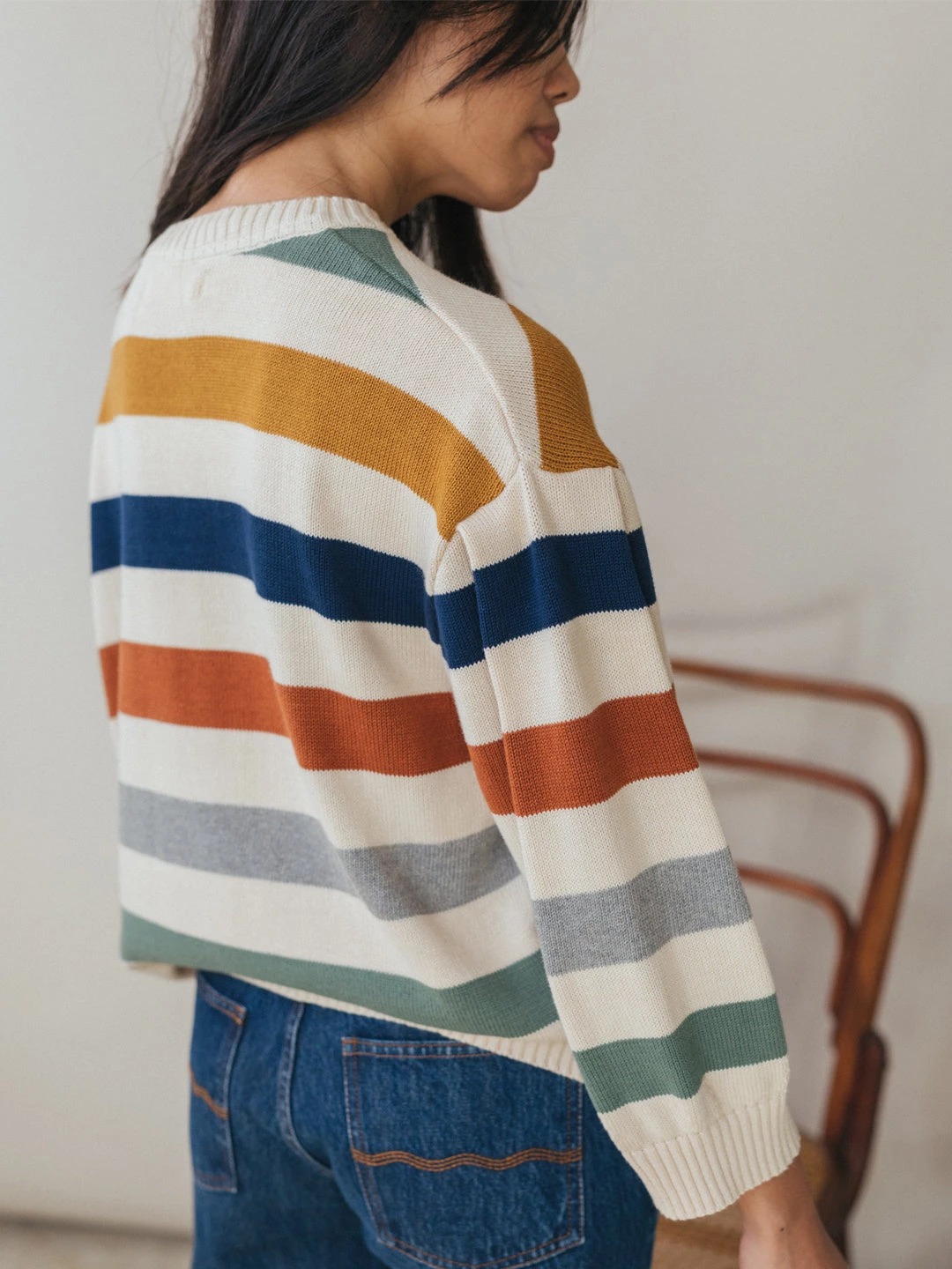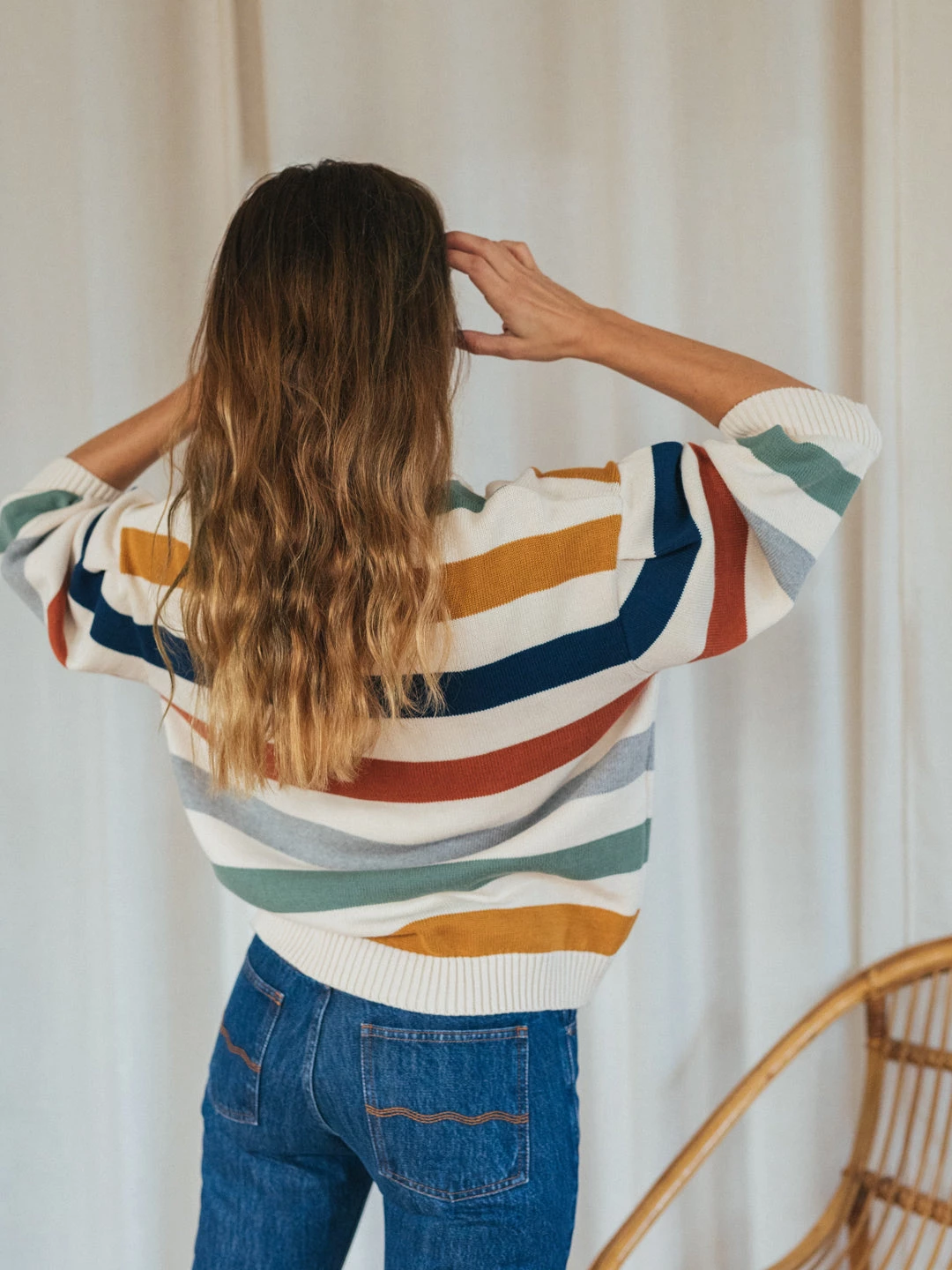 Adding to this season’s collection: our playful and colourful San Marino knit. A long-sleeve knit with block colour stripes, puffed sleeves, a fairly loose fit and hip-length.