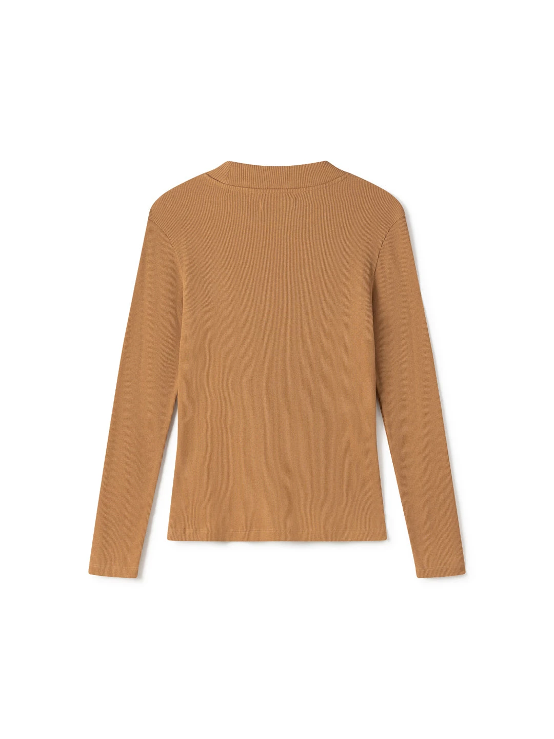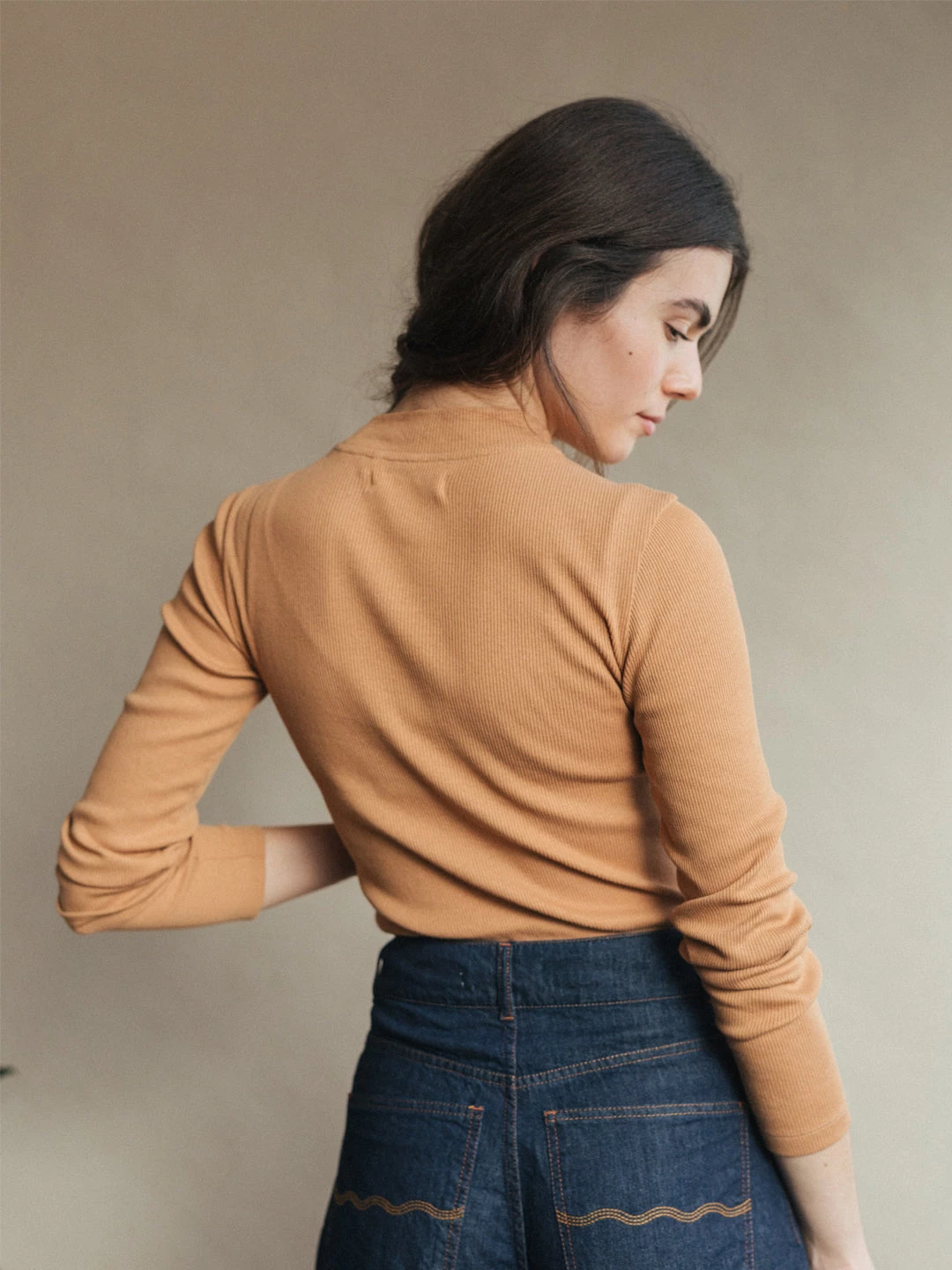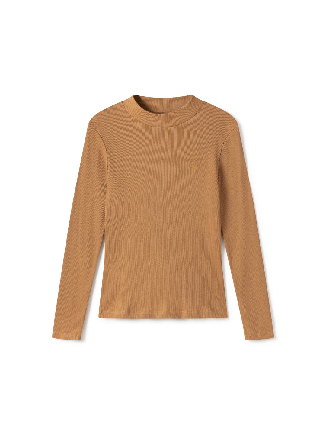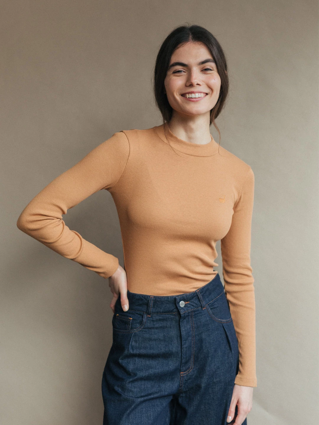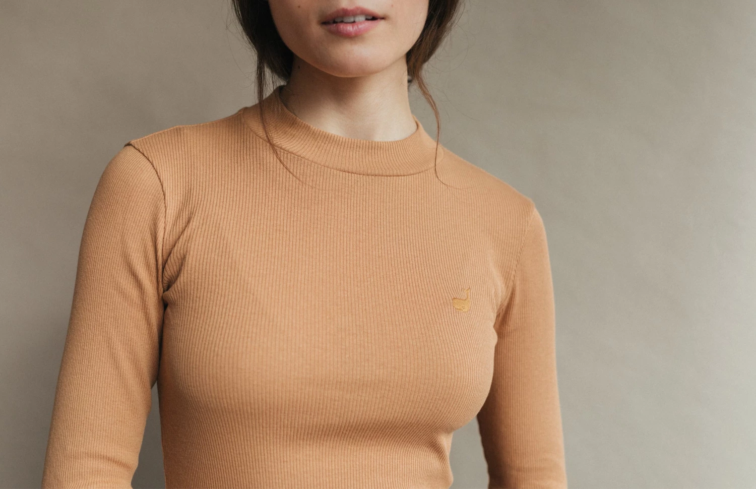 Here’s the Kosrae t-shirt, in a beautiful earth colour. Soft, gentle to the skin and sustainably produced. This top is designed with a high neckline and whale embroidery on the chest. It comes in a slim fit and hip-length.