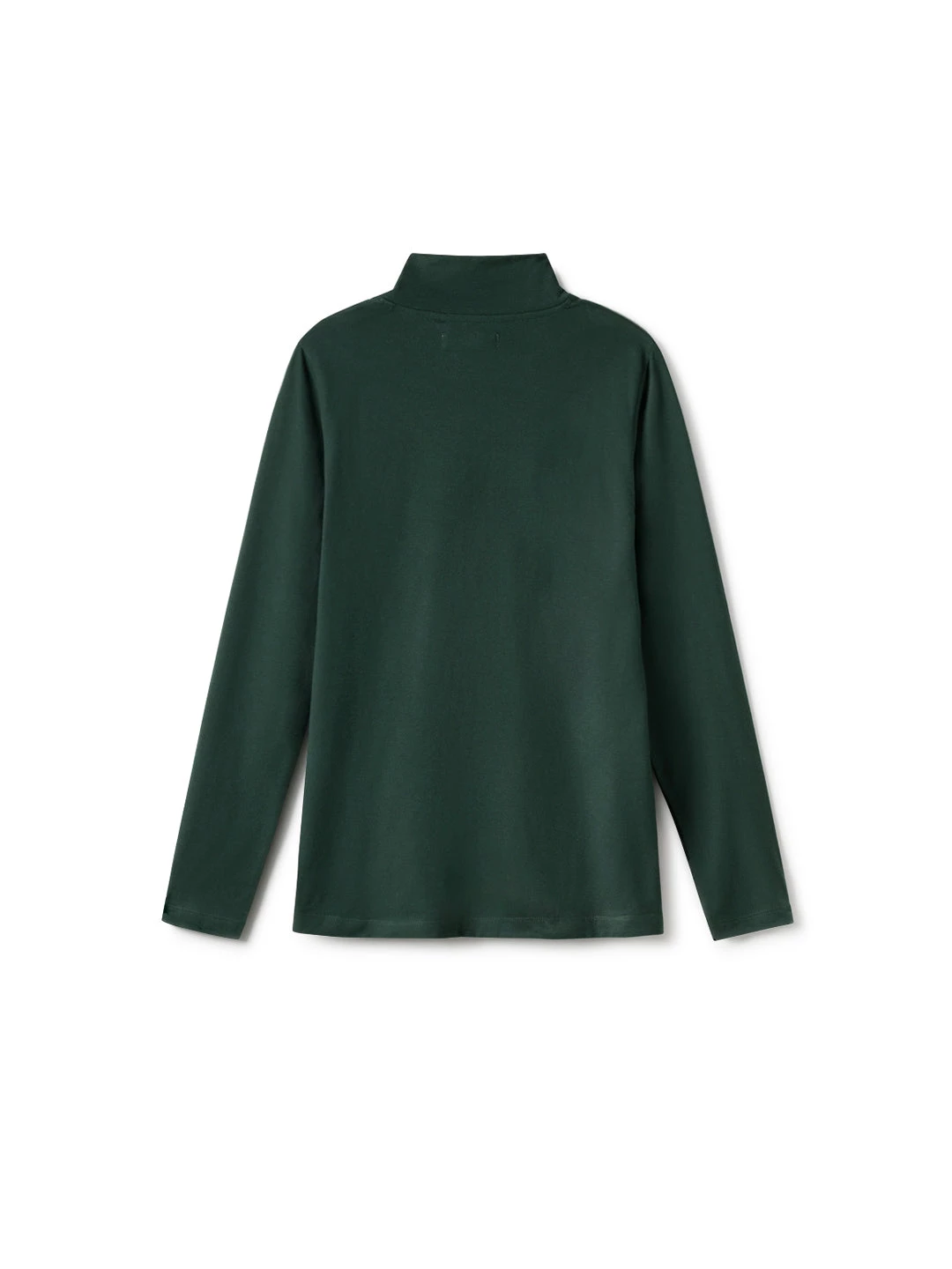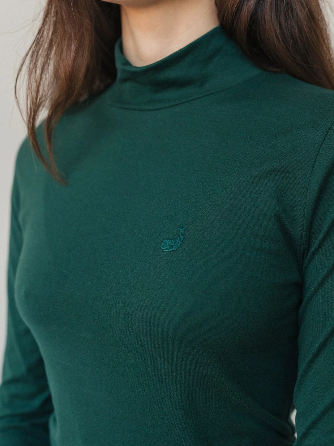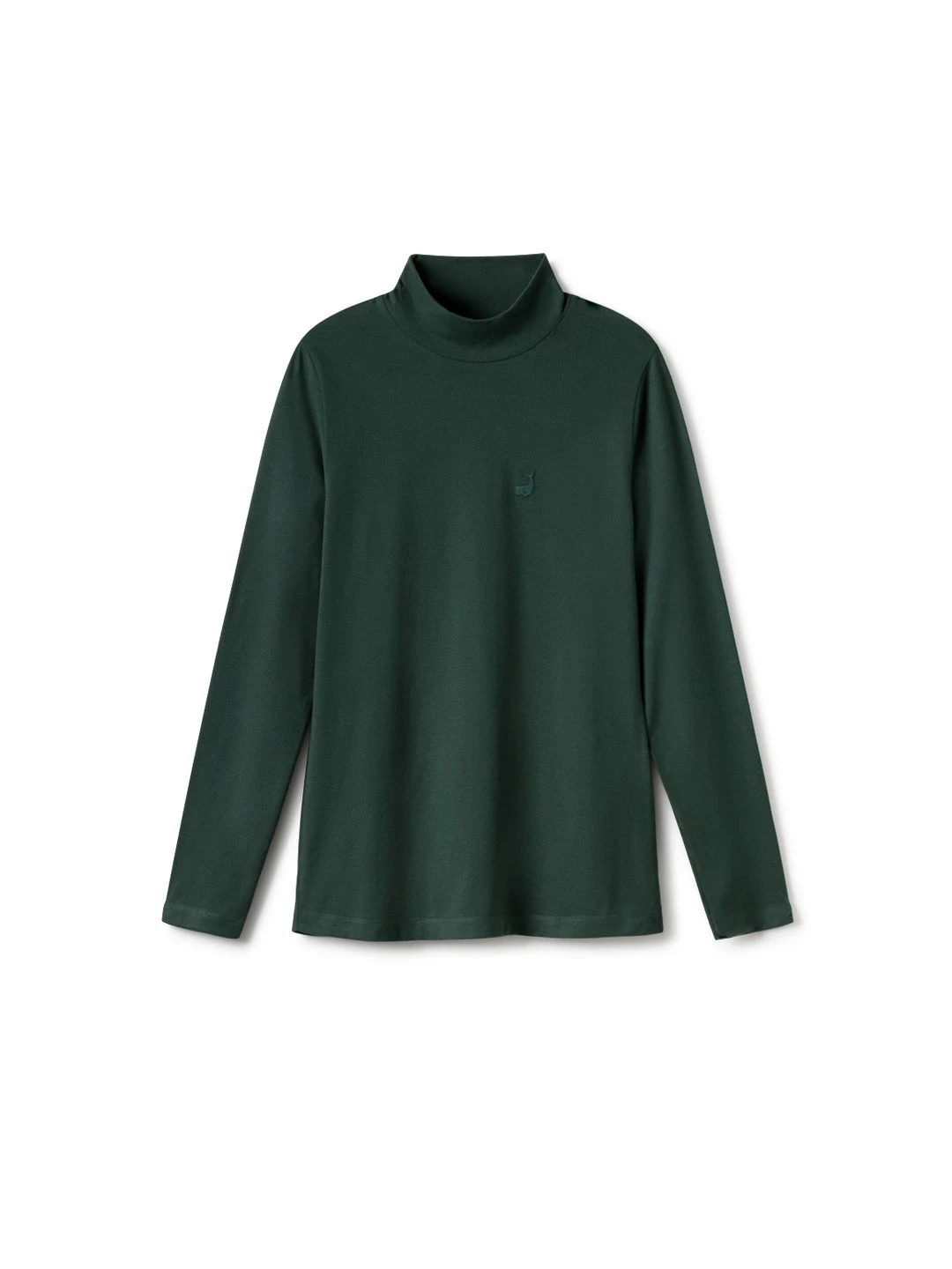 During the colder seasons feel cosy with the Cruit tee! In a mixture of organic and recycled fabrics for a soft yet durable garment. This top is designed with a turtleneck, slim fit and whale embroidery in matching colour.