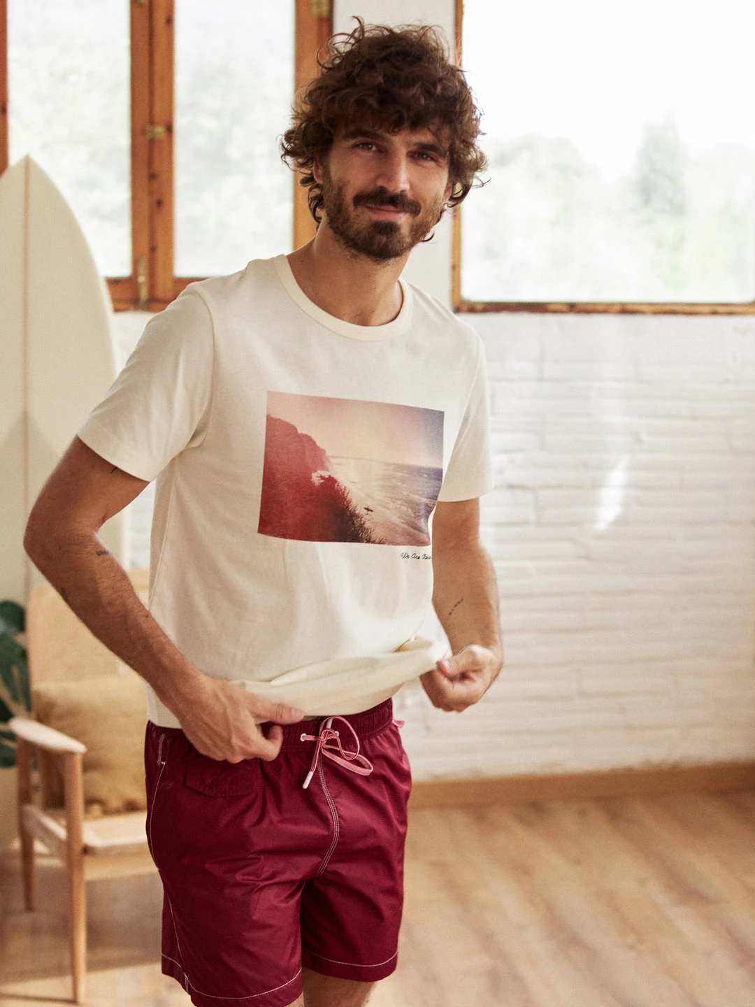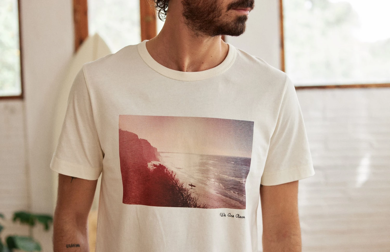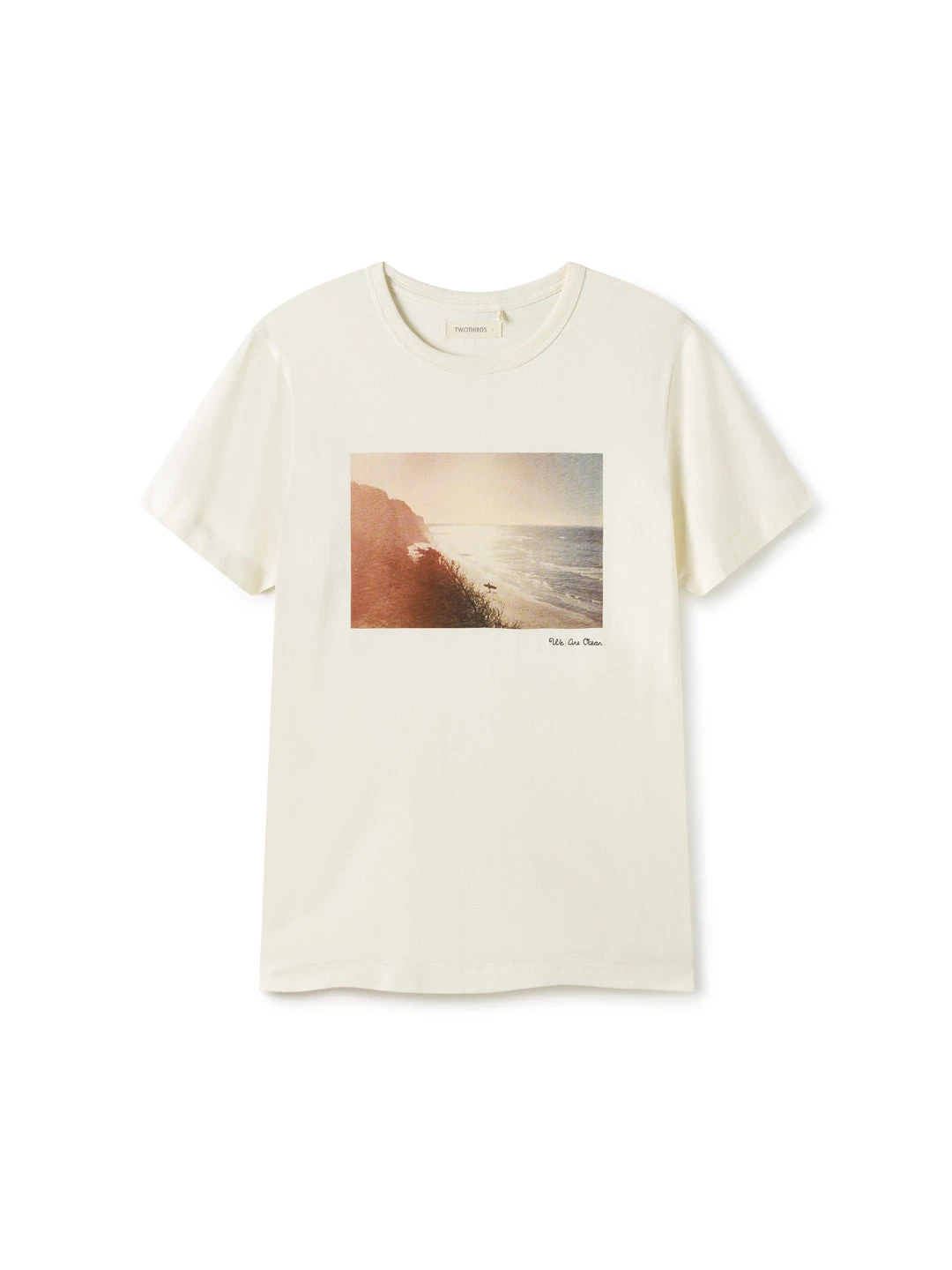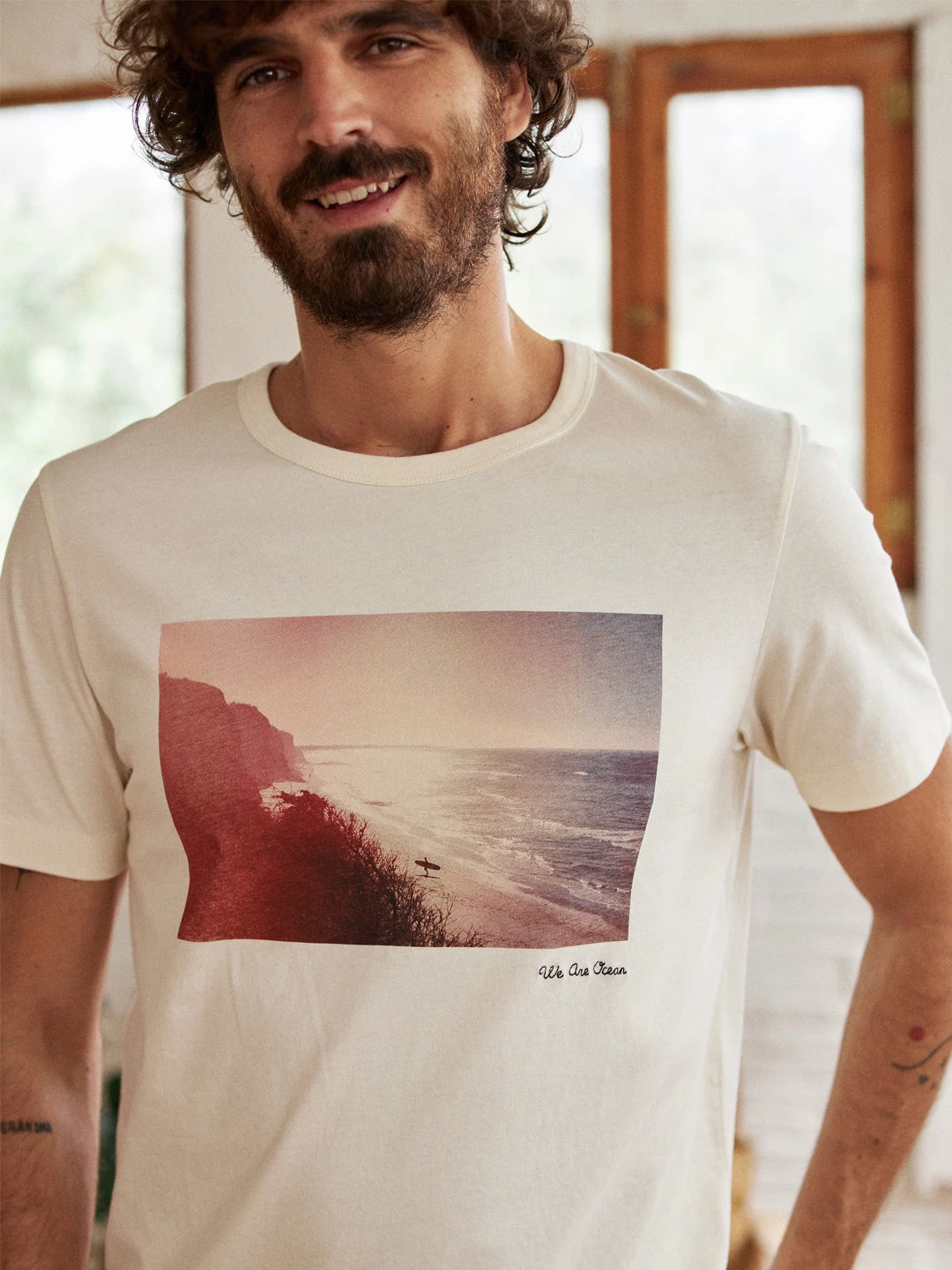 An original beach photograph by Emil Kozak sets the Nelson t-shirt alight. Designed with “We are Ocean” text embroidered below. Also, a triangular label at the bottom side. The tee has a ribbed neckline, a regular fit and hip-length.