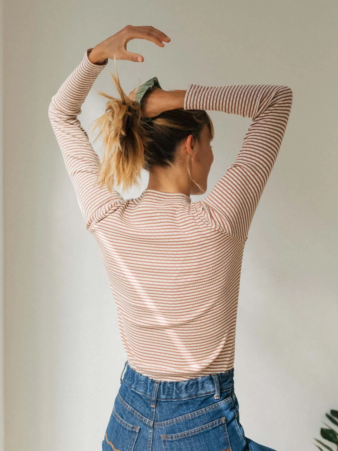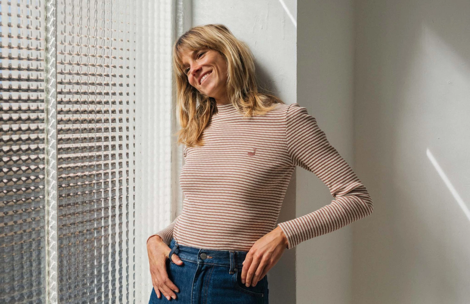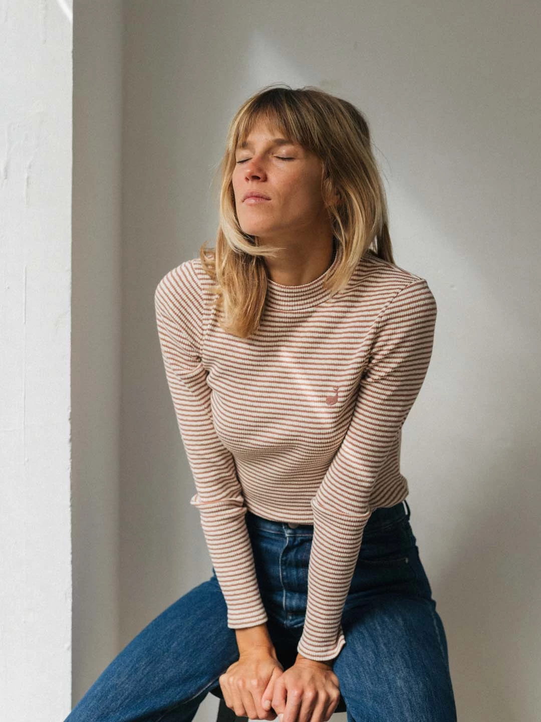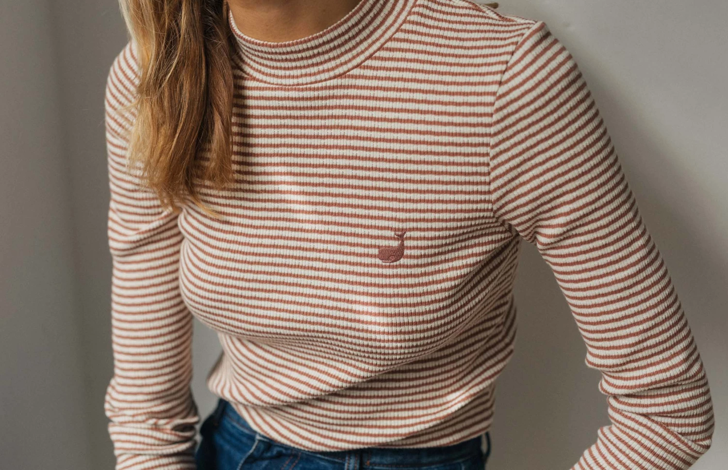 Beautiful stripes on a sumptuously soft fabric: the Ramadas tee. Made with a high ribbed neckline and slim fit to hug the body and give you a nice cosy feeling. The top also features whale embroidery on the chest.