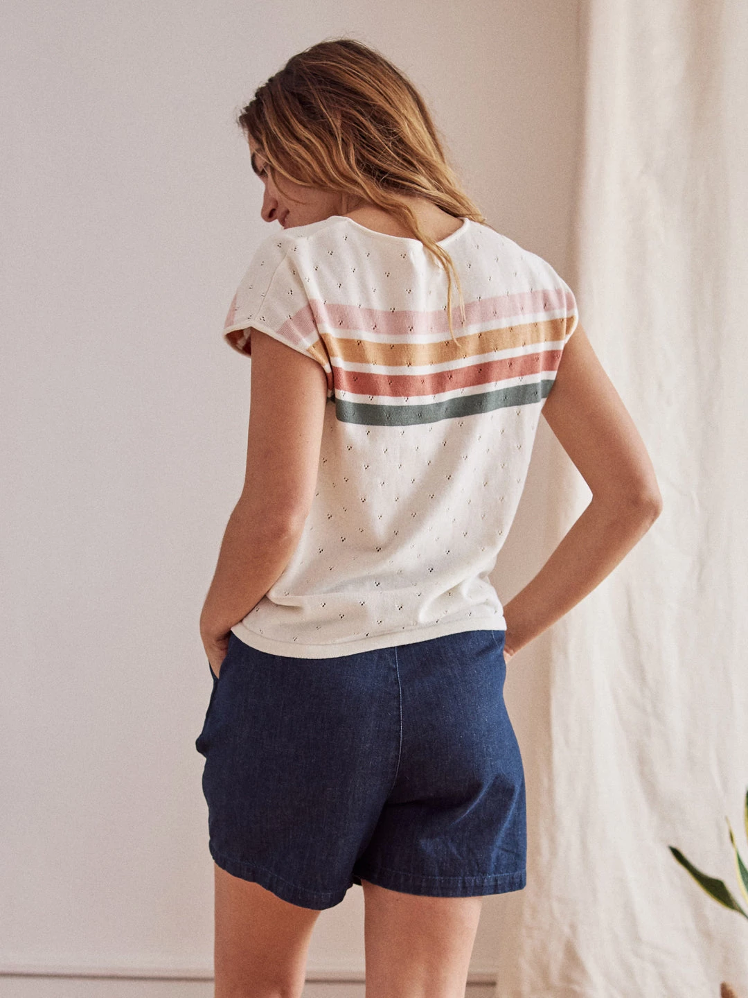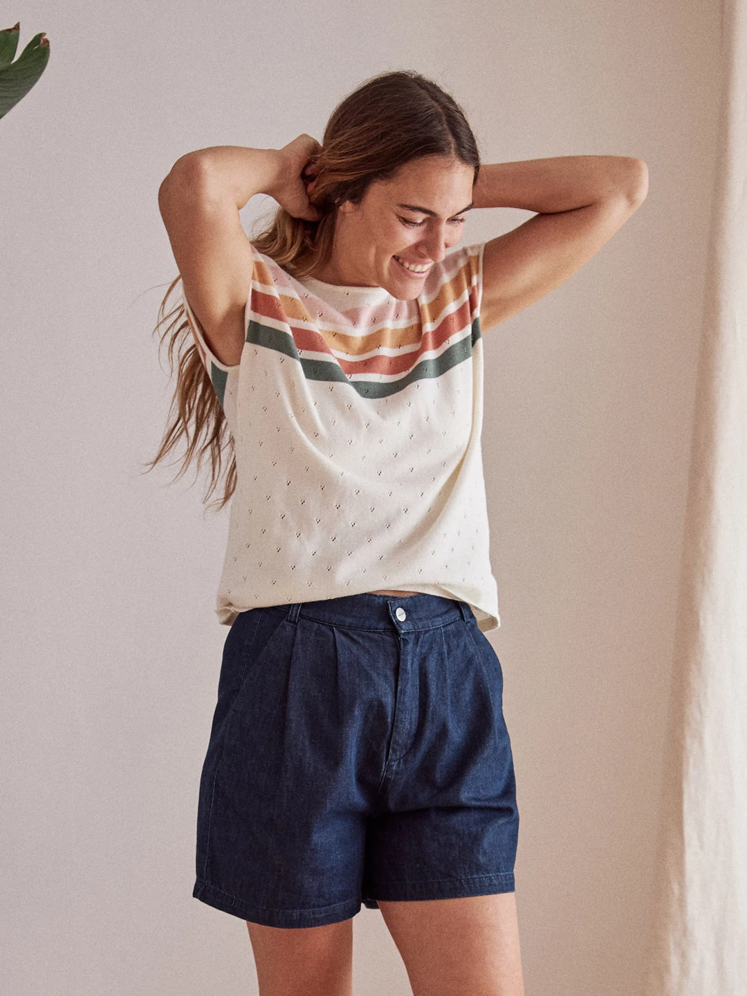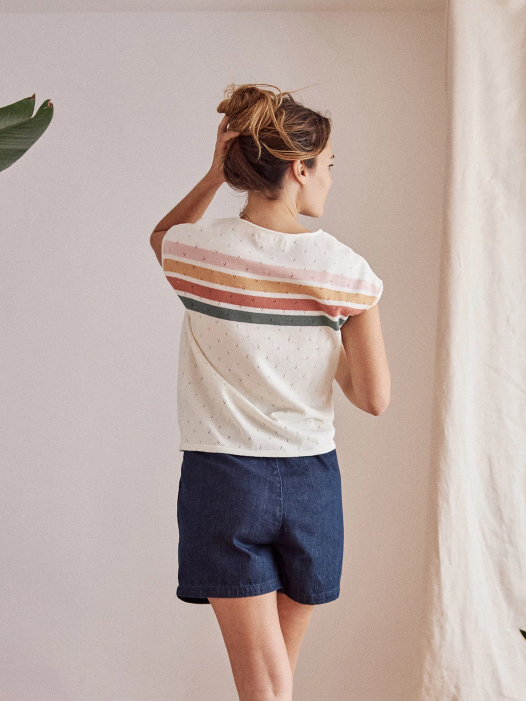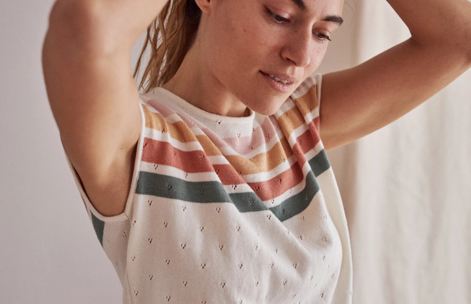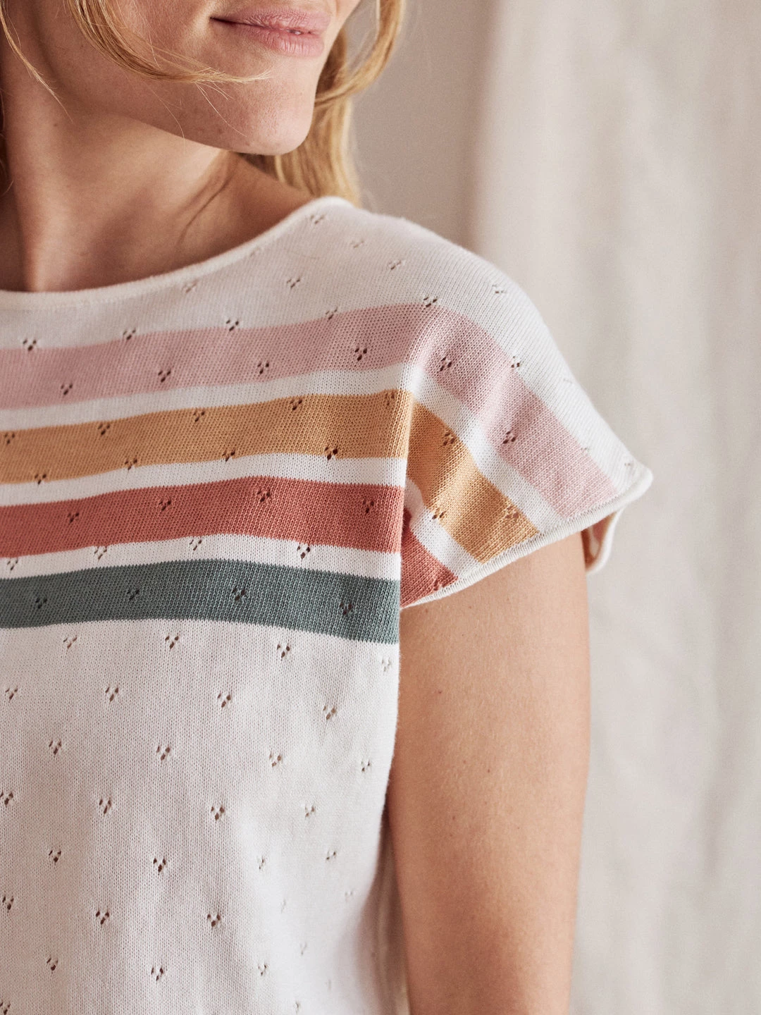 We are excited to bring the Lastovo to our new collection, with a beautifully yarned pattern and three block colour stripes. Designed with a slightly loose fit, hip length and short dropped shoulders.