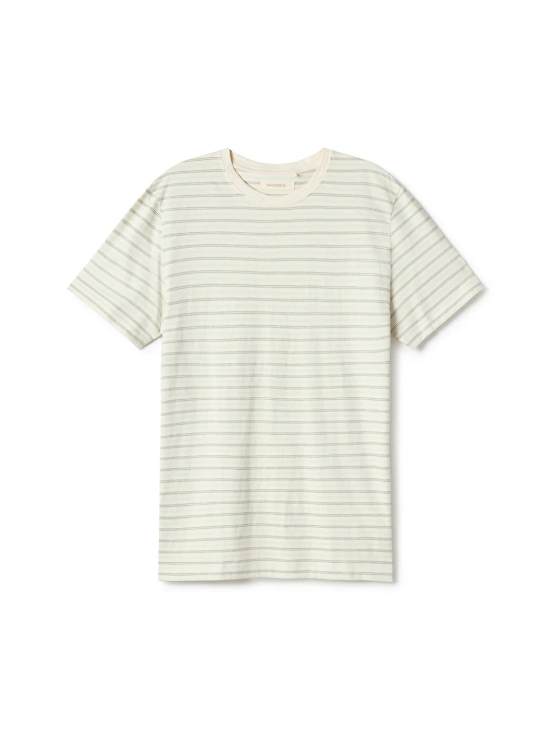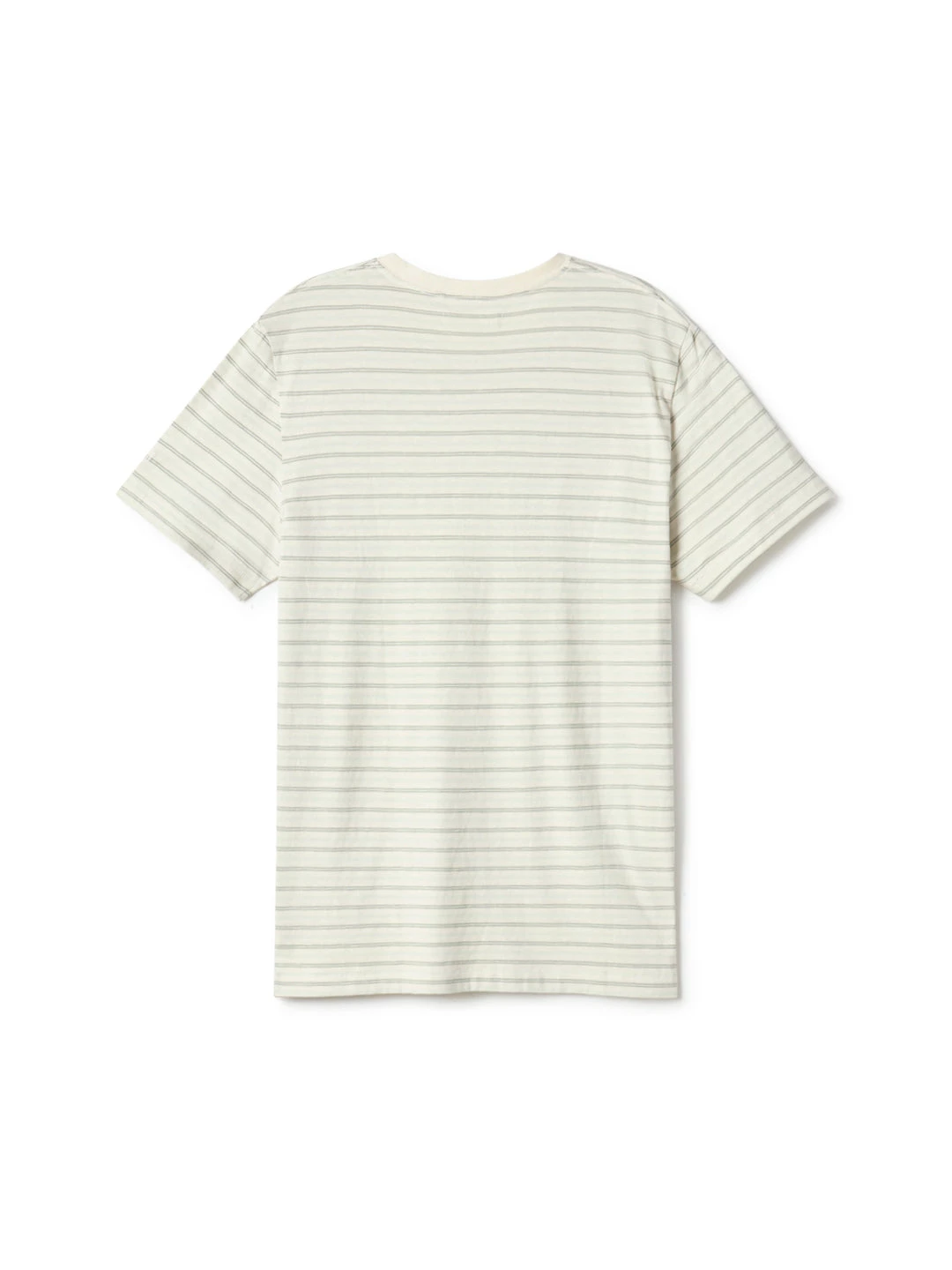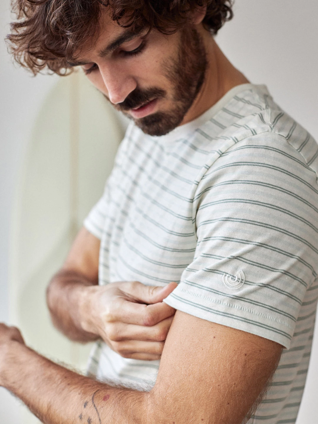 If you already know our brand, you know we love a stripes style tee – hence the Livingstone. A simple yet beautiful t-shirt, featuring thin beige coloured stripes. In a regular fit and hip length cut. Also, a ribbed neckline and a small triangular label with our logo on the bottom left side.