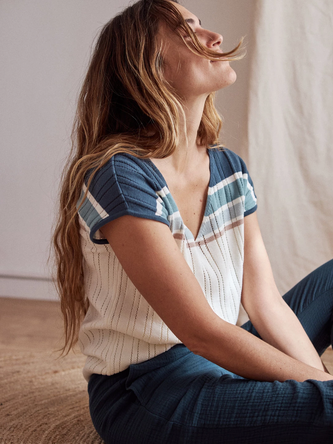 Here’s the Loppa, a soft eco-friendly top. It comes with beautiful contrasting stripes and a dotted design, batwing short sleeves and V-neckline.