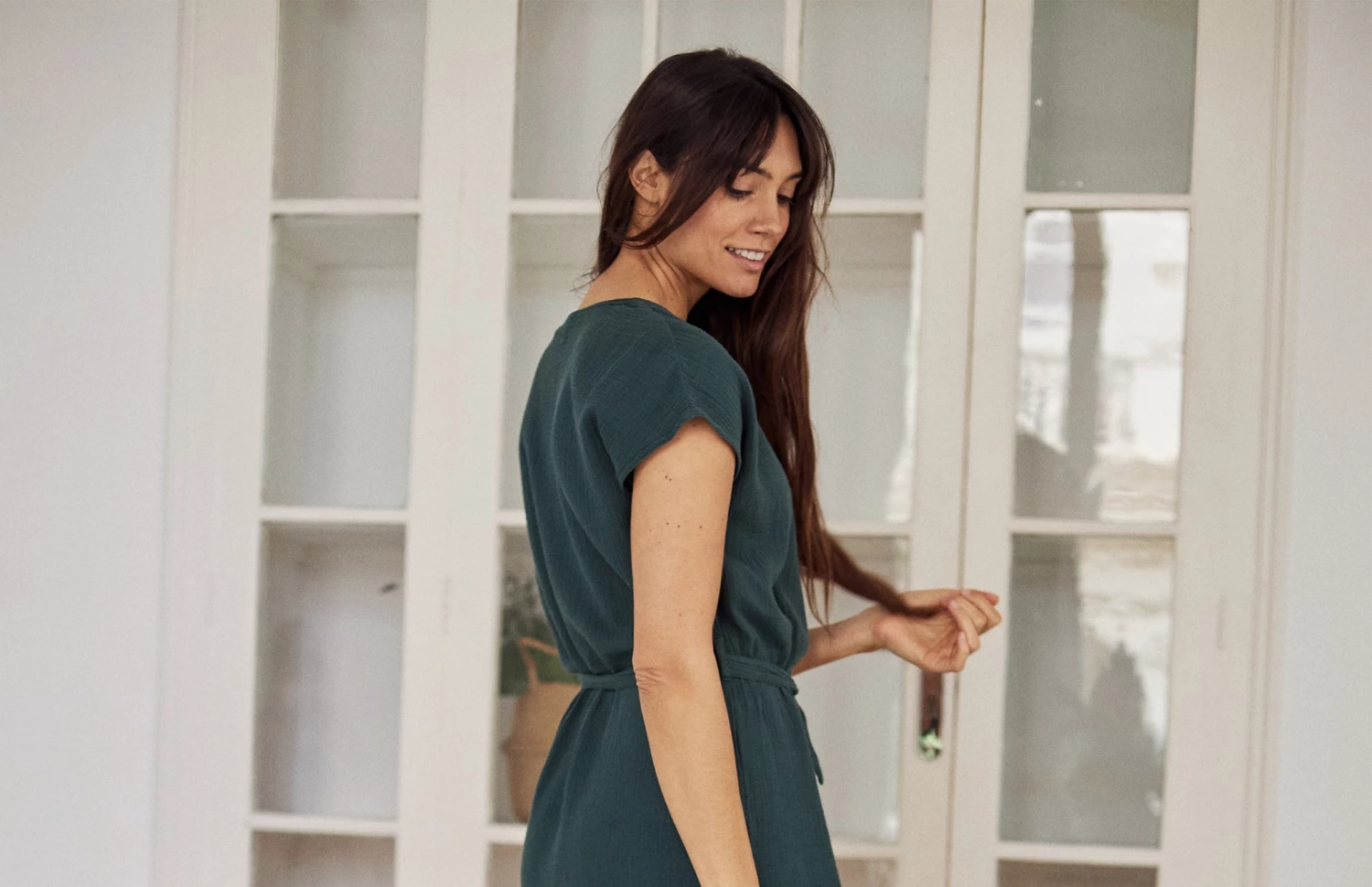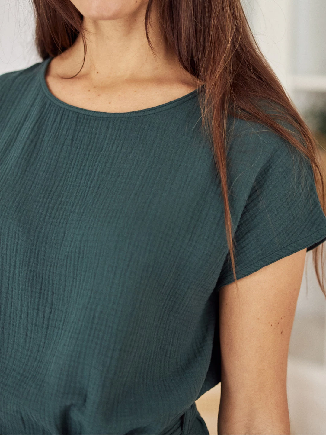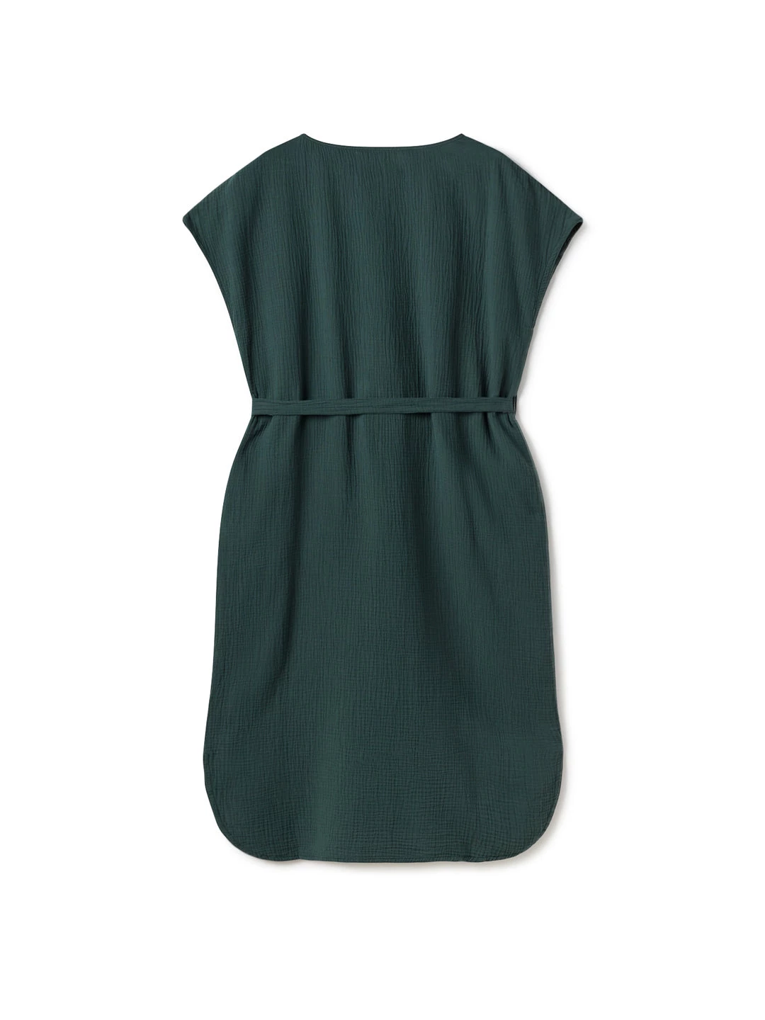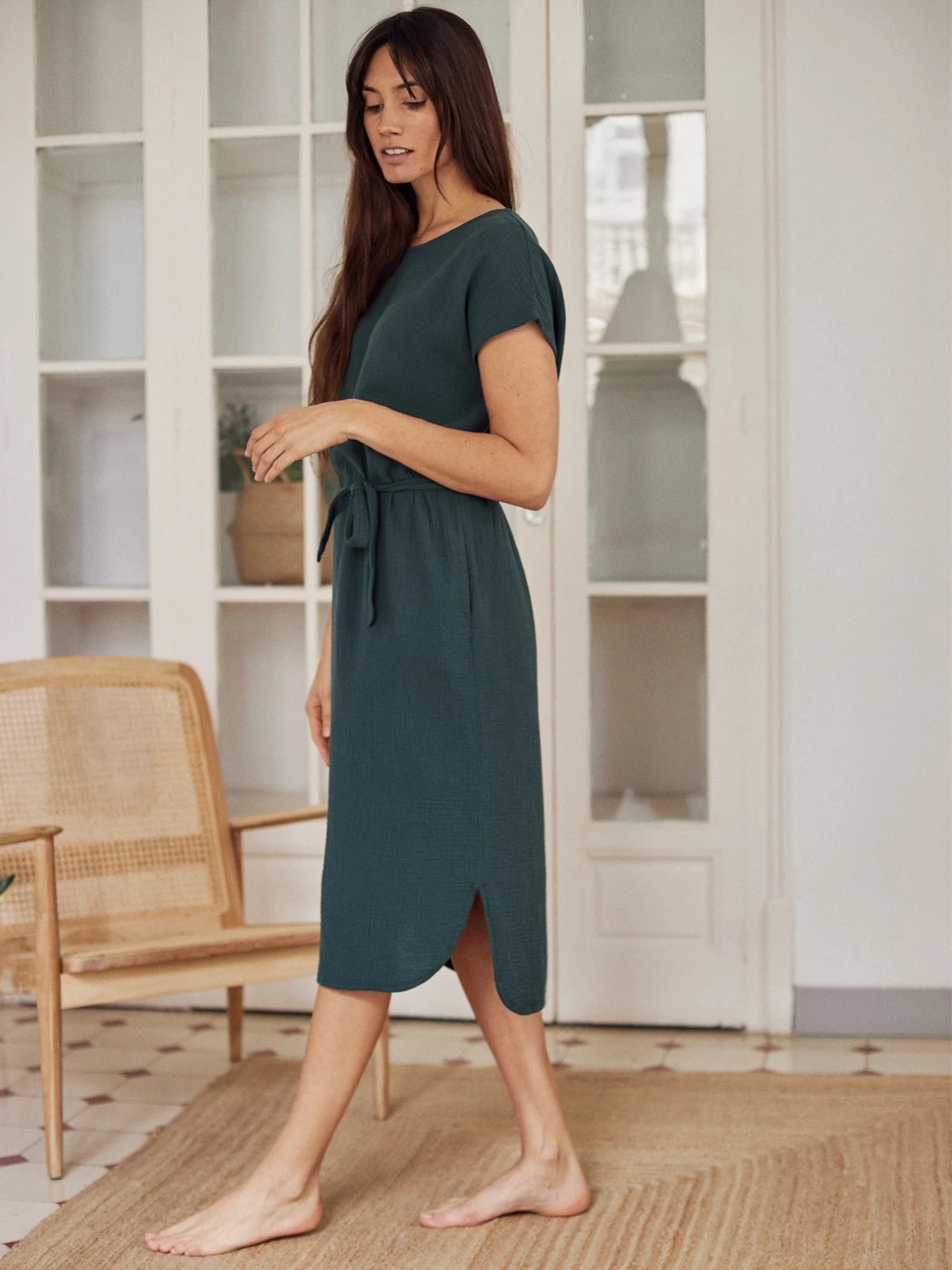 Breeze through the warmer seasons with the Maiana dress. A loose fitting style that falls slightly above-ankle length. With slide openings on the bottom sides and 2 pockets. Featuring a convenient fabric belt to adjust.Â