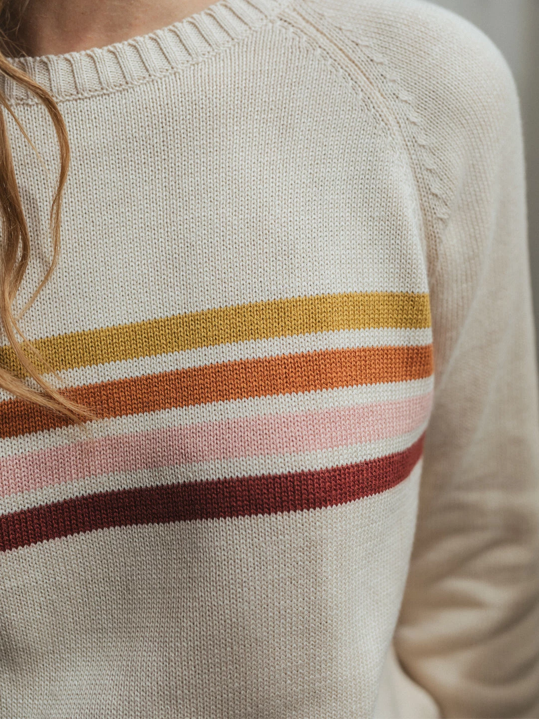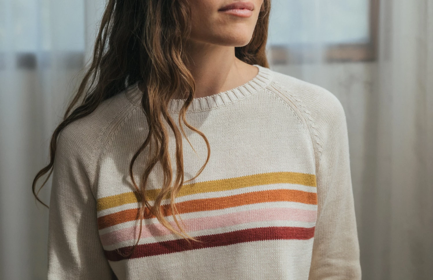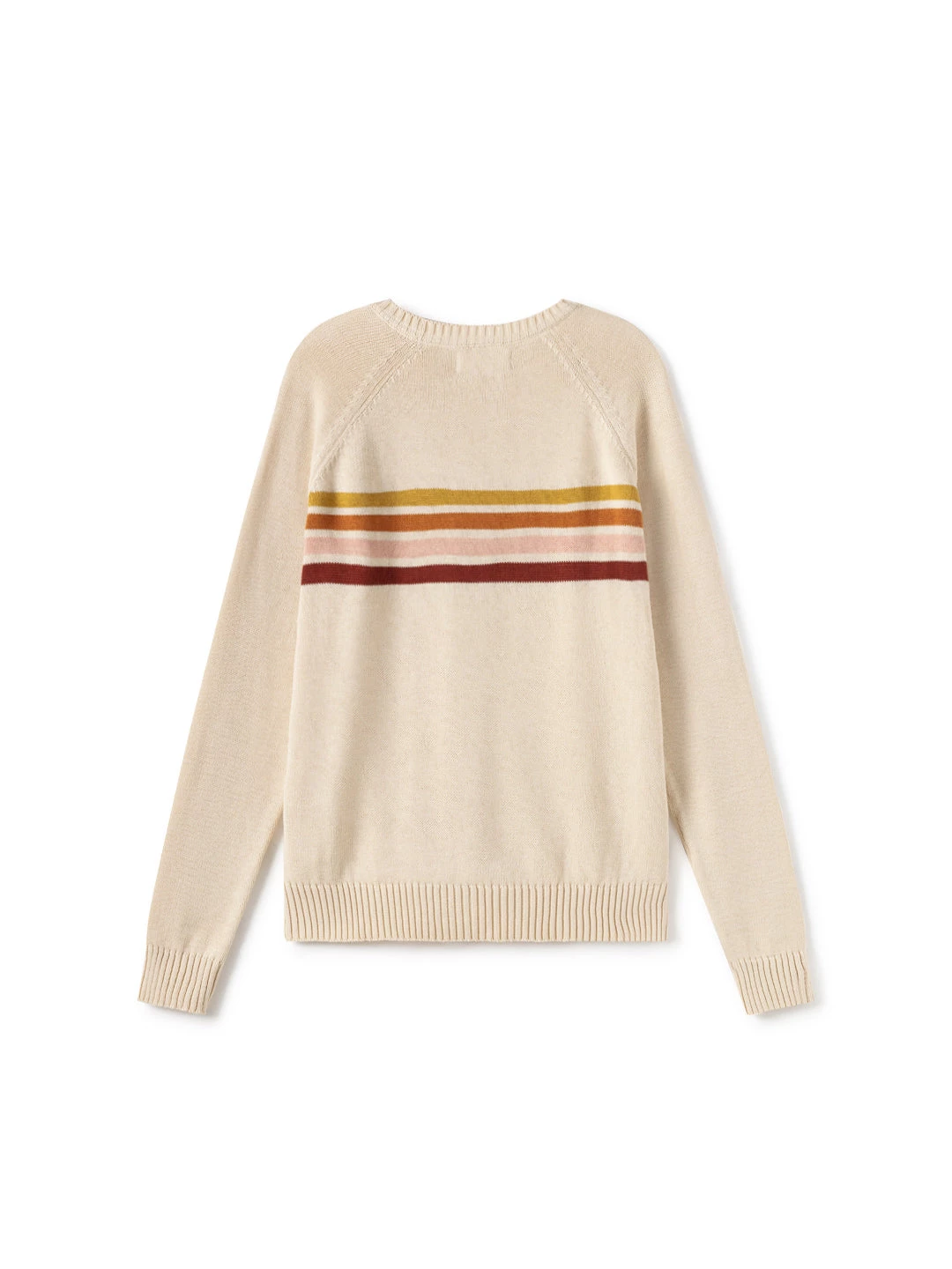 The Maracá is a playfully designed knit featuring warm earth-toned stripes. In an ecru base colour and a material that is soft and gentle on your skin. This garment has a regular fit and hip-length cut, with raw edges.
