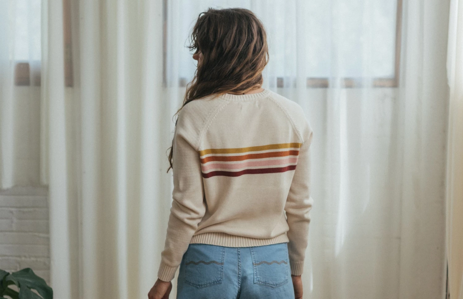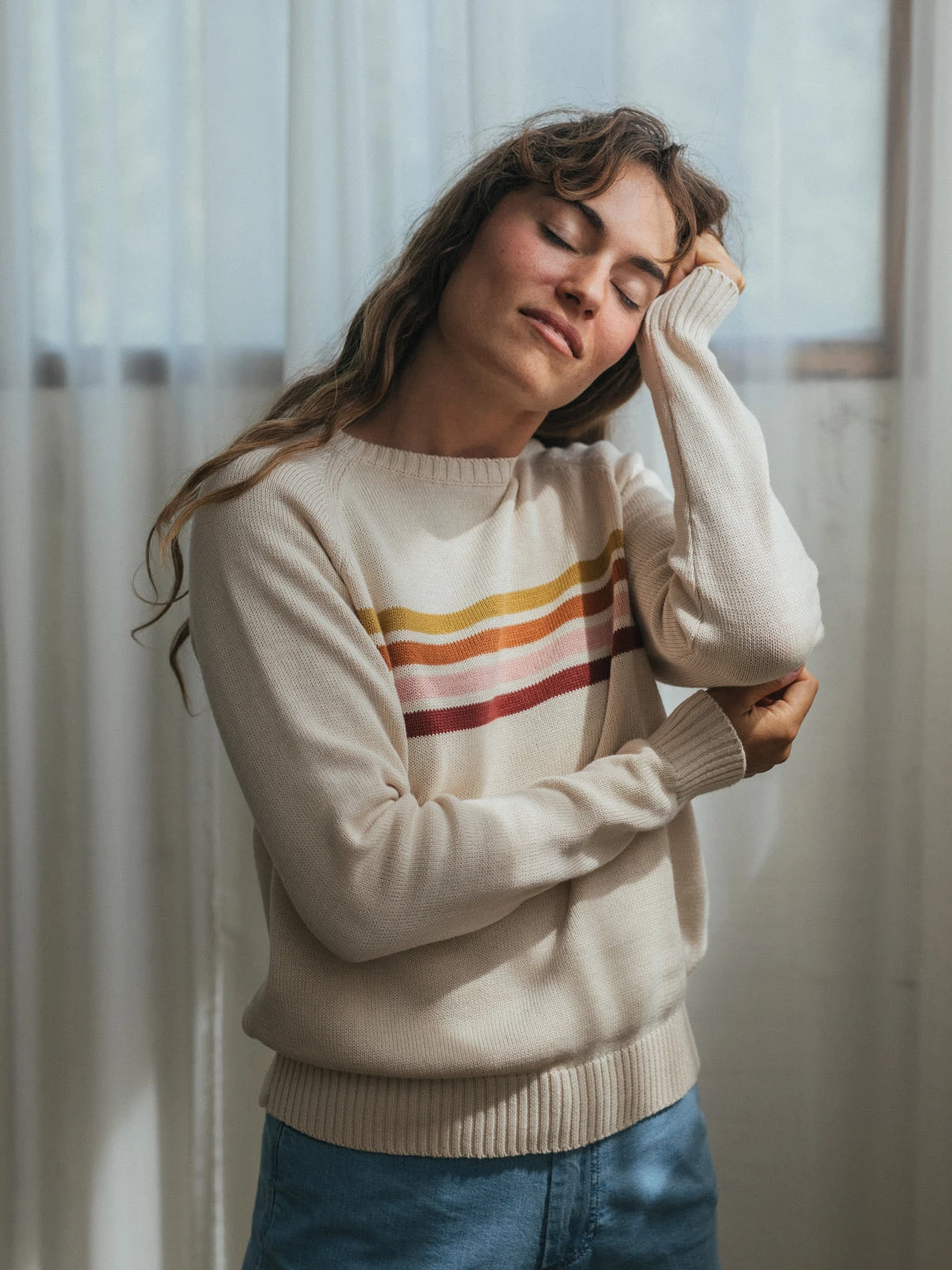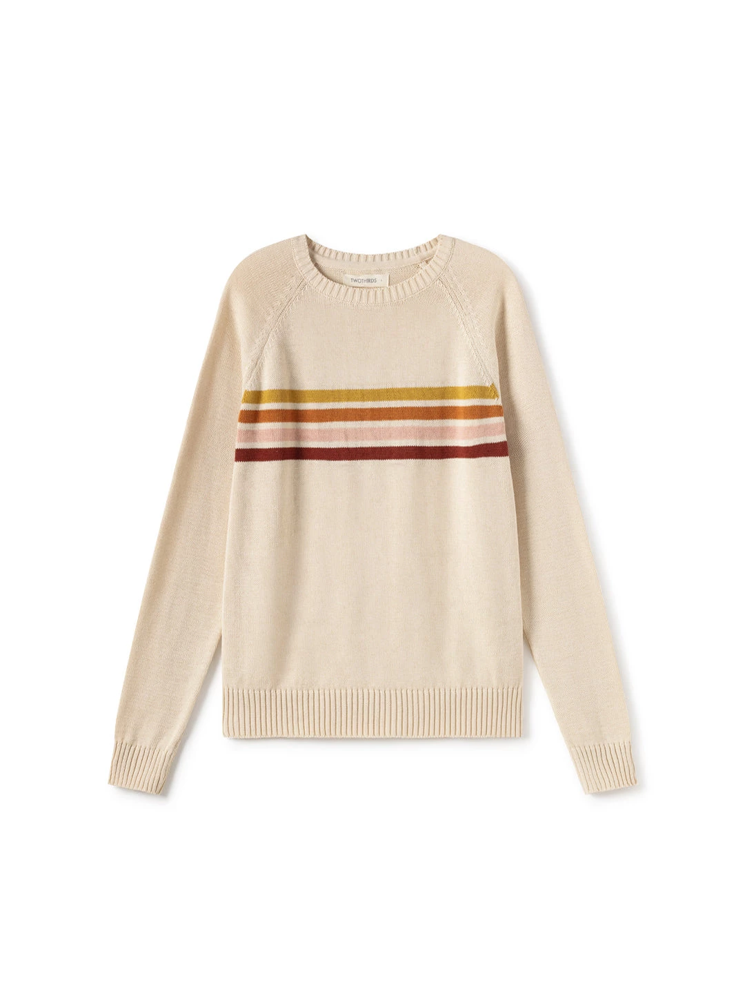 The Maracá is a playfully designed knit featuring warm earth-toned stripes. In an ecru base colour and a material that is soft and gentle on your skin. This garment has a regular fit and hip-length cut, with raw edges.