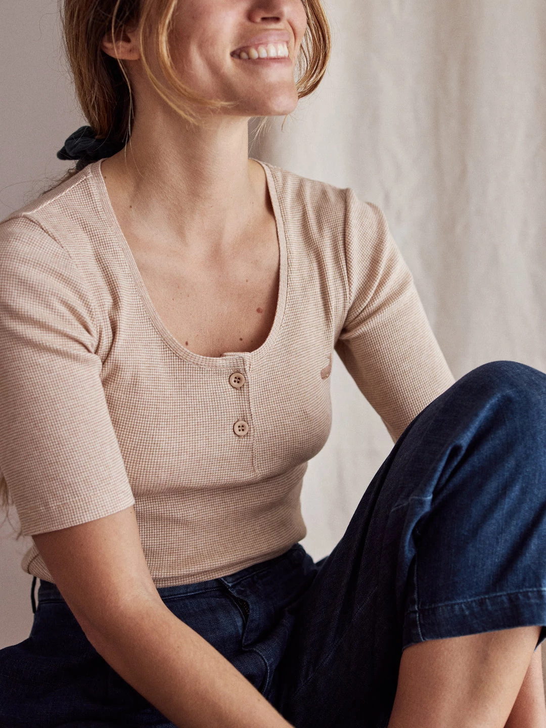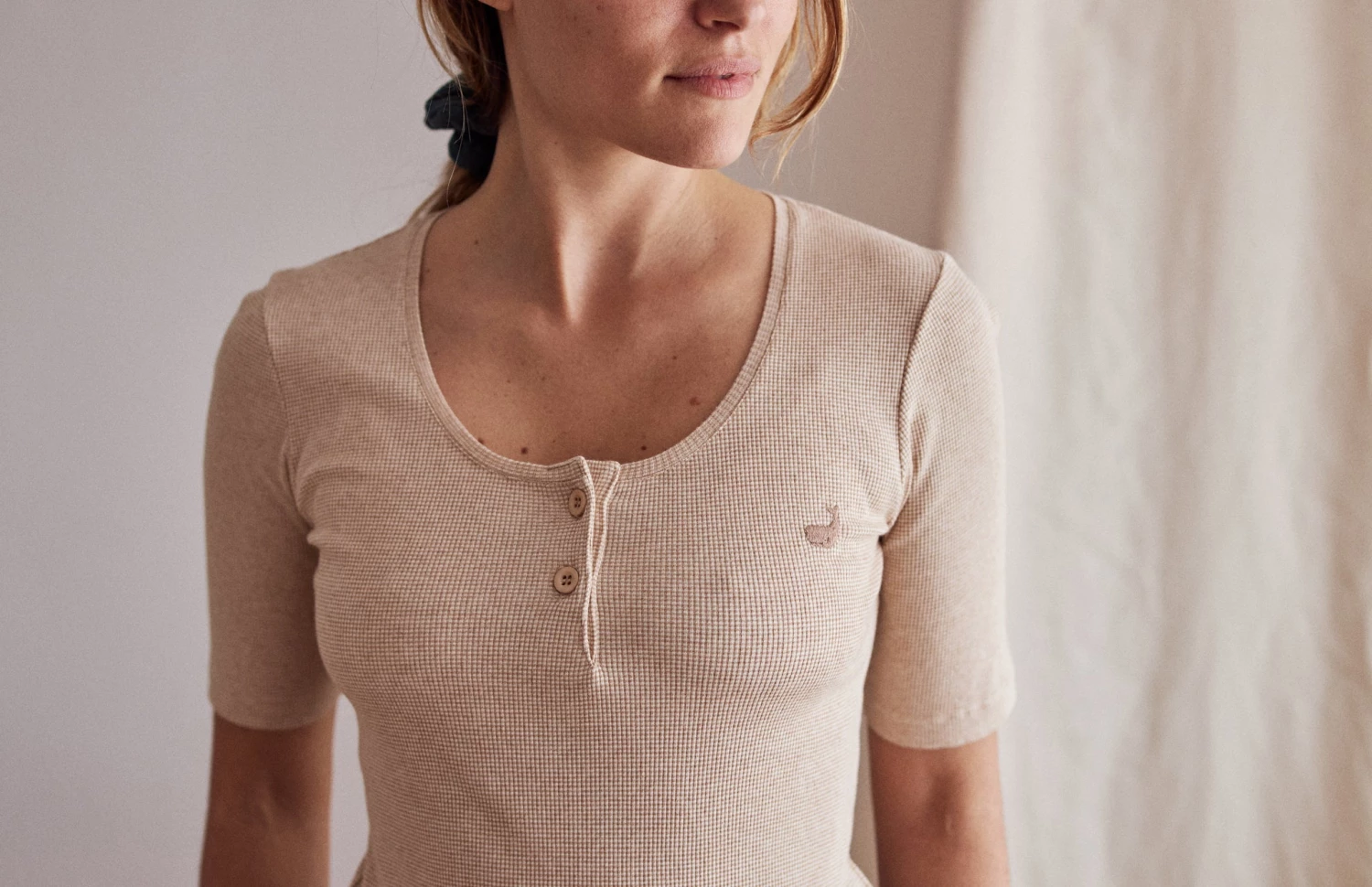 Softness comes first in the Montosa top, with a rounded neckline and naturally sourced corozo buttons. Designed with 2/4 sleeves and whale embroidery on the chest.Â