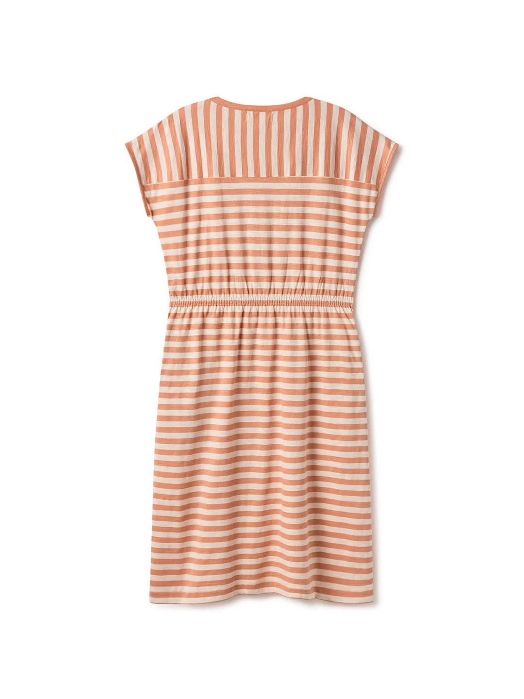 A sleeveless dress with a maritime design. Features both vertical and horizontal stripes. It comes with an elasticated waistband and whale embroidery.