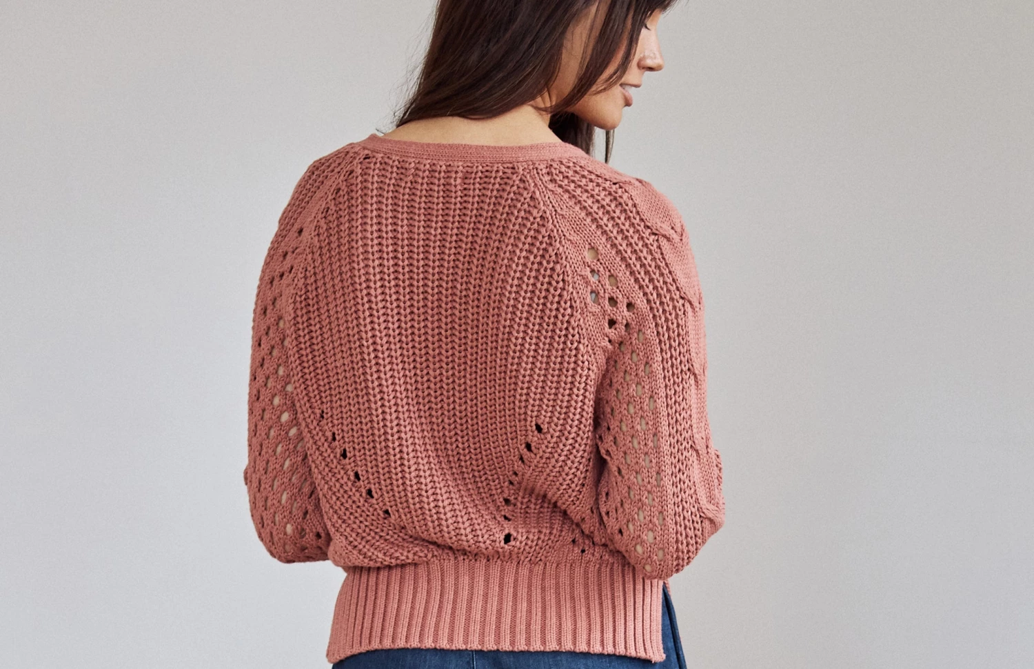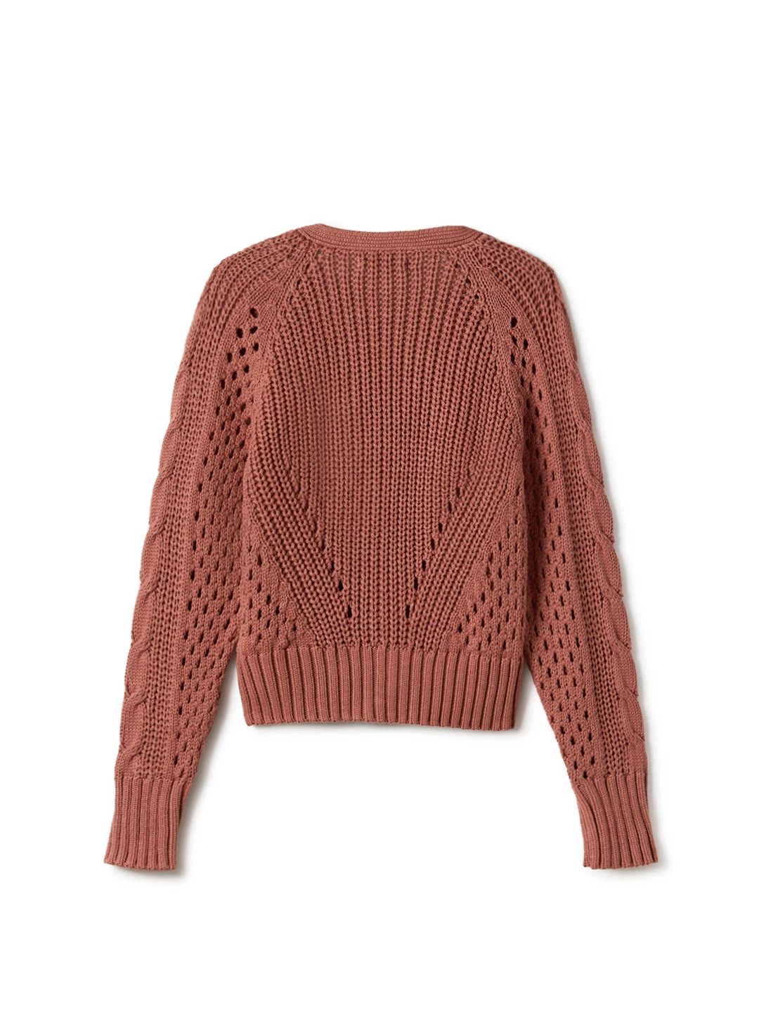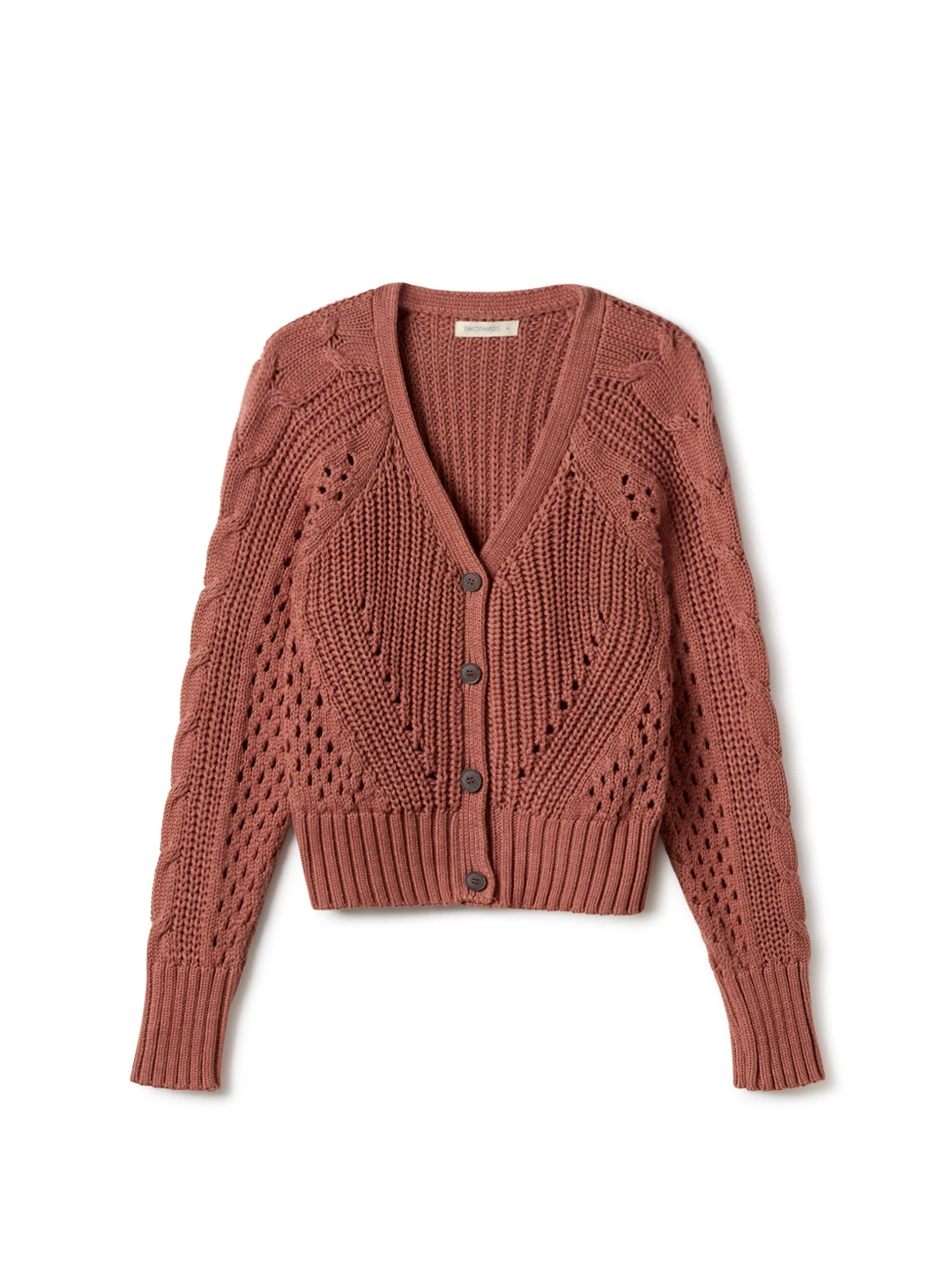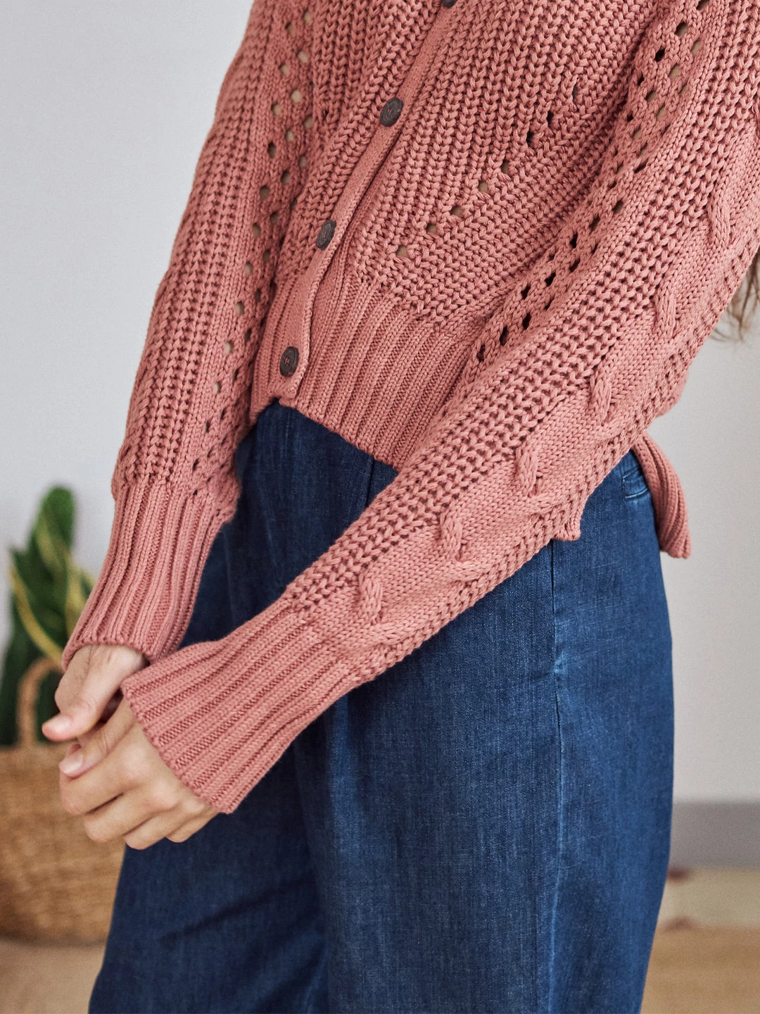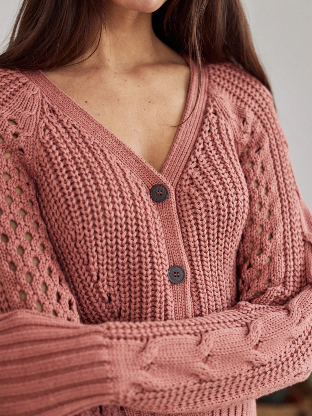 A soft cardigan with a beautiful knitted pattern, naturally sourced corozo buttons and ribbed edges with an opened v-neckline.Â
