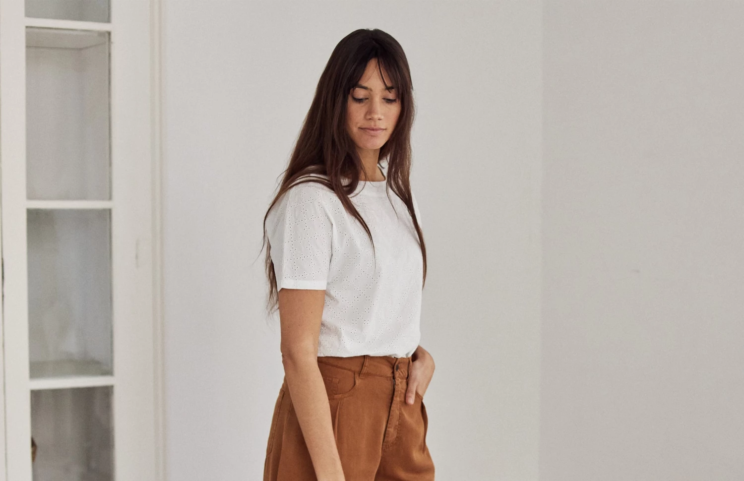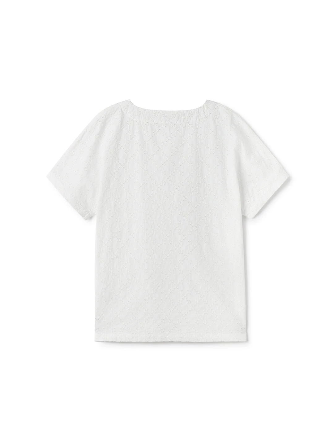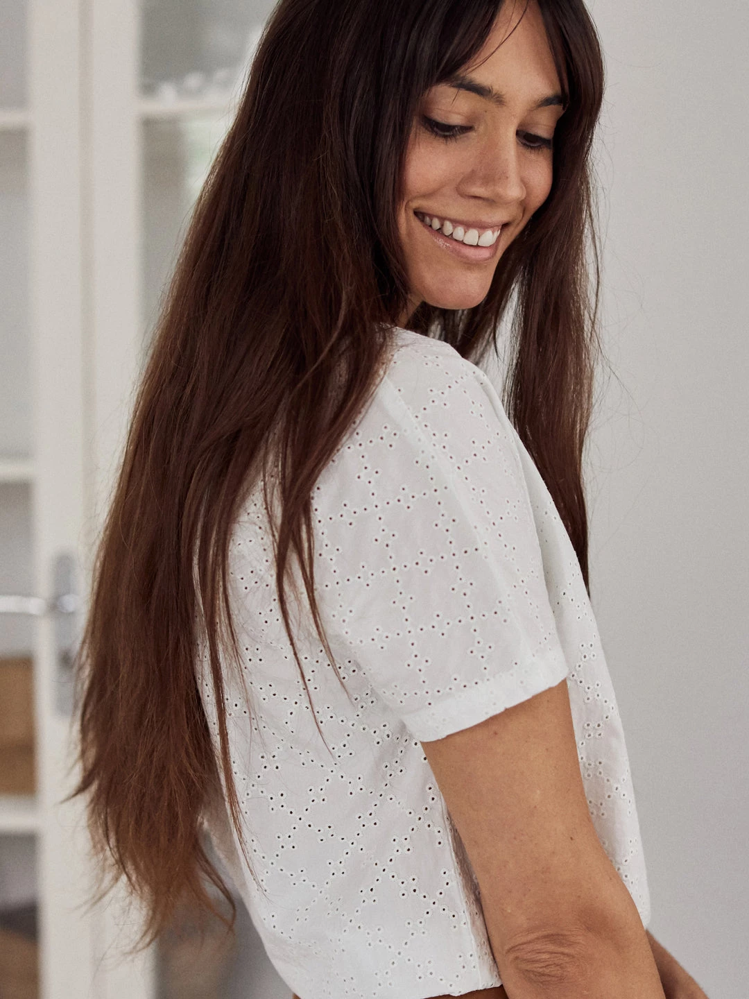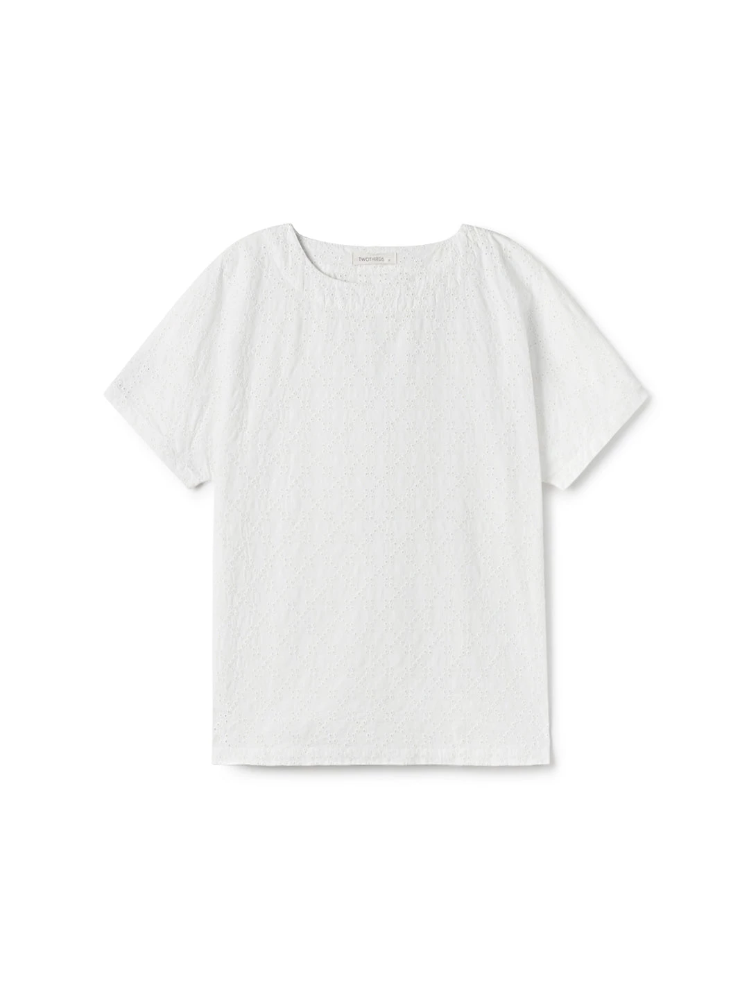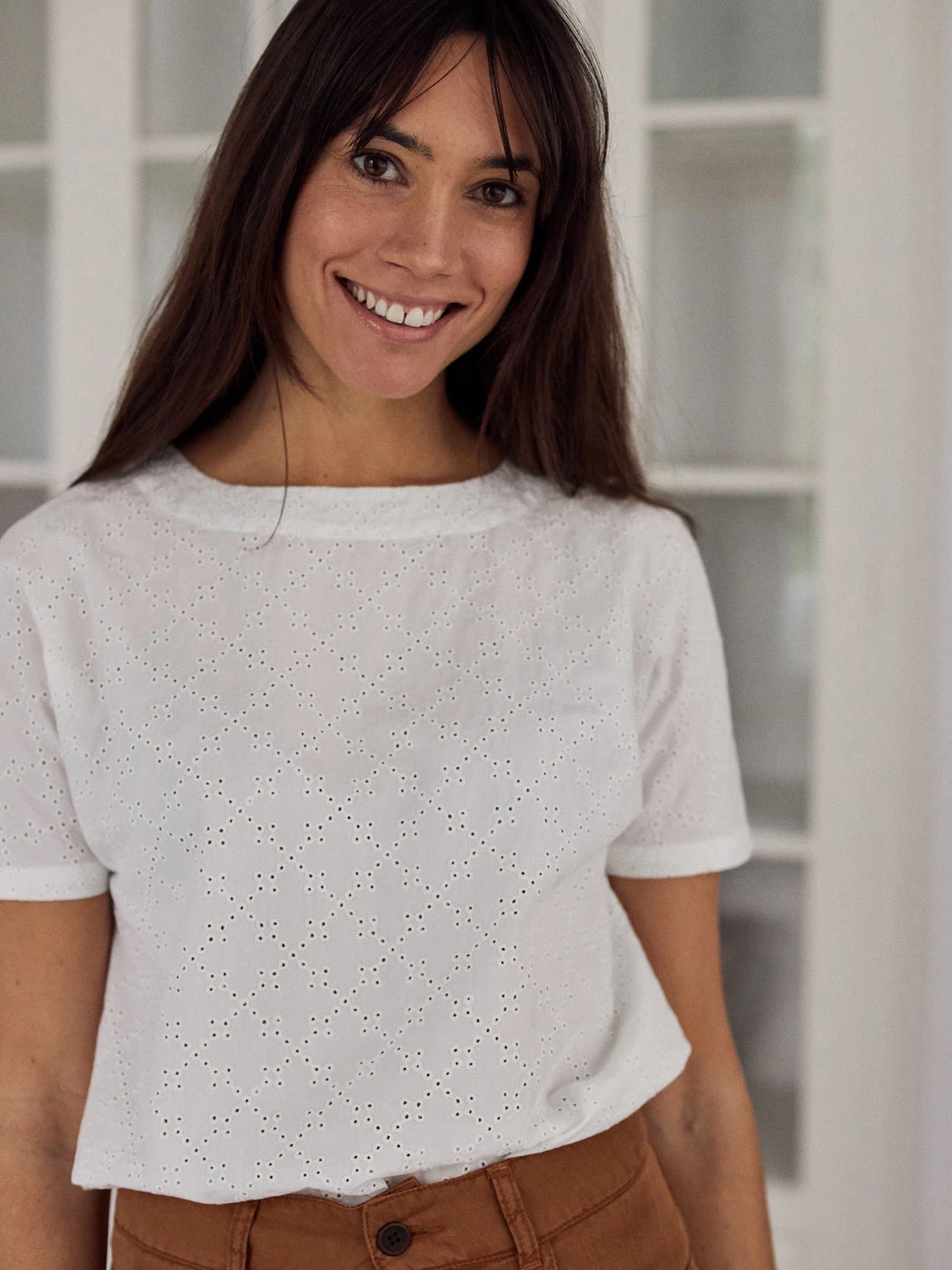 Introducing the breathable Porvenir tee. Featuring a soft fabric with swiss embroidered holes. It has a rounded neckline, a regular fit and hip-length cut.Â