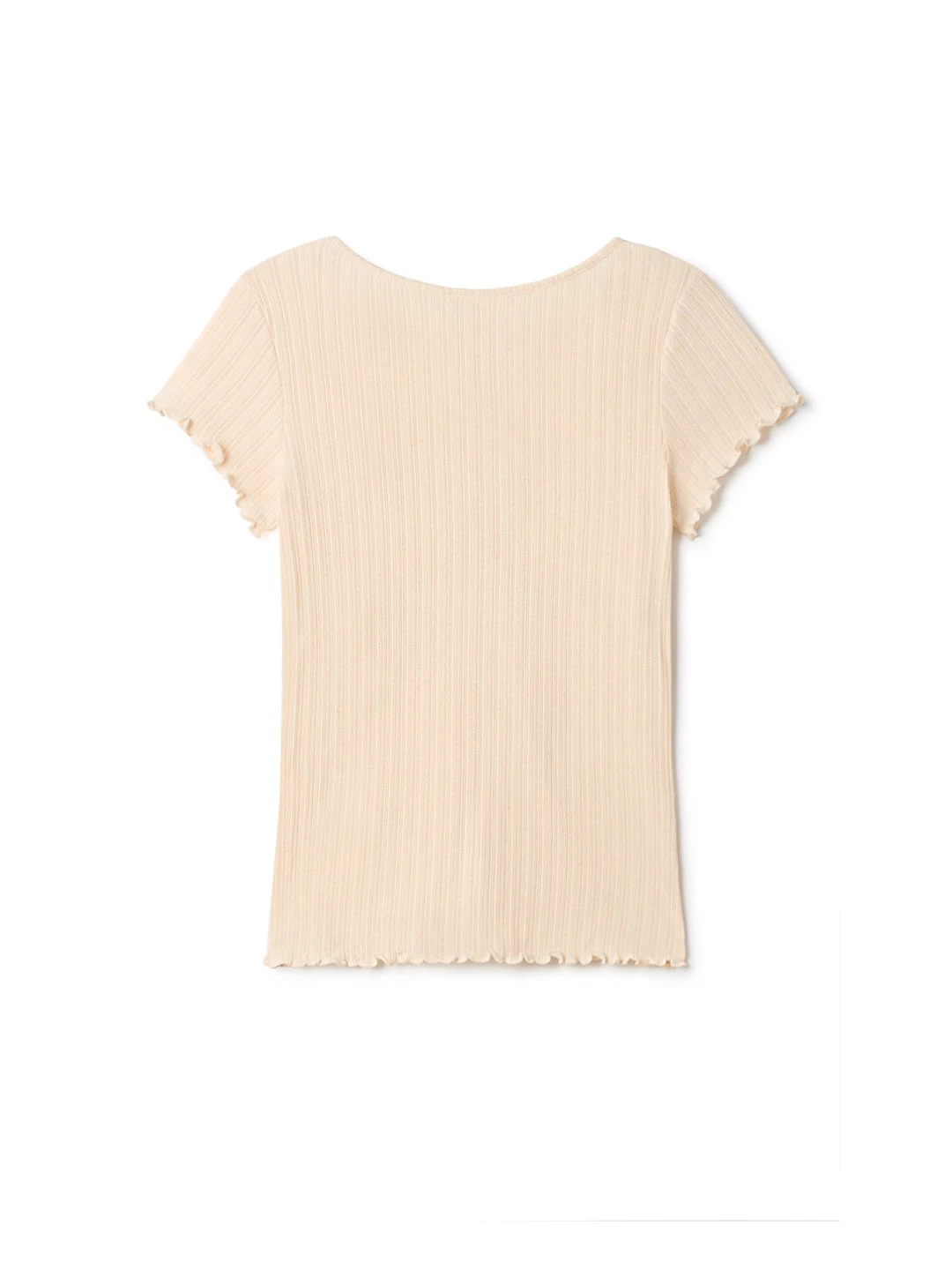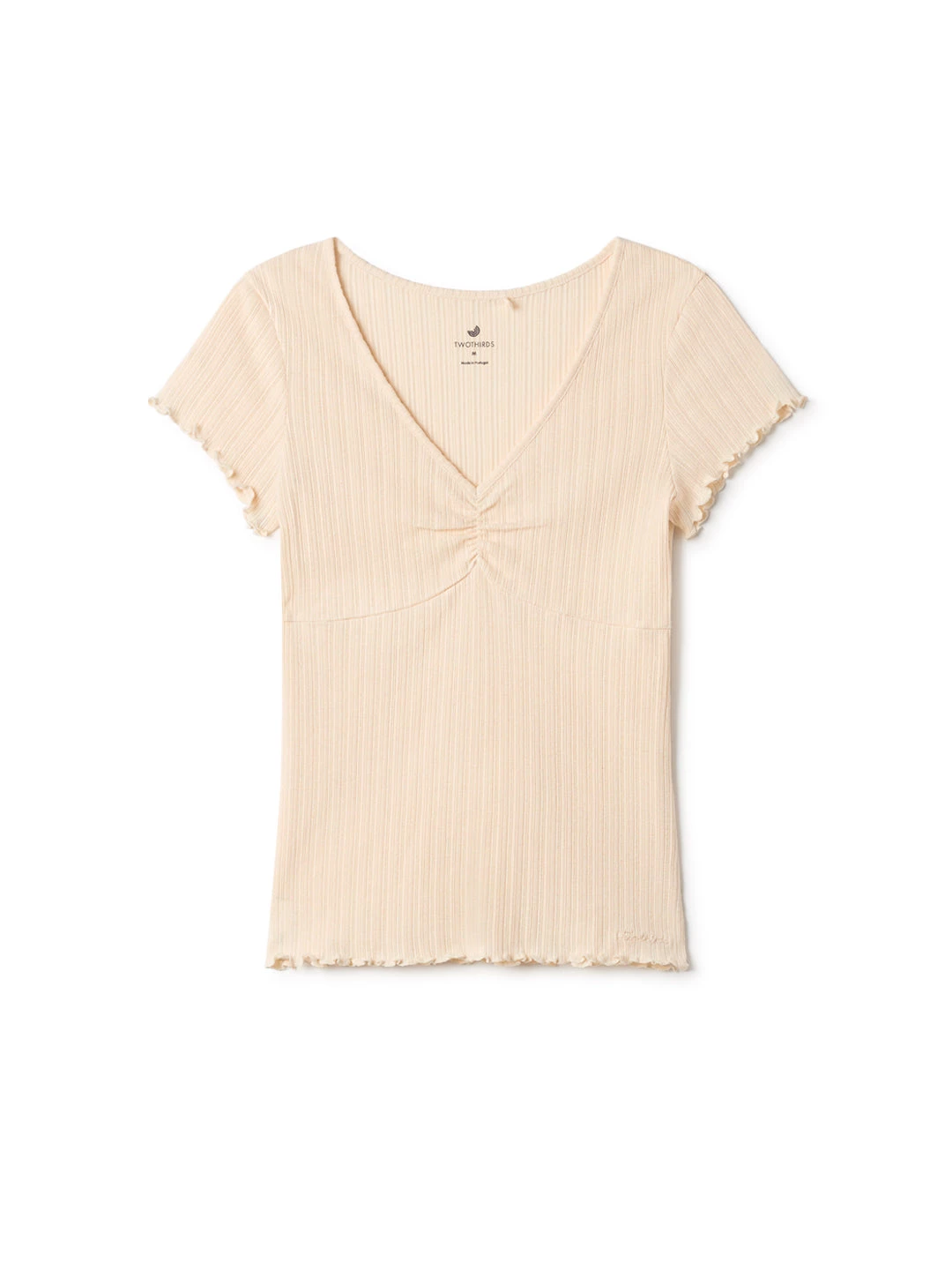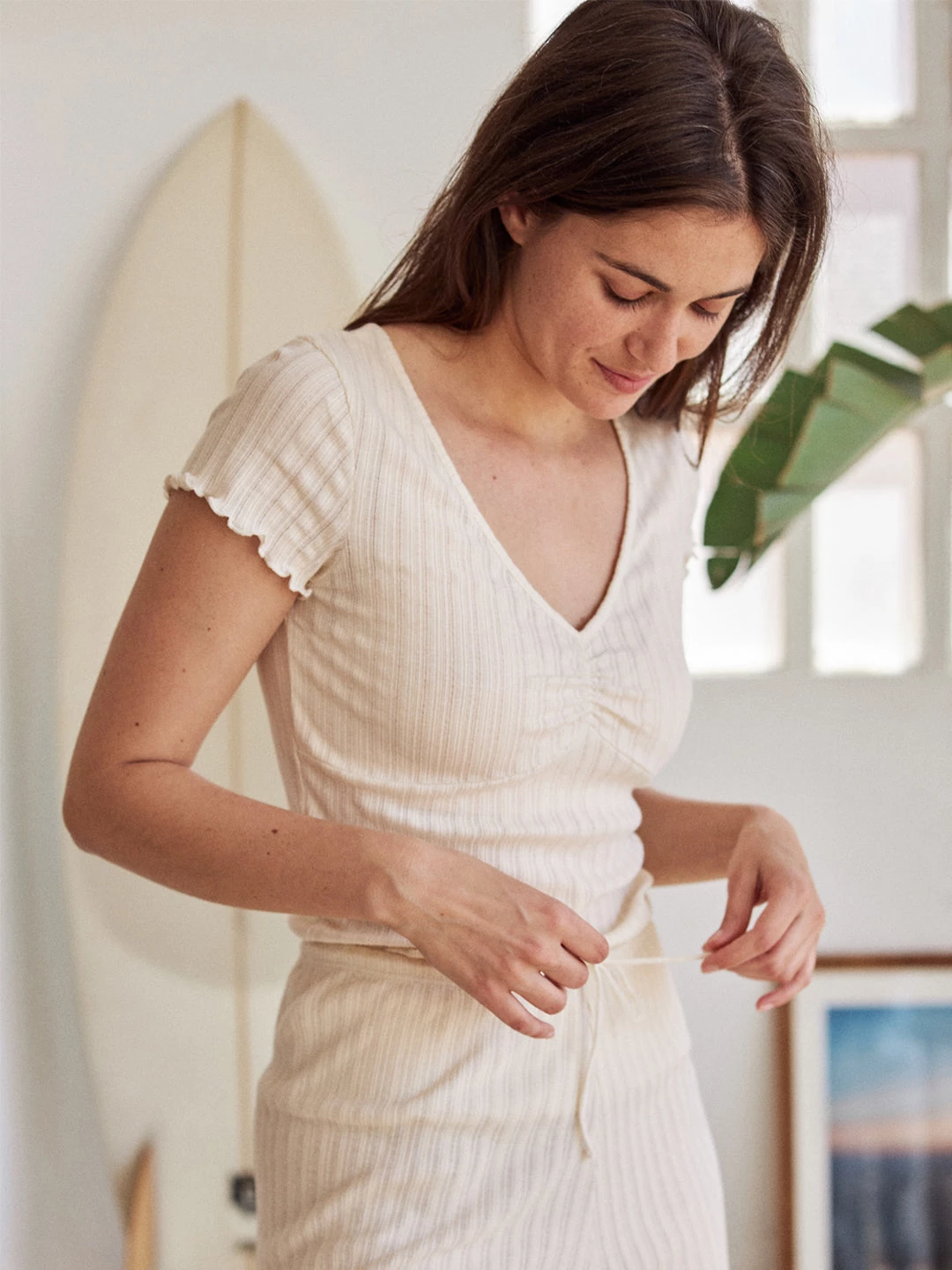 The Sandy is a beautifully soft pointelle top. Made to feel gentle and smooth, with an ecru colour, gathered chest, baby overlock edges and ‘Twothirds’ embroidered on the bottom left side.Â