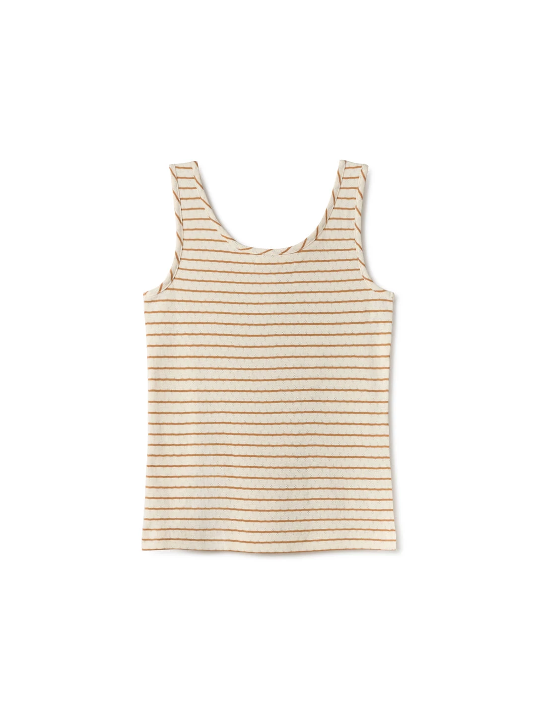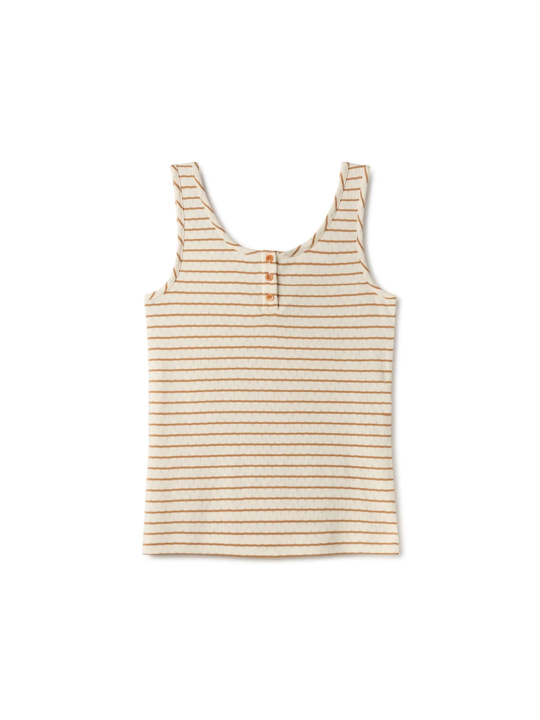 A beautiful striped top: the Voksa. The sleeveless tee is designed with naturally sourced corozo buttons on the neck. It comes in a regular fit, hip-length cut and all-organic fabric.