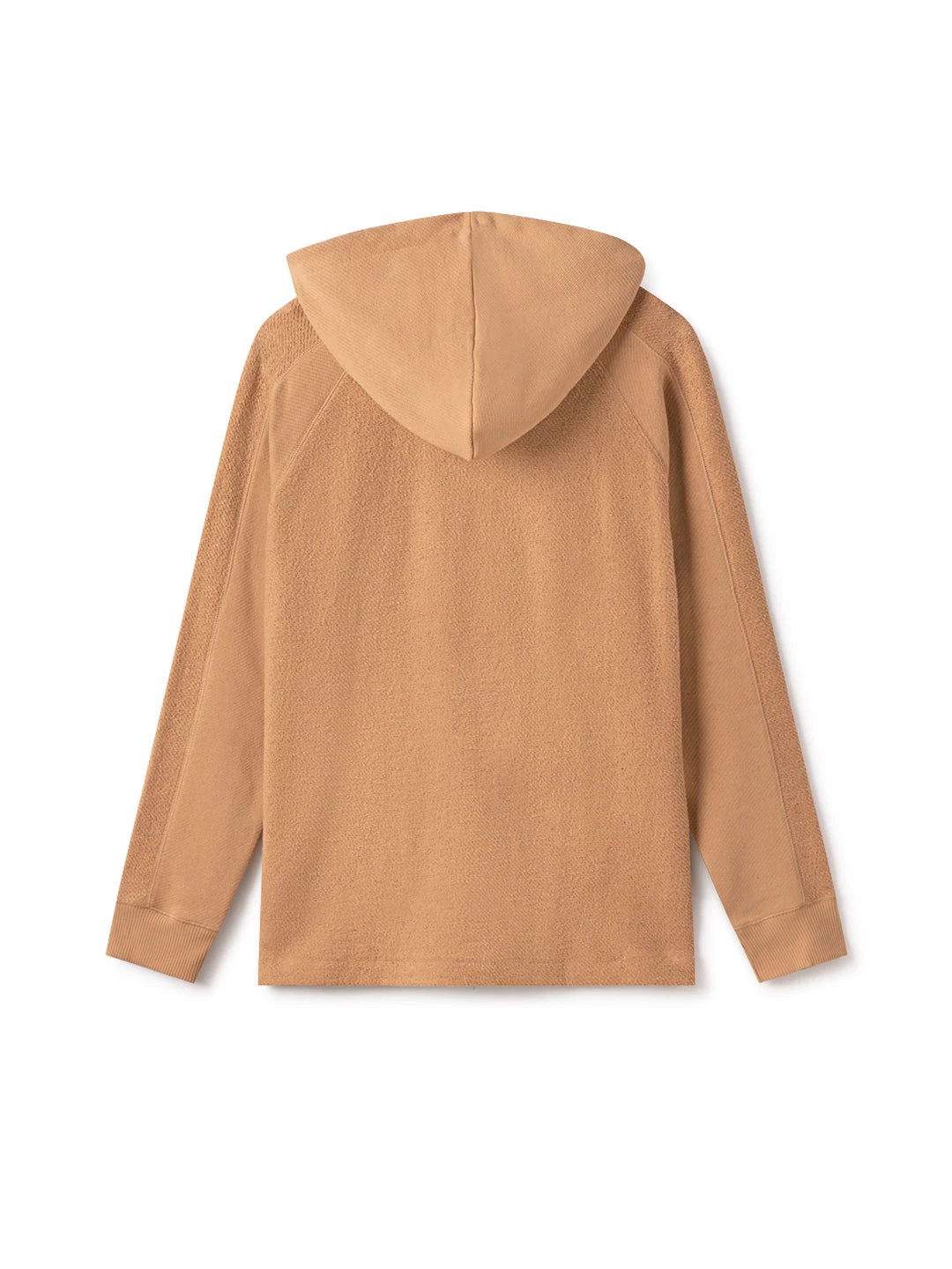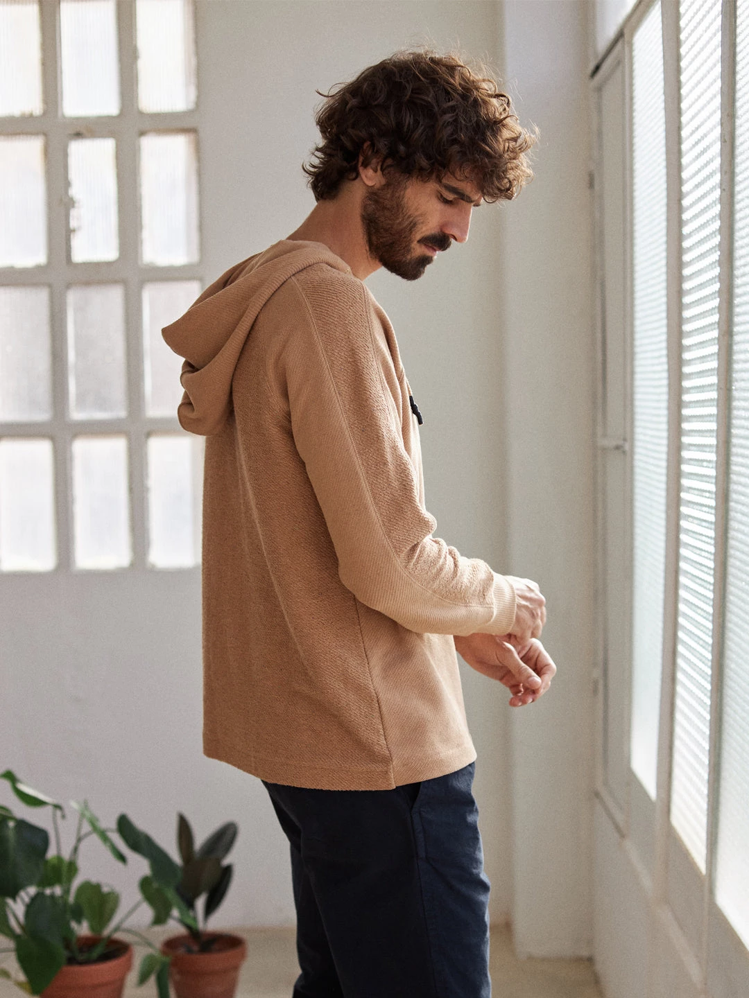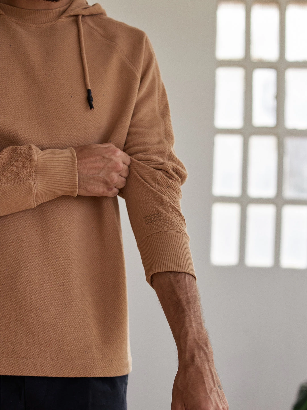 A sustainable basic for your wardrobe, the Niulakita sweatshirt. To give it a unique twist, the fabric is inside out on the top of the sleeves and back. Also designed with a beautiful nepped effect. The hoodie comes with ribbed edges, wave detailing on the left wrist and a regular fit. Â