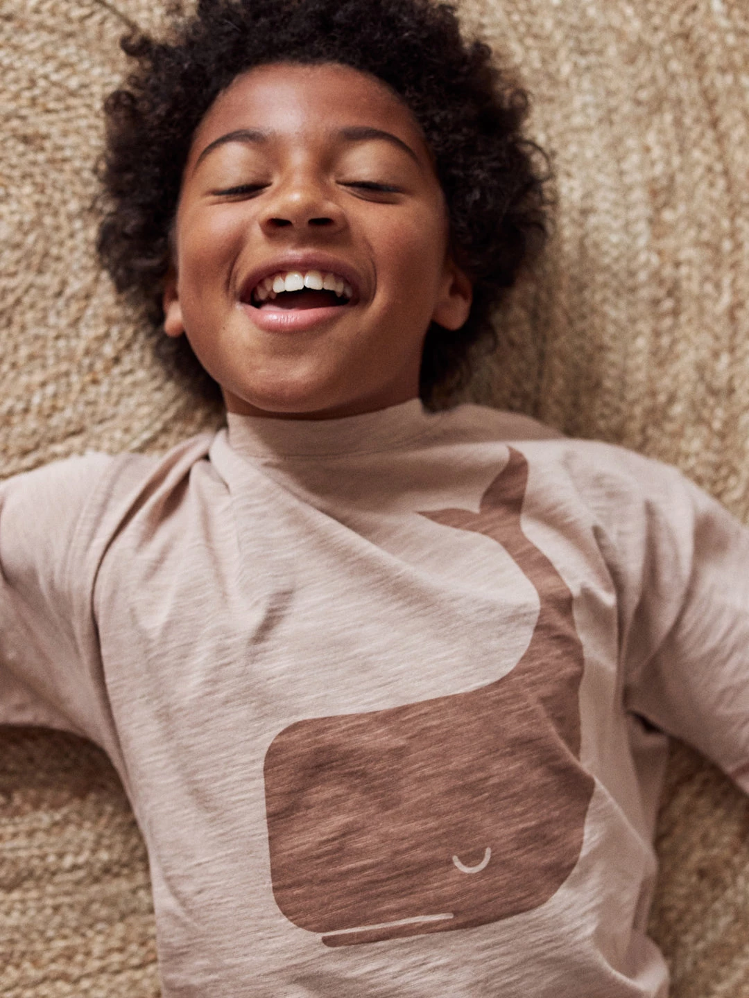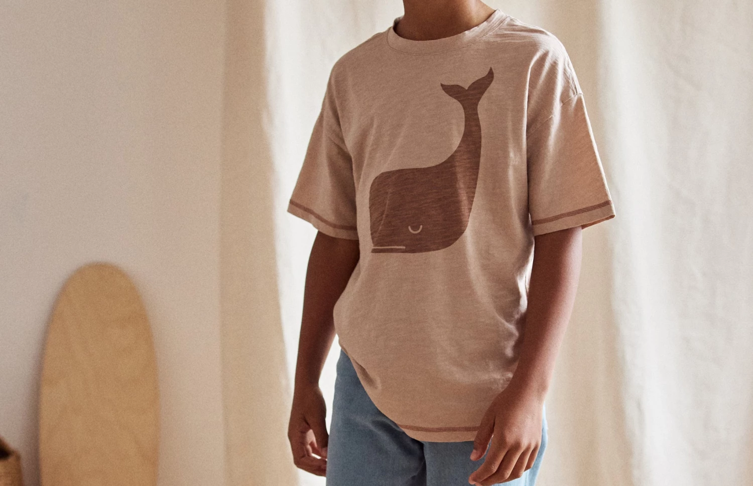 Whale ahead! Choose your favourite colour for the Orzán tee and matching whale print. A t-shirt everyone will love, designed in a soft organic fabric and contrasting hem colours on the sleeves and bottom.