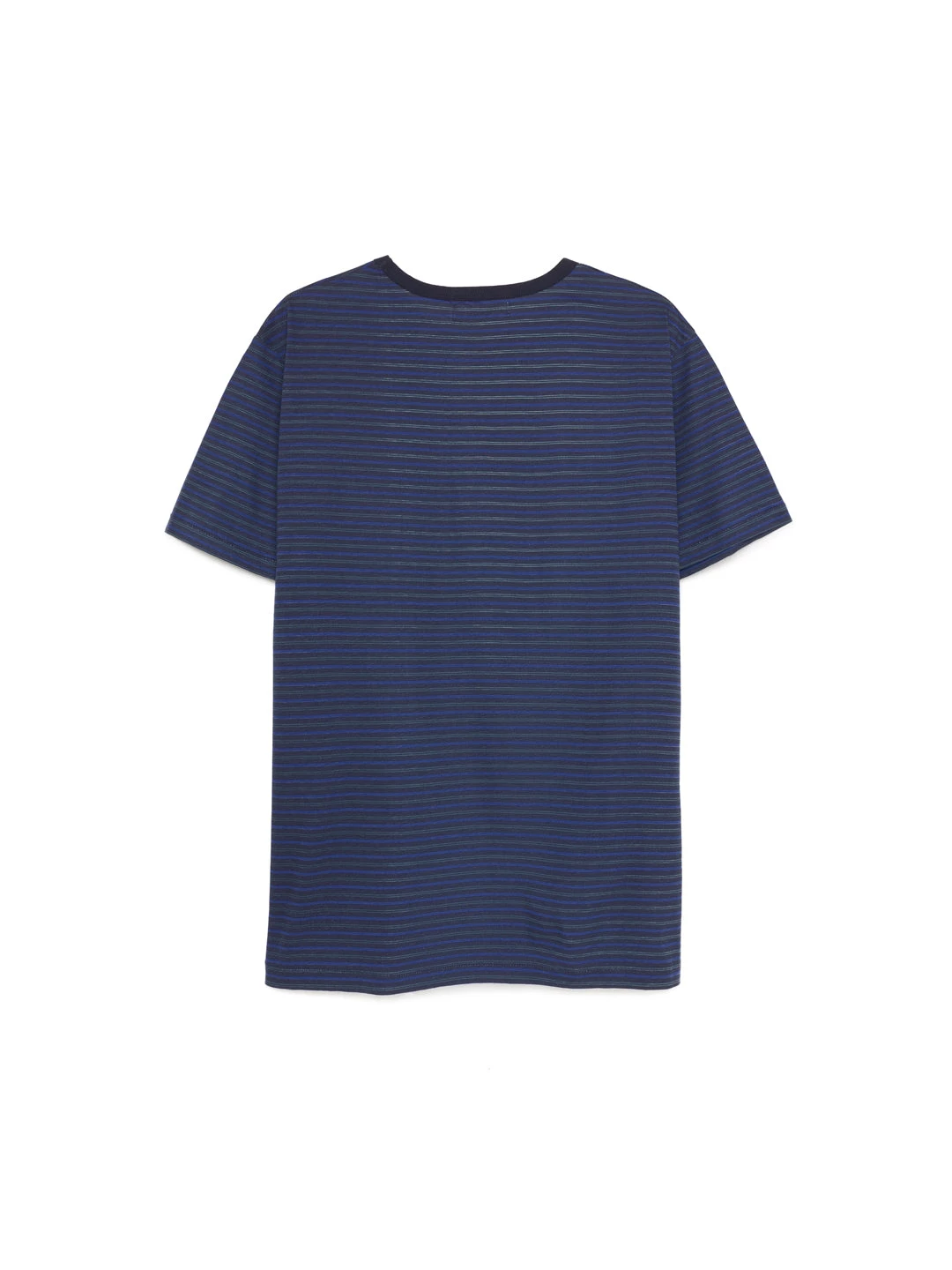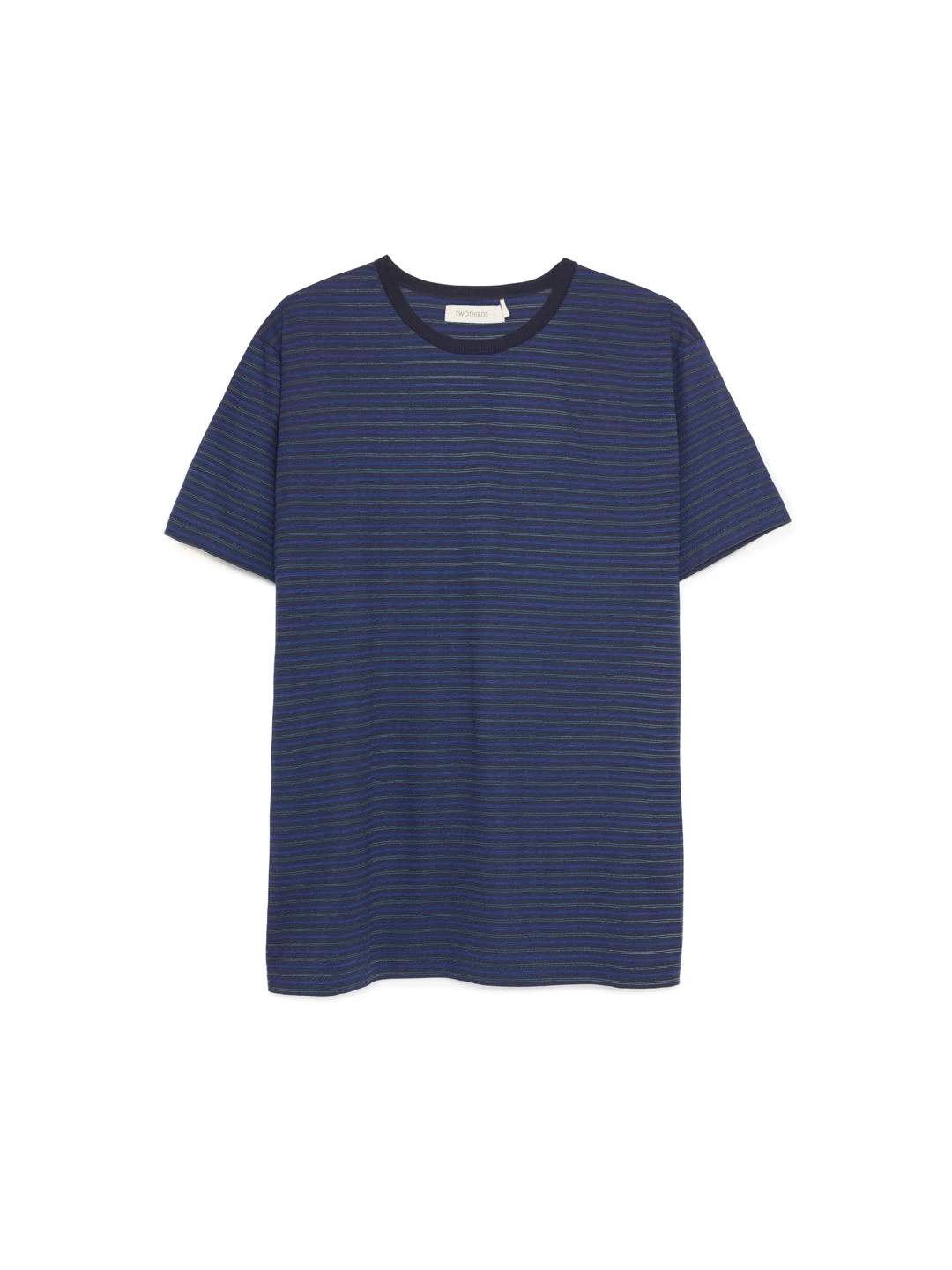 A maritime t-shirt, the Palmyra. With different blue tone stripes all over to reflect the colours of the ocean. The tee has our logo embroidered on its left sleeve and a small triangular label attached to the bottom left side. It comes in a regular fit and hip-length cut.Â