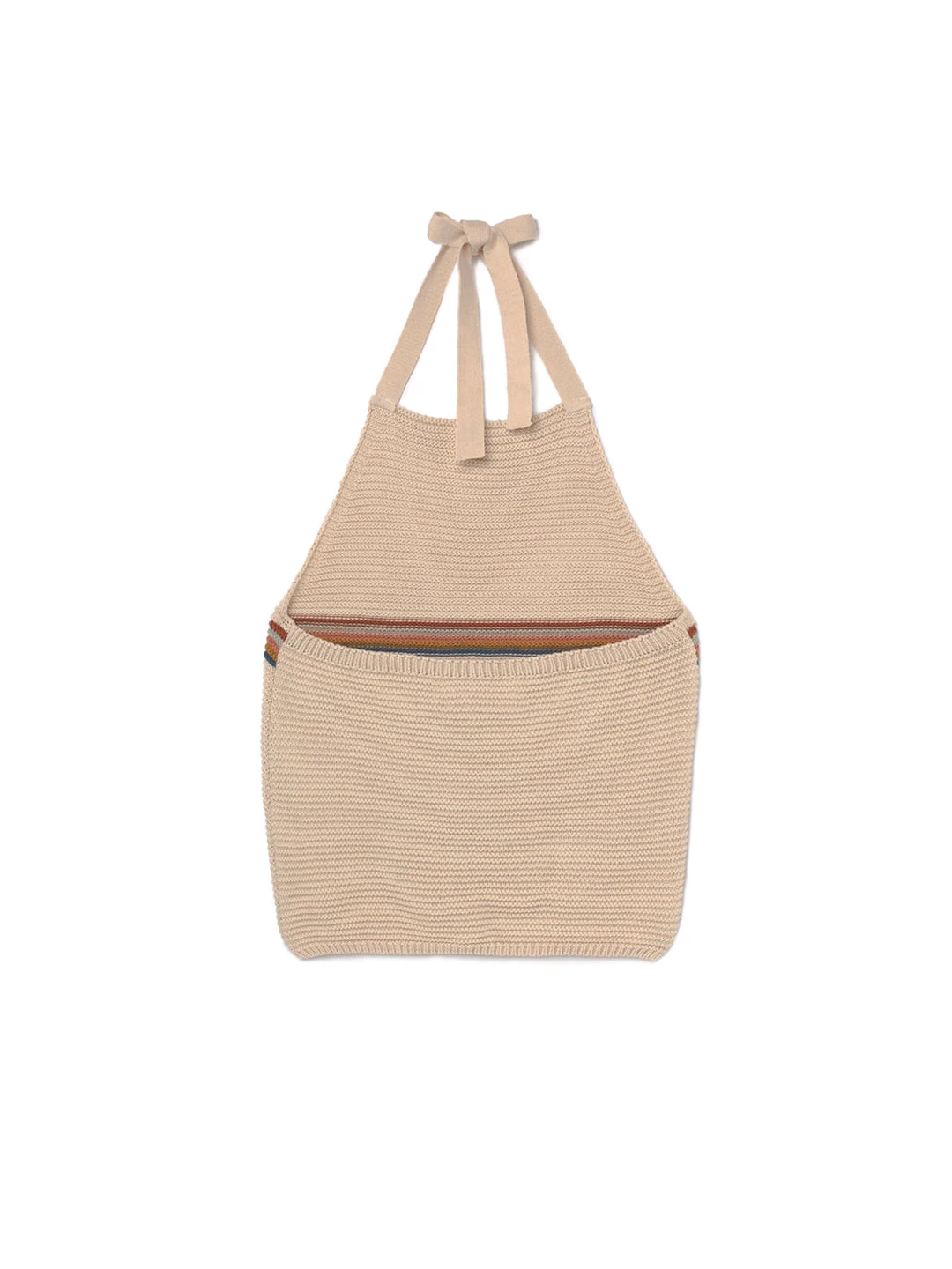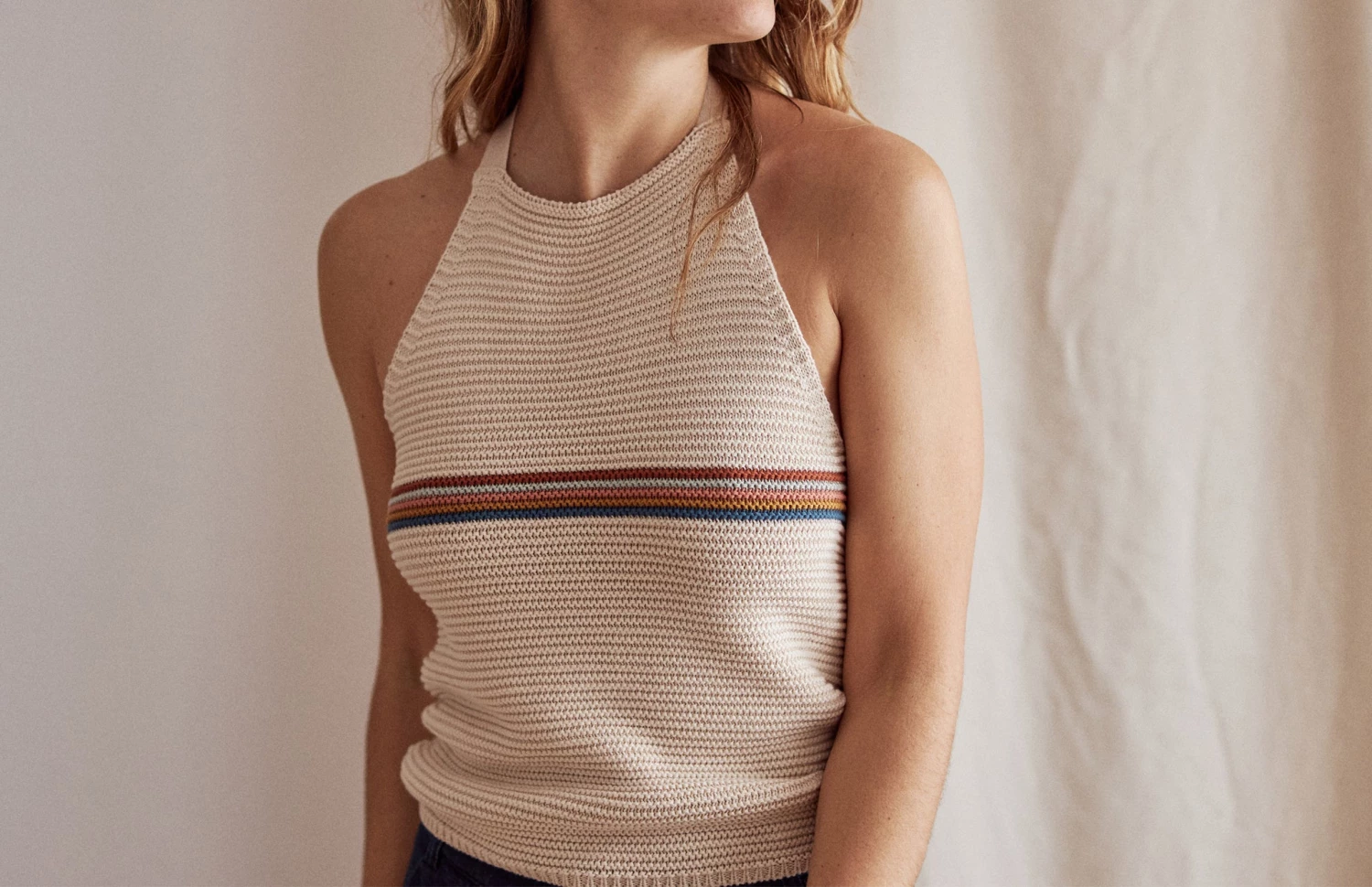 A feminine knit crafted with nostalgia for summer nights. Designed with an open back, ribbed bottom and back strap with a lace to knot on the nape – featuring contrasting stripes on the front.Â