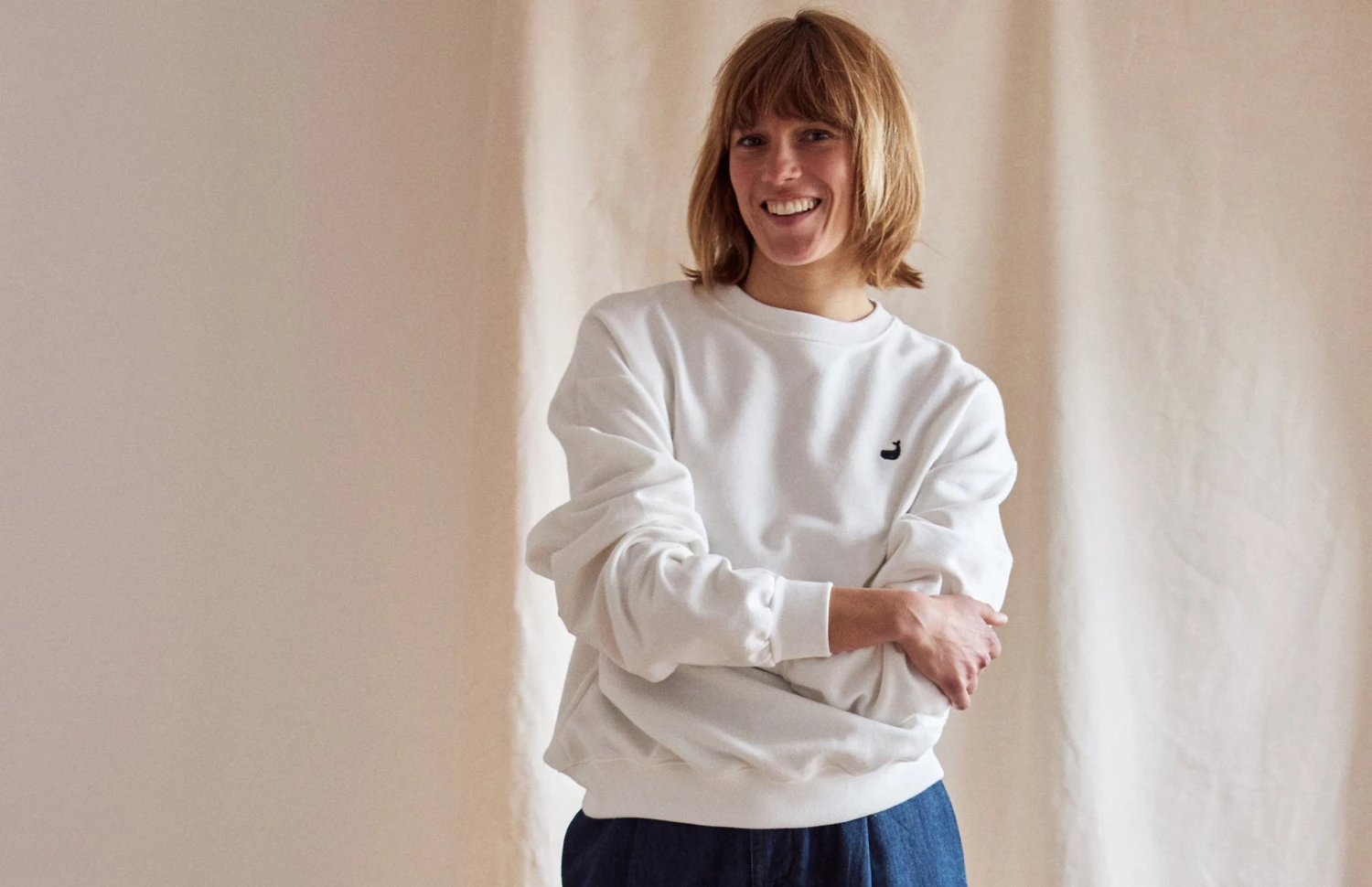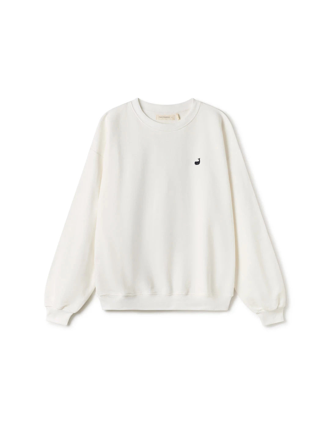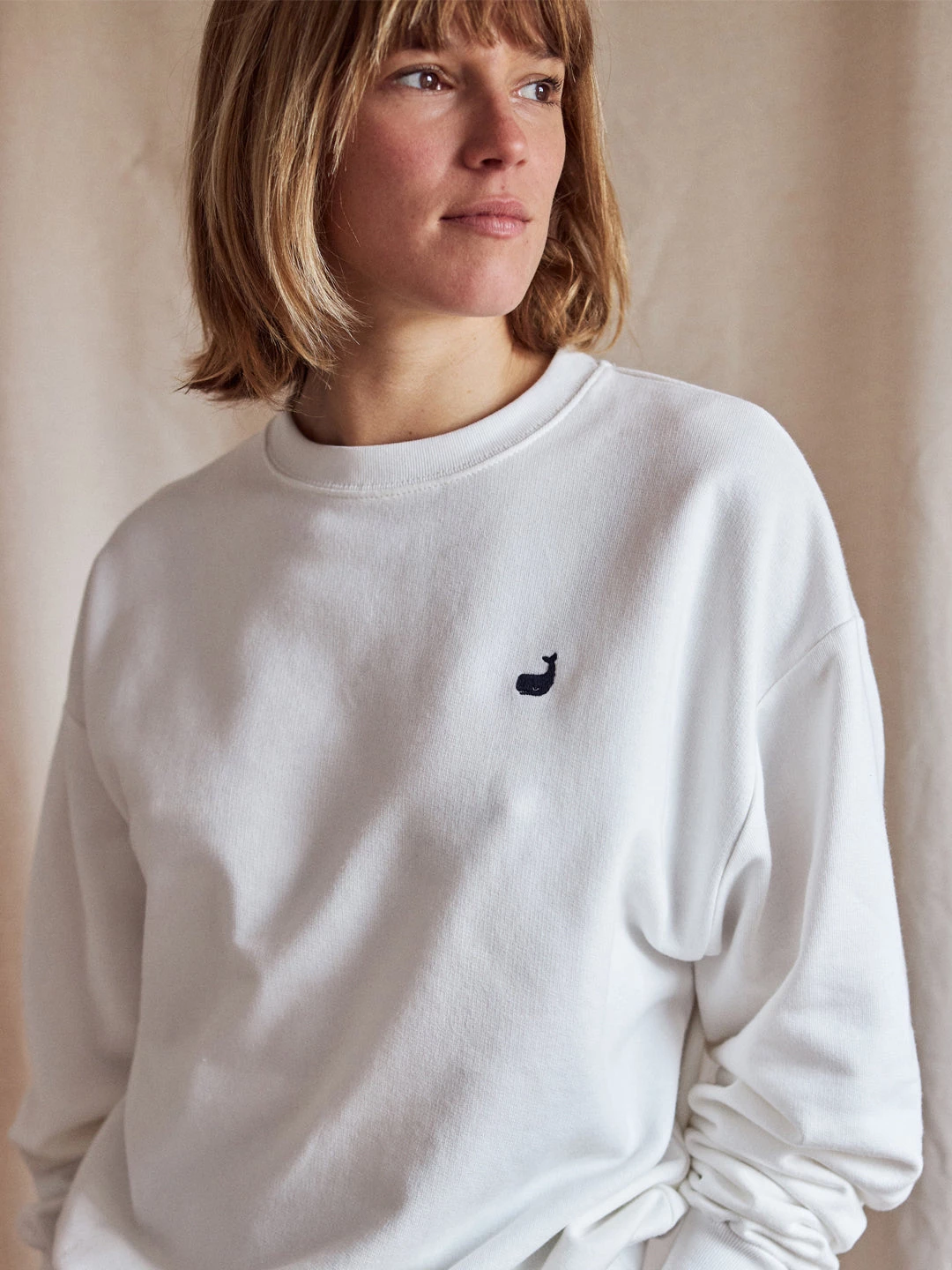 The sweat is finished with whale embroidery. It has a fairly oversized fit and hip-length cut.
