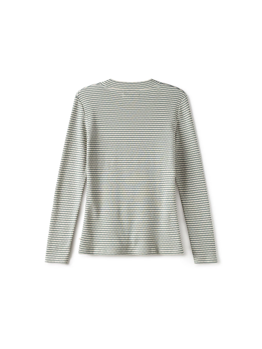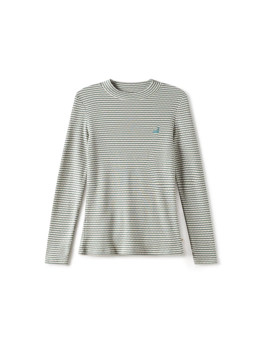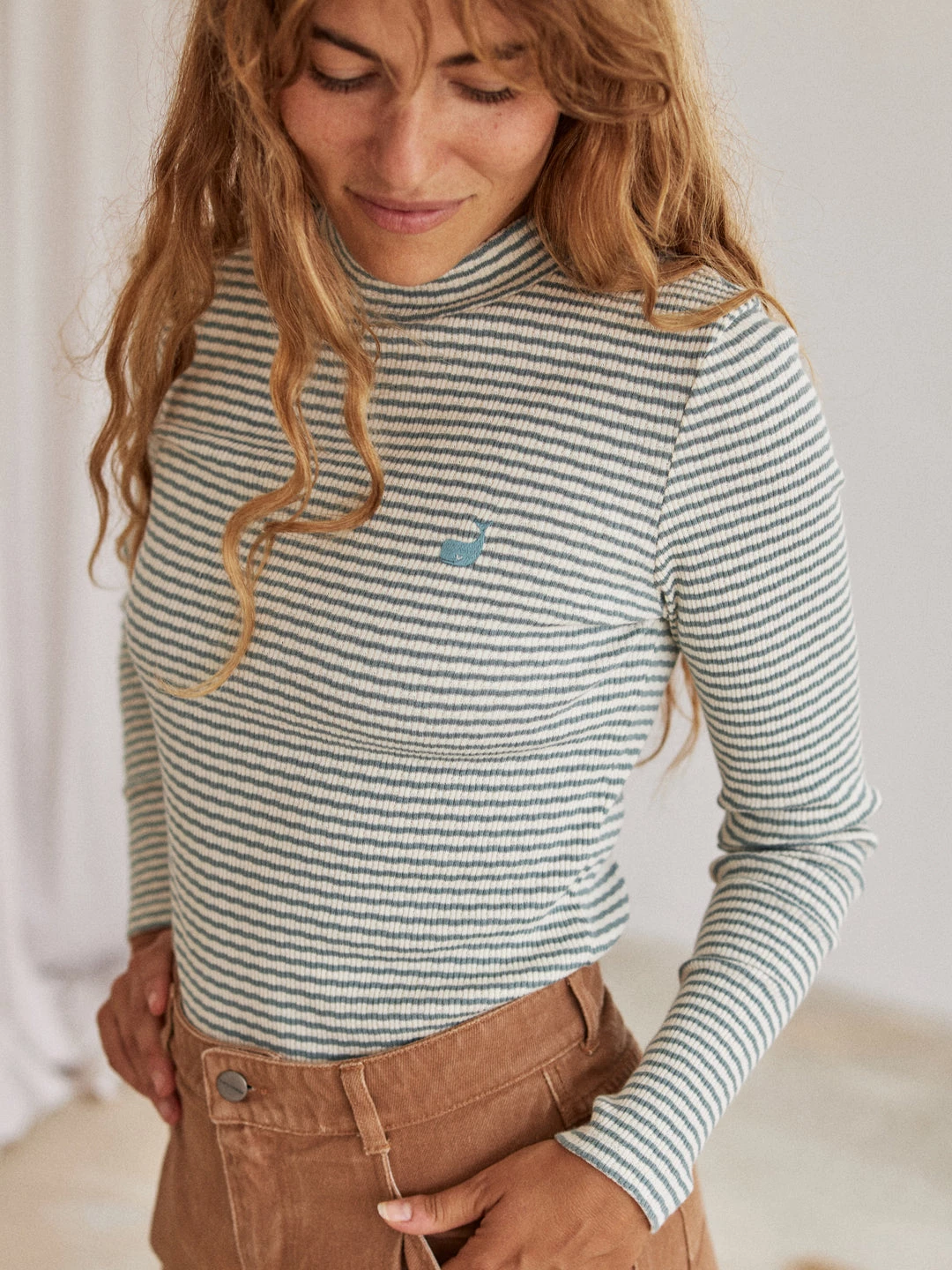 Beautiful stripes on a sumptuously soft fabric: the Ramadas tee. Made with a high ribbed neckline and slim fit to hug the body and give you a nice cosy feeling. The top also features whale embroidery on the chest.