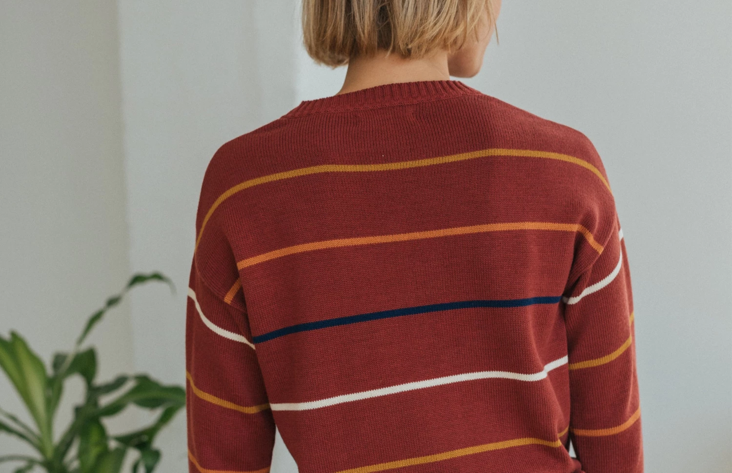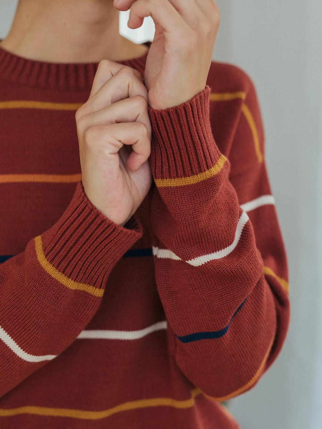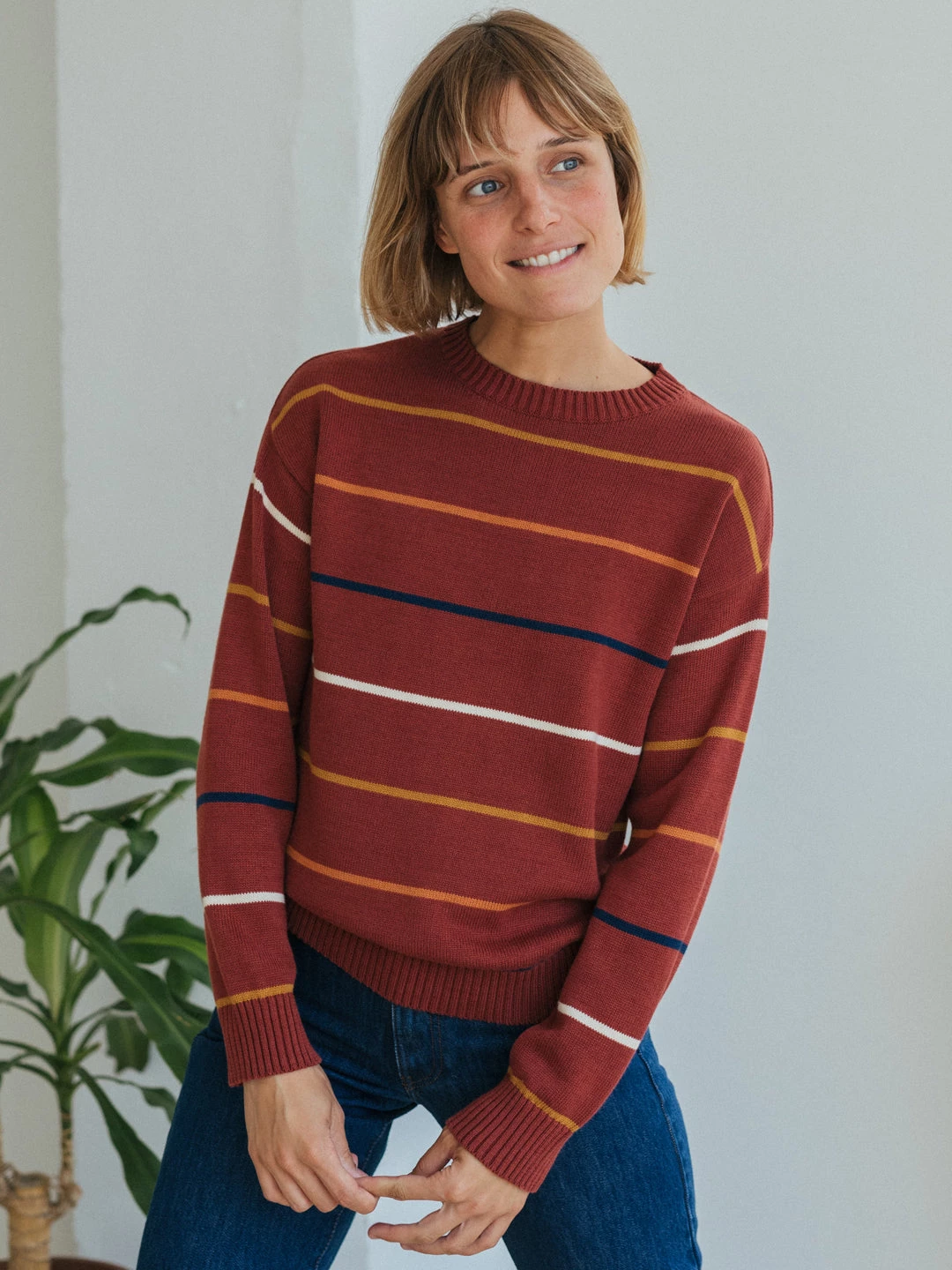 Here at TWOTHIRDS we love a classic striped jumper, hence the Ranfurly. Designed in a soft and gentle fabric and contrasting colours. The knit has ribbed edges, a regular fit and falls around the hips.