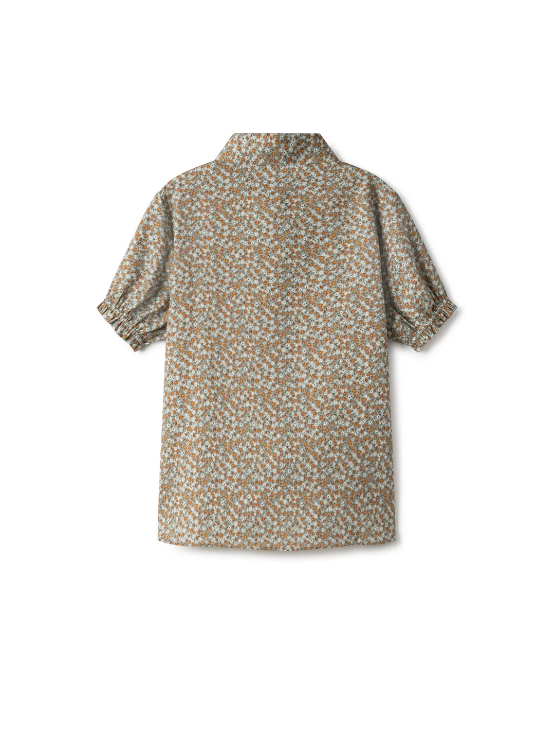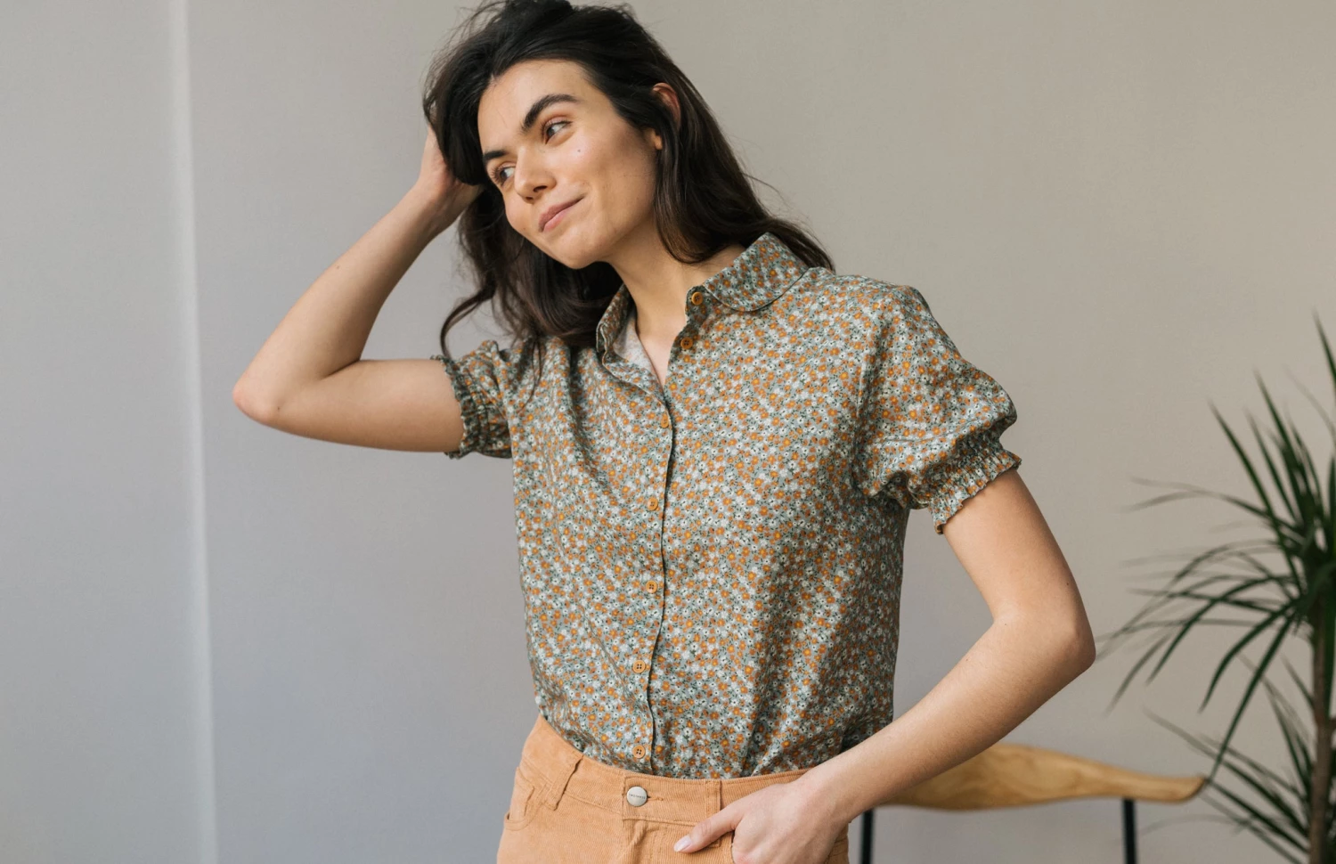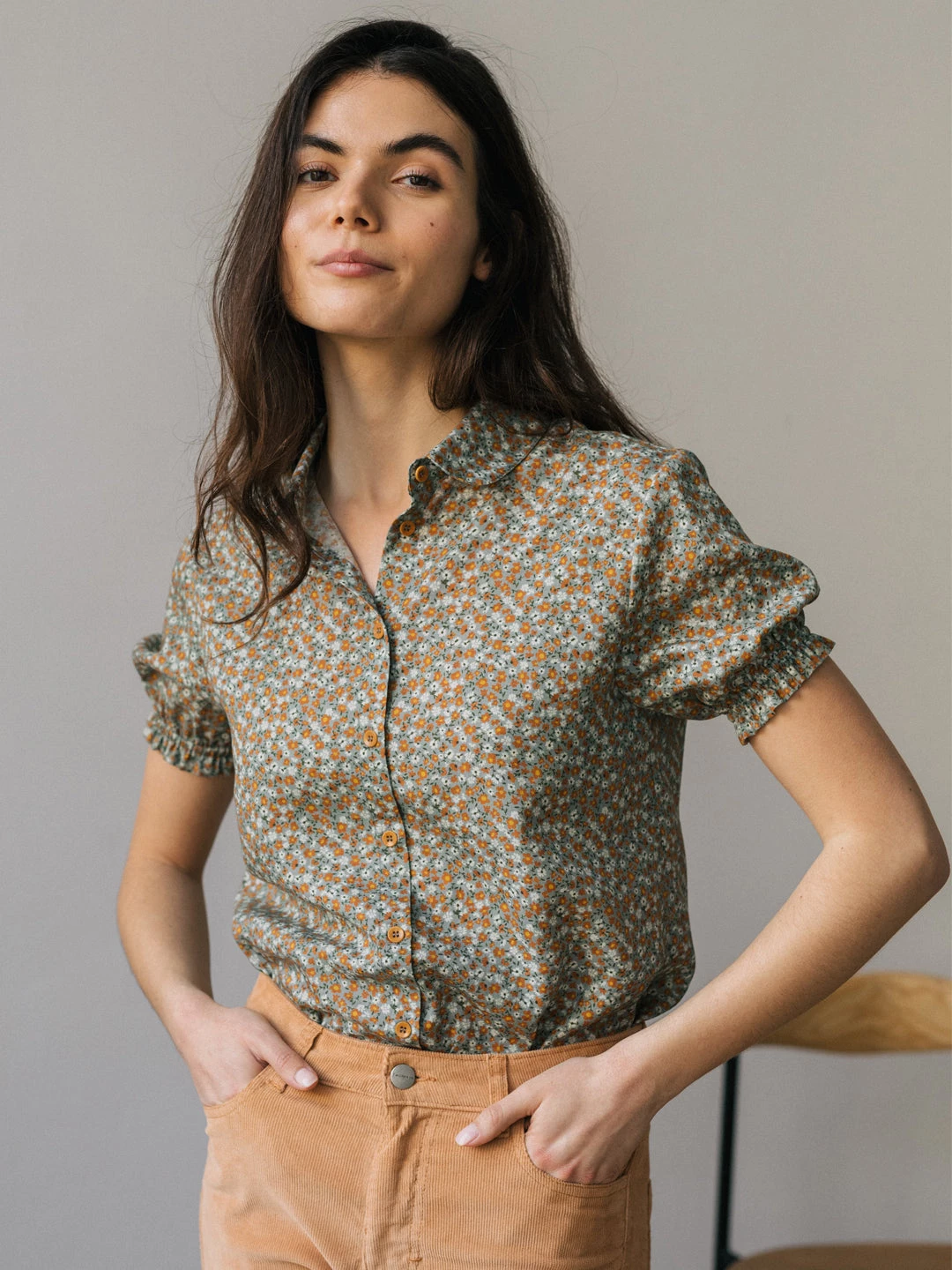 Warmer weather is ahead, and so we decided to bring this floral print shirt to match the sun. Designed with naturally sourced corozo buttons and balloon sleeves with an elastic gathering at the end for a feminine touch! It comes in a regular fit and hip-length cut.Â